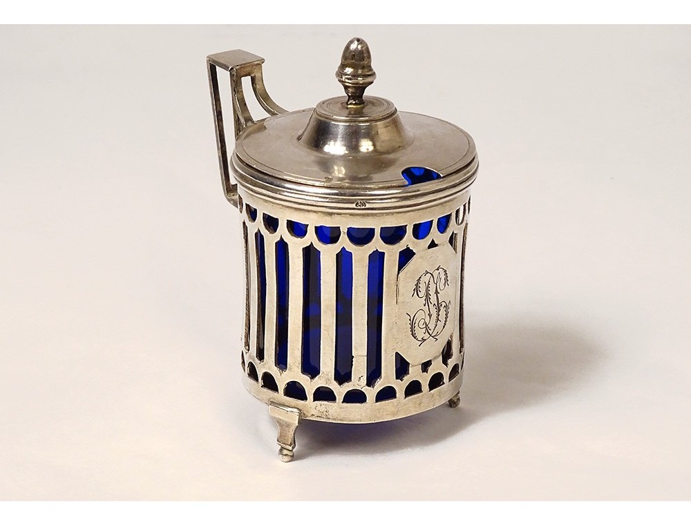 Louis XVI mustard pot in solid silver finely iselé and openwork, body adorned with a monogram, hallmarked with the Fermiers Généraux de Paris (Maison Commune, 1789) and goldsmith JLAG for Jacques Louis Auguste Leguay * discharge hallmark (leaf), period late 18th century.