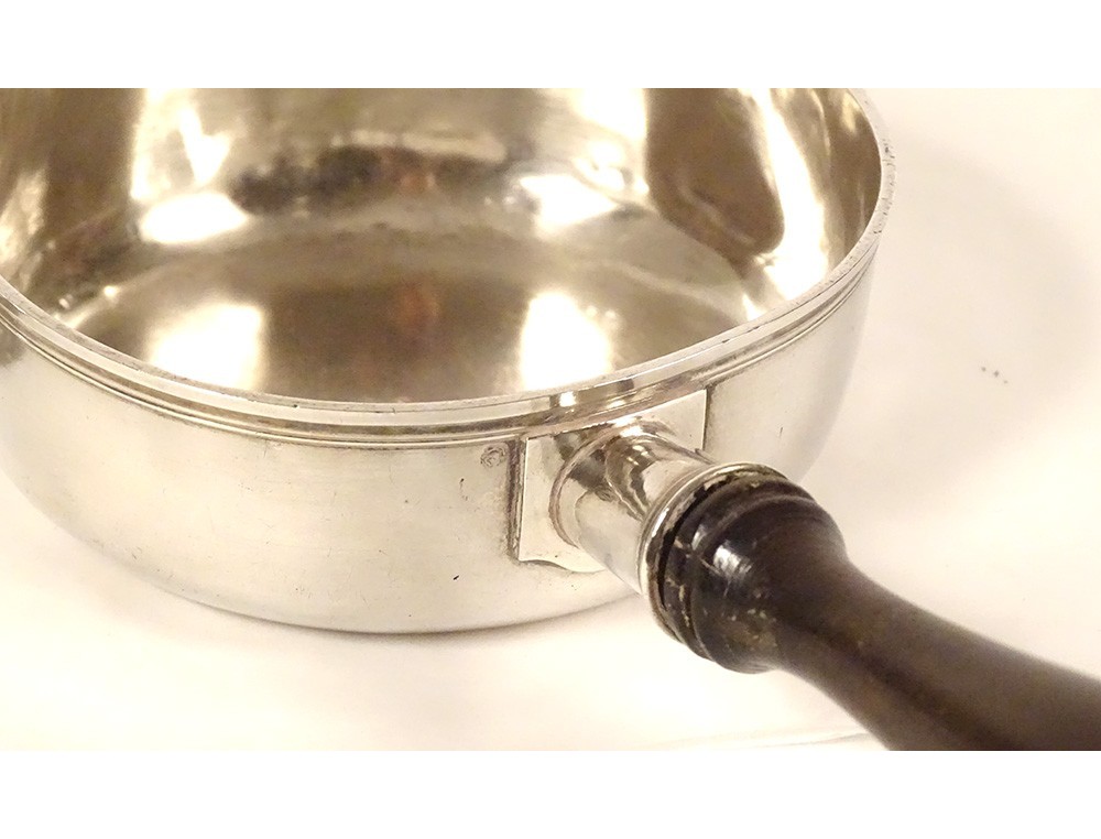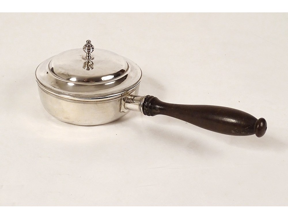 Casserole and its lid in solid silver hallmarked with the Fermiers Généraux de Paris (Paris Généralité Gros Ouvrage hallmark 1780/81 and hallmark of the commune house 1781), lid decorated with a small spinning top for grip, blackened wooden handle, vintage late 18th century.