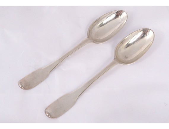 Pair of spoons in silver punched in Vannes Farmers General, the silversmith Benjamin Clerc (1734-1774), engraved "Arz Ptre FJ" on the handle, from Morbihan, antique eighteenth century.