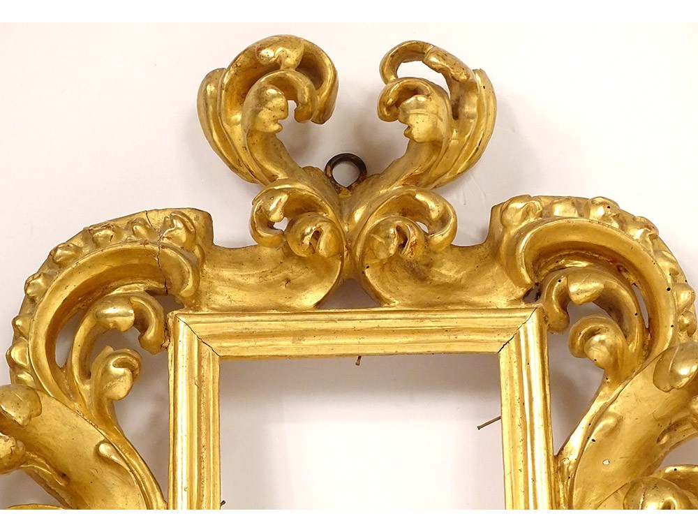 Italian frame in carved gilded wood, with rococo decoration of large volutes of foliage, from the 18th century.