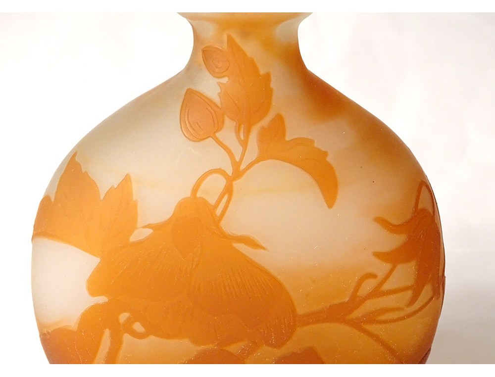 Gourd-shaped vase in glass paste with rounded body and flattened sides, flared diamond-shaped neck, signed Gallé *, decorated in orange color cleared with acid flowers of bindweed hedges, Art Nouveau period late nineteenth-early XXth centuries.