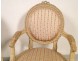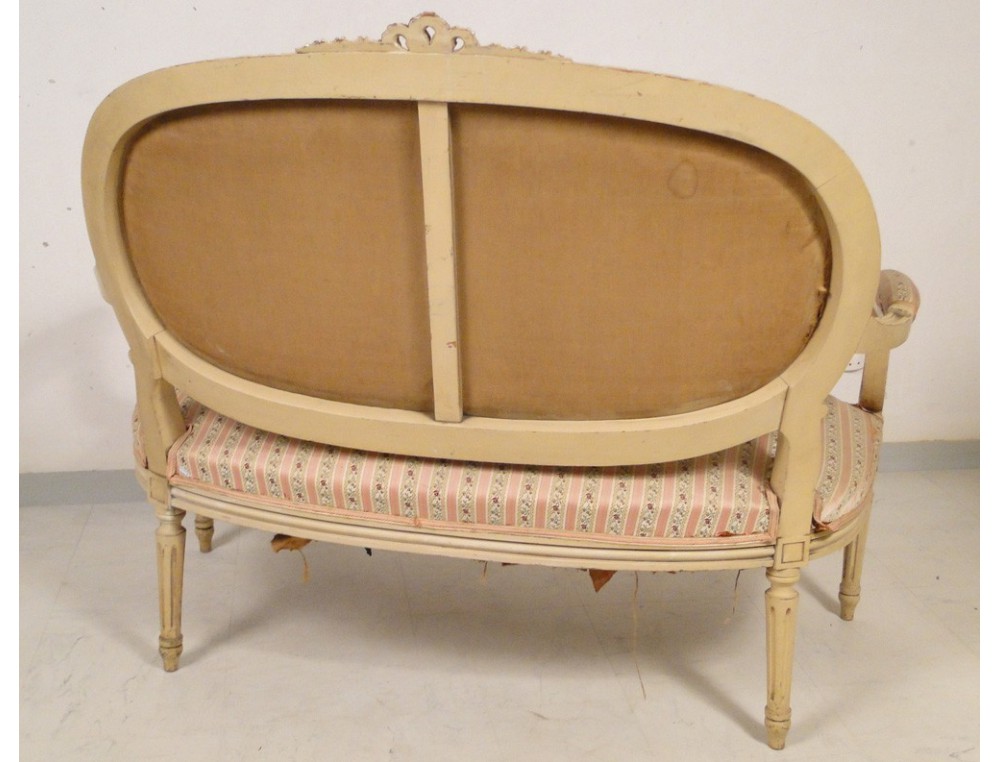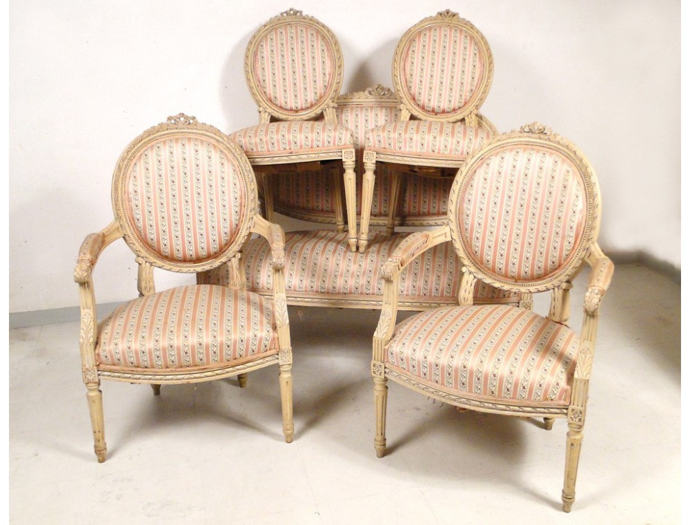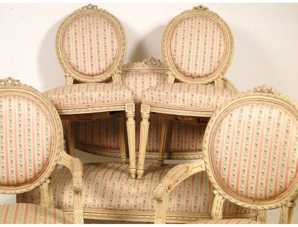 Superb Louis XVI salon includes a 2-seater, two armchairs and two chairs, lacquered wood decorated with intricately carved acanthus leaves of fleuro, s and nodes, fluted legs, upholstery fabric, Napoleon III nineteenth century.