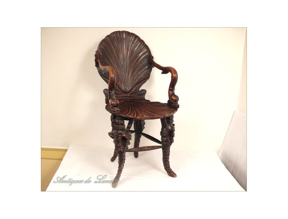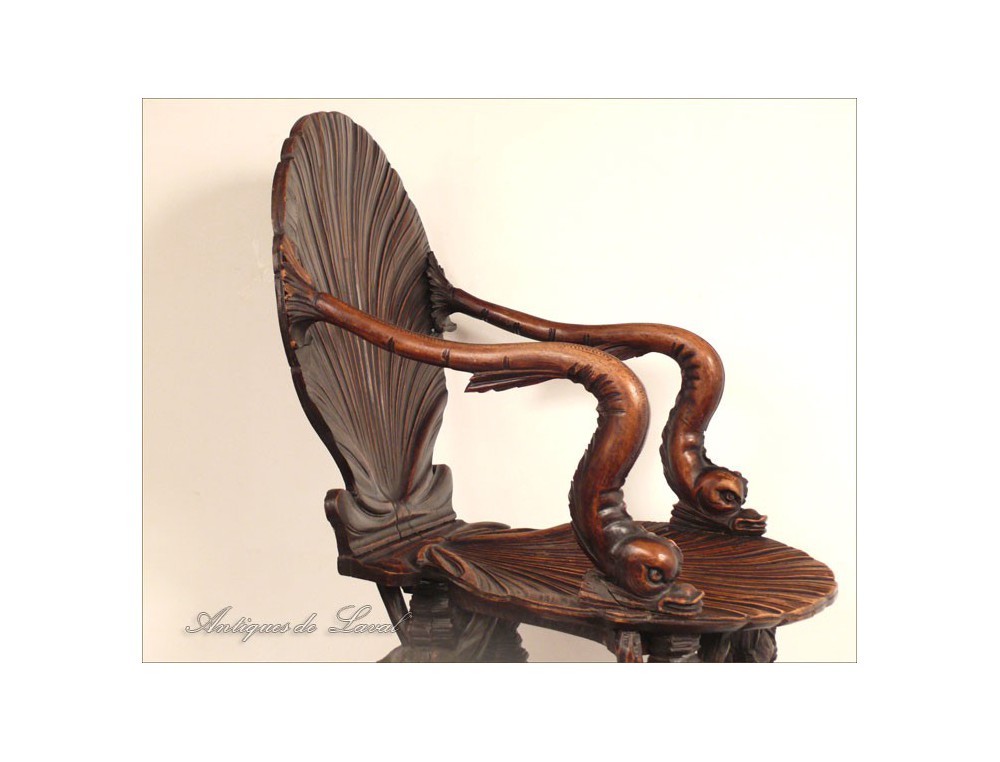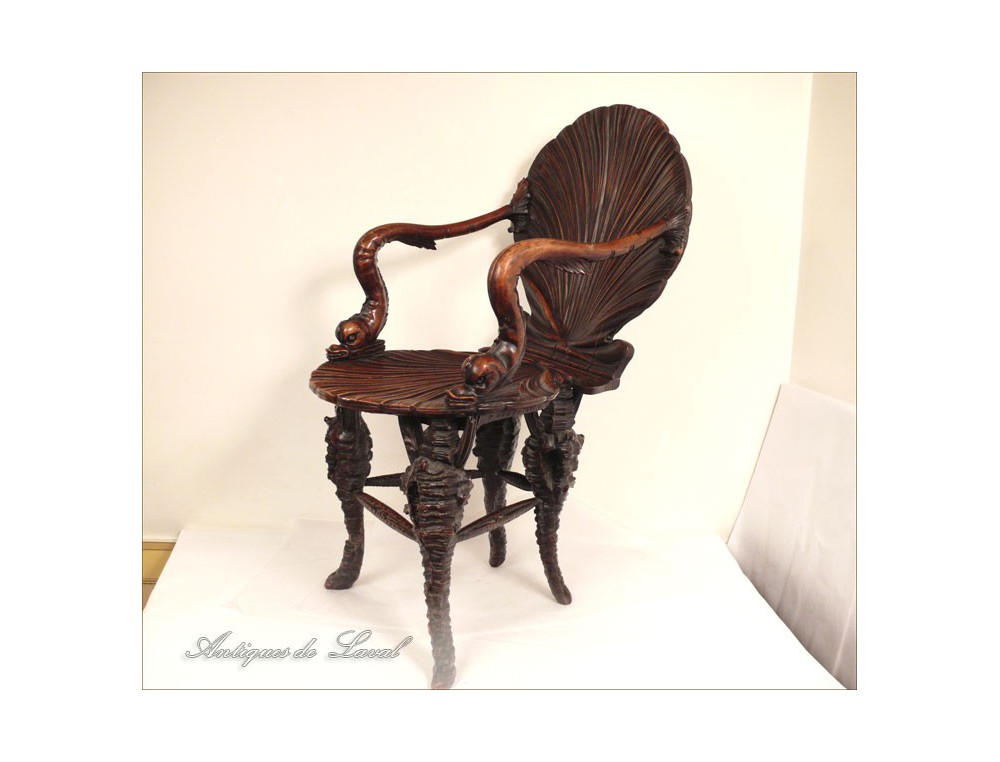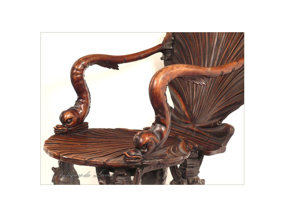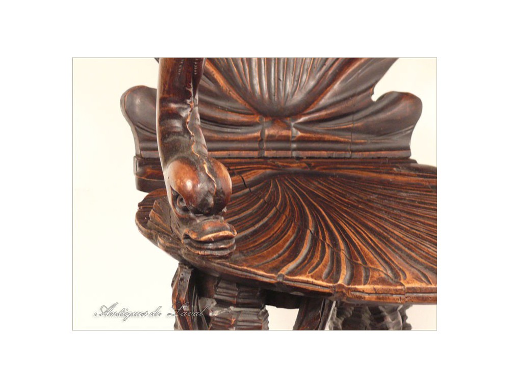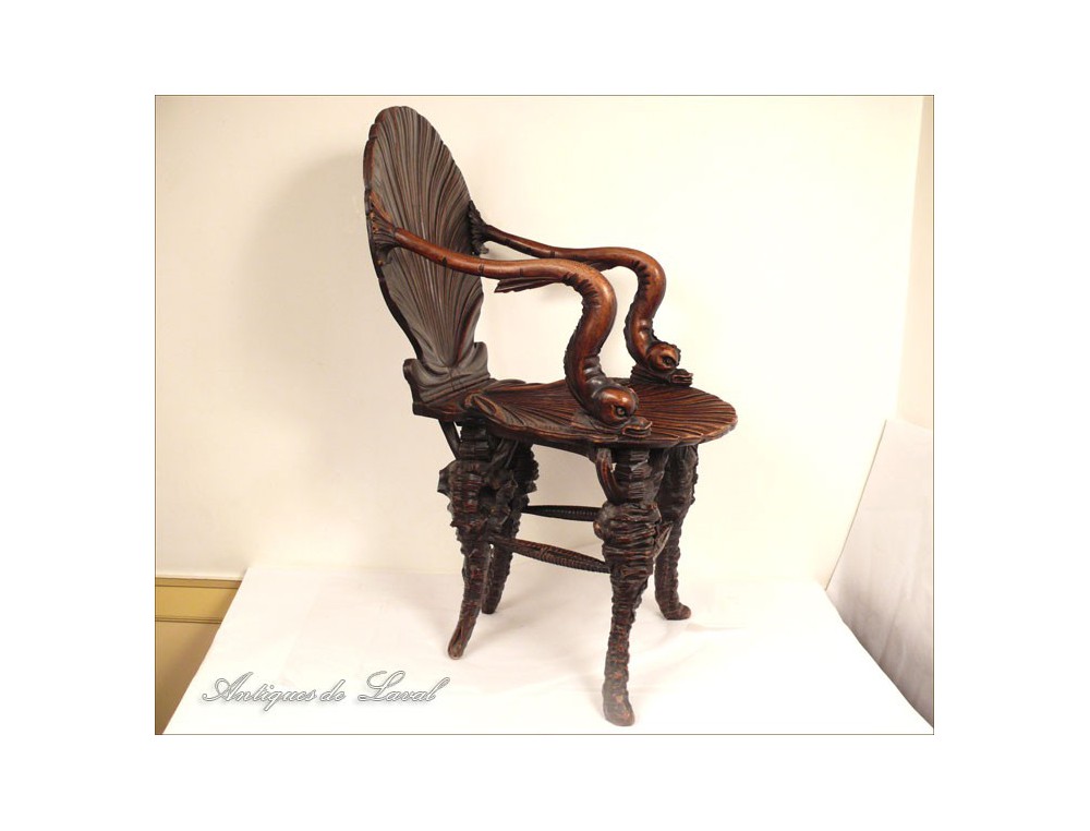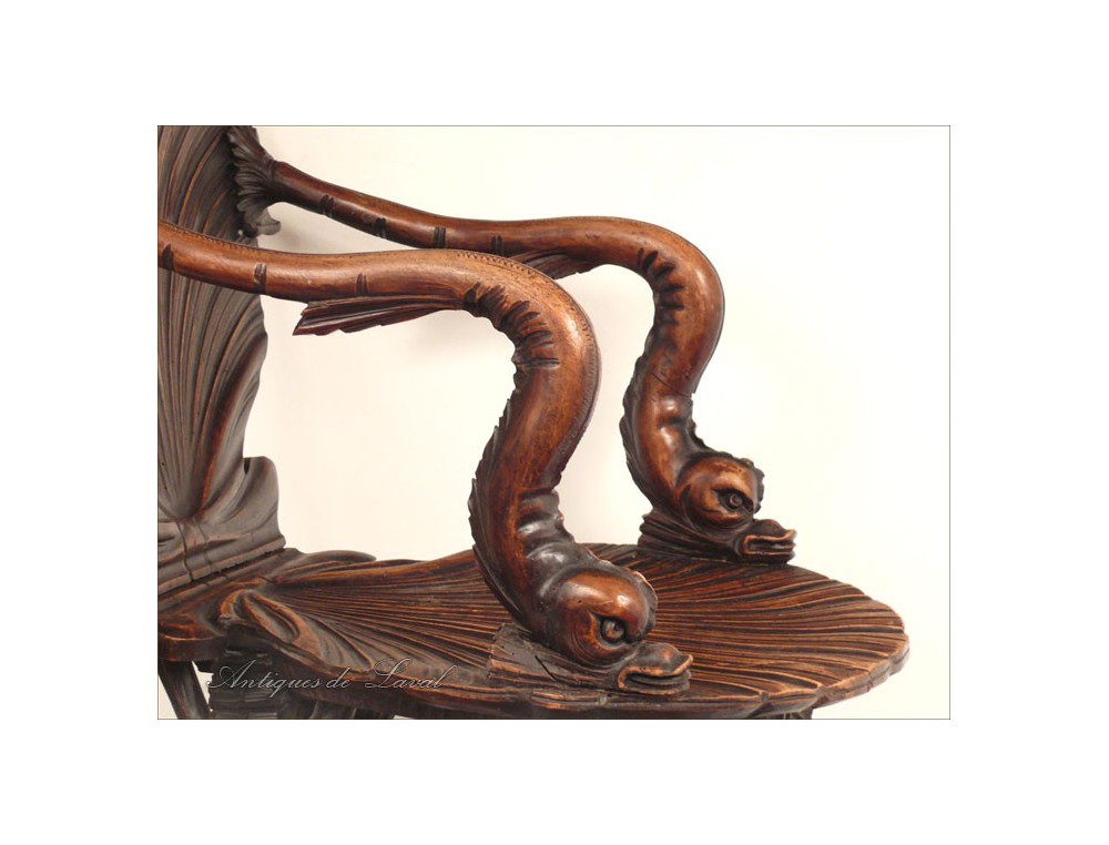 Rare says Rococo style chair cave, decorated with a scallop-Jacques for back and seat, shells for the base and heads for armrests dolphins, of XIXth century.
