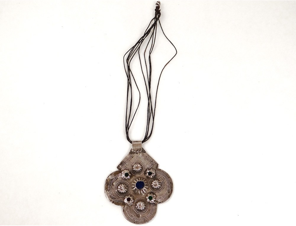 Beautiful sterling silver pendant finely carved, decorated with small colored cabochons, origin Morocco, vintage early twentieth century.