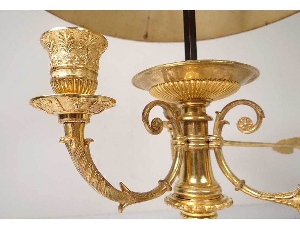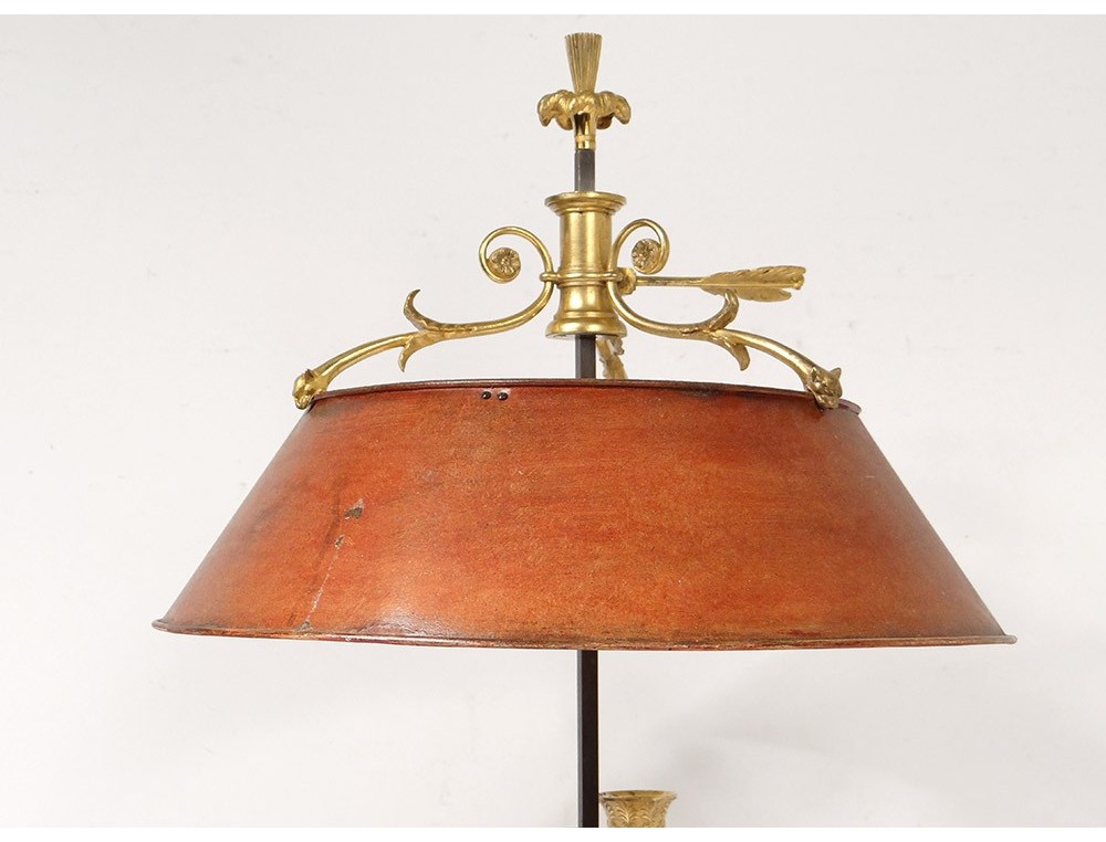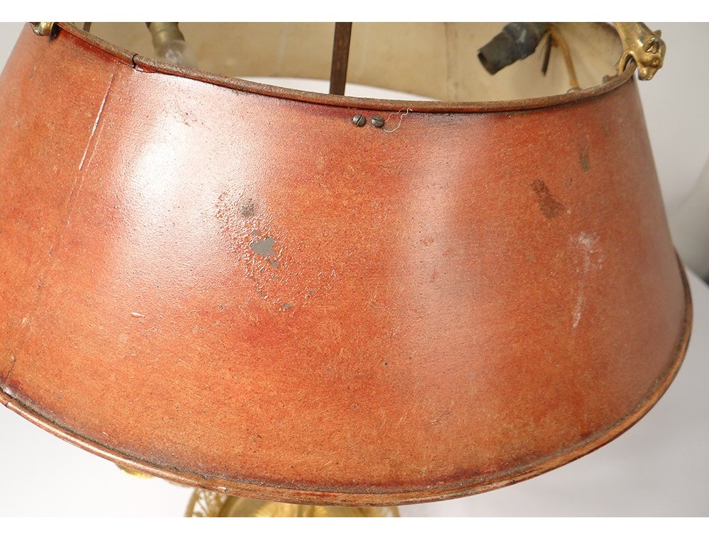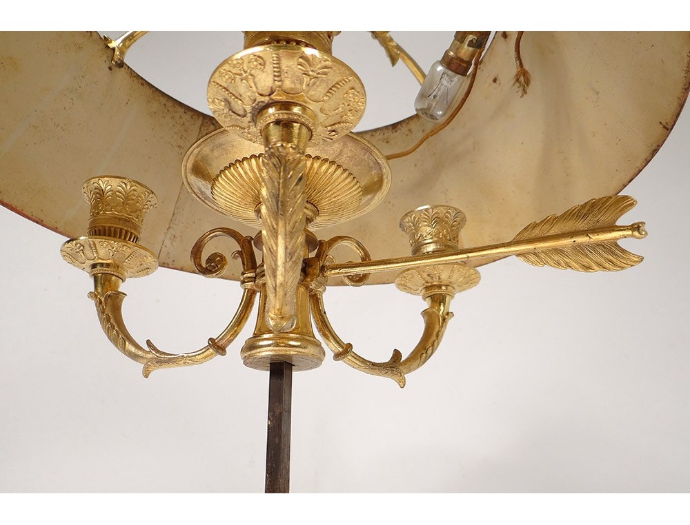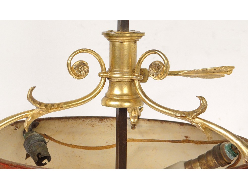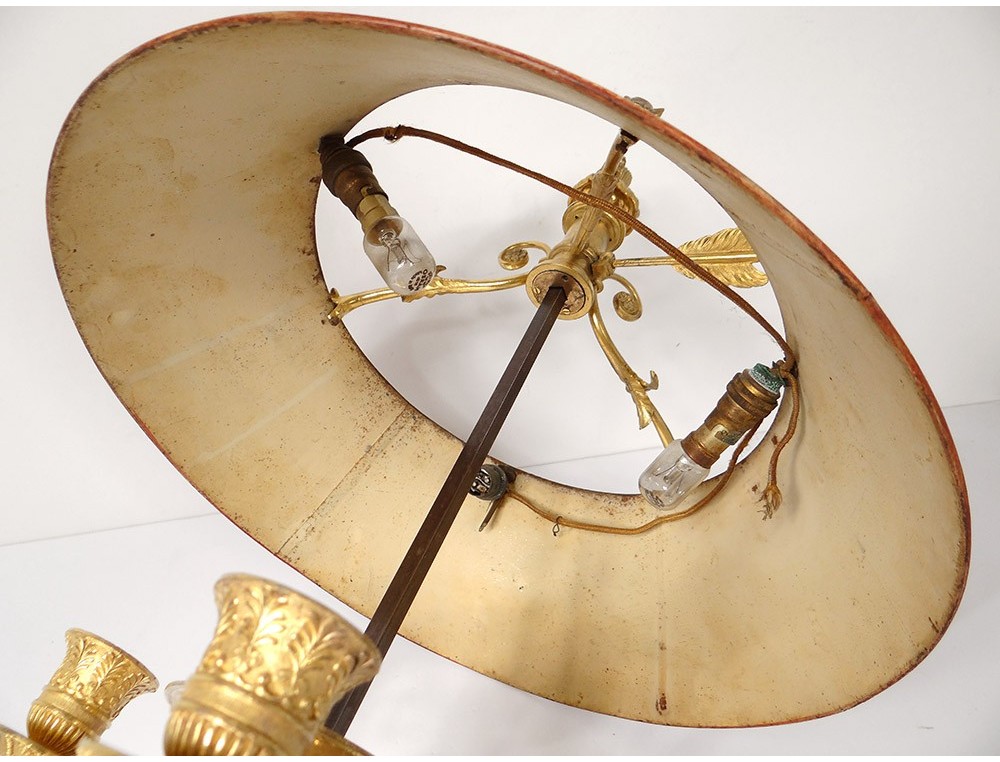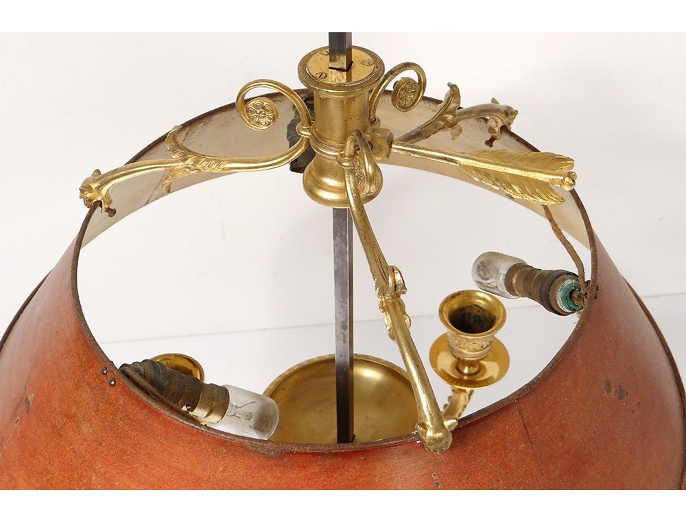 Rare large bouillotte lamp gilded bronze finely chiseled, three lights (adjustable in height) with leafy branches, base in perforated bowl richly decorated with friezes of palmettes, original lampshade made of red painted sheet supported by three chimeras with arabesques and topped with a headdress of Indian, period I Empire early nineteenth century.