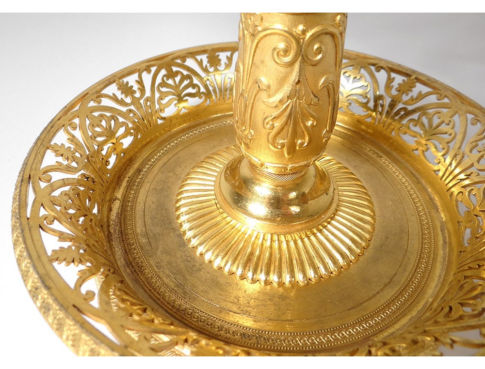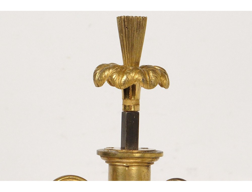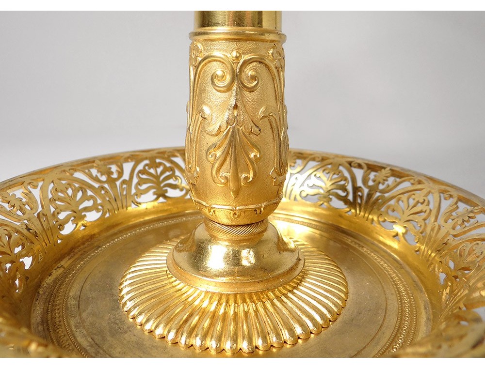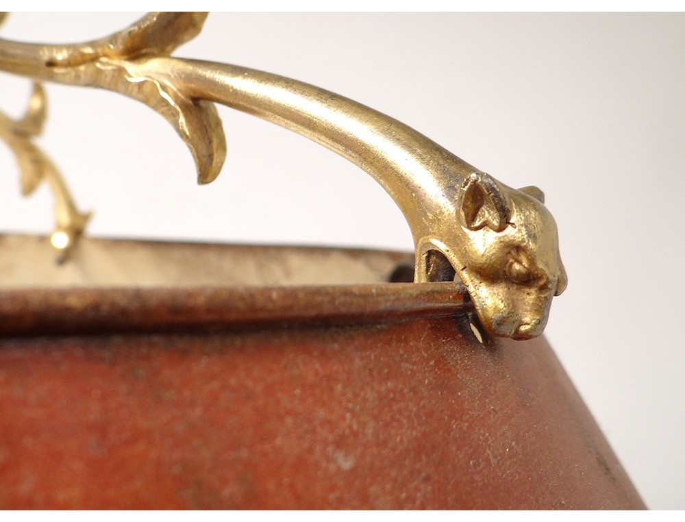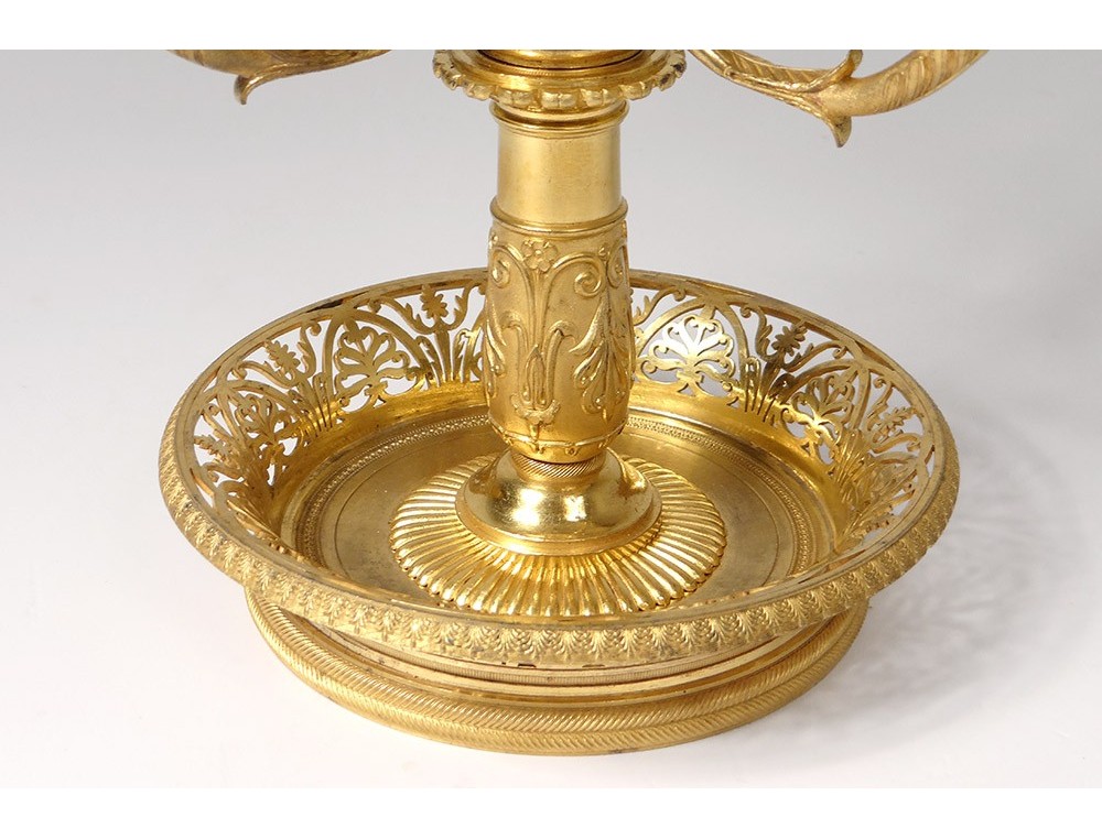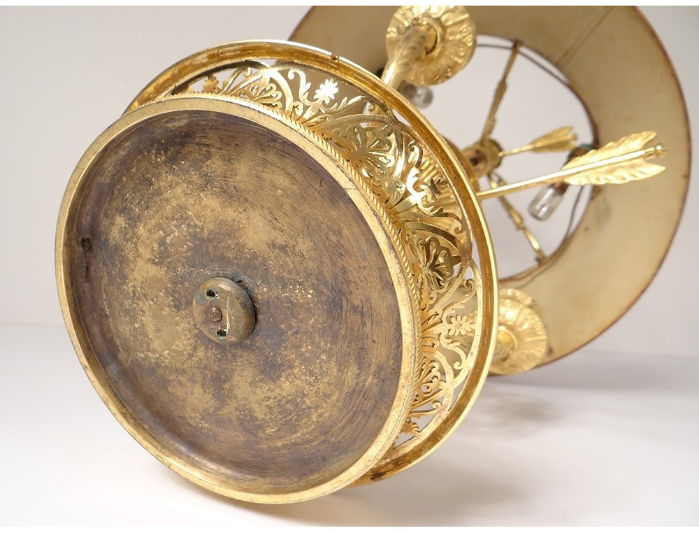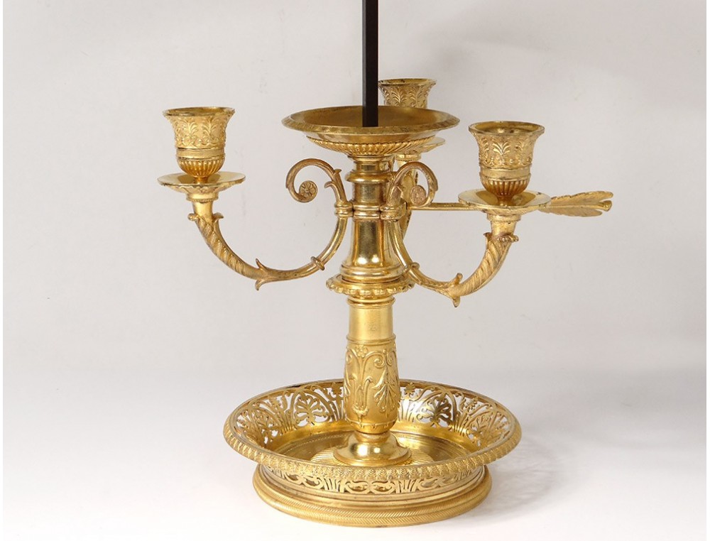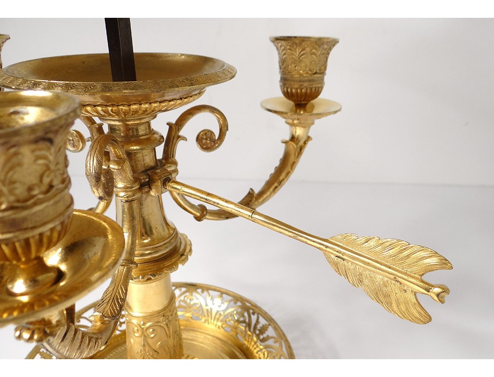 Rare large bouillotte lamp gilded bronze finely chiseled, three lights (adjustable in height) with leafy branches, base in perforated bowl richly decorated with friezes of palmettes, original lampshade made of red painted sheet supported by three chimeras with arabesques and topped with a headdress of Indian, period I Empire early nineteenth century.