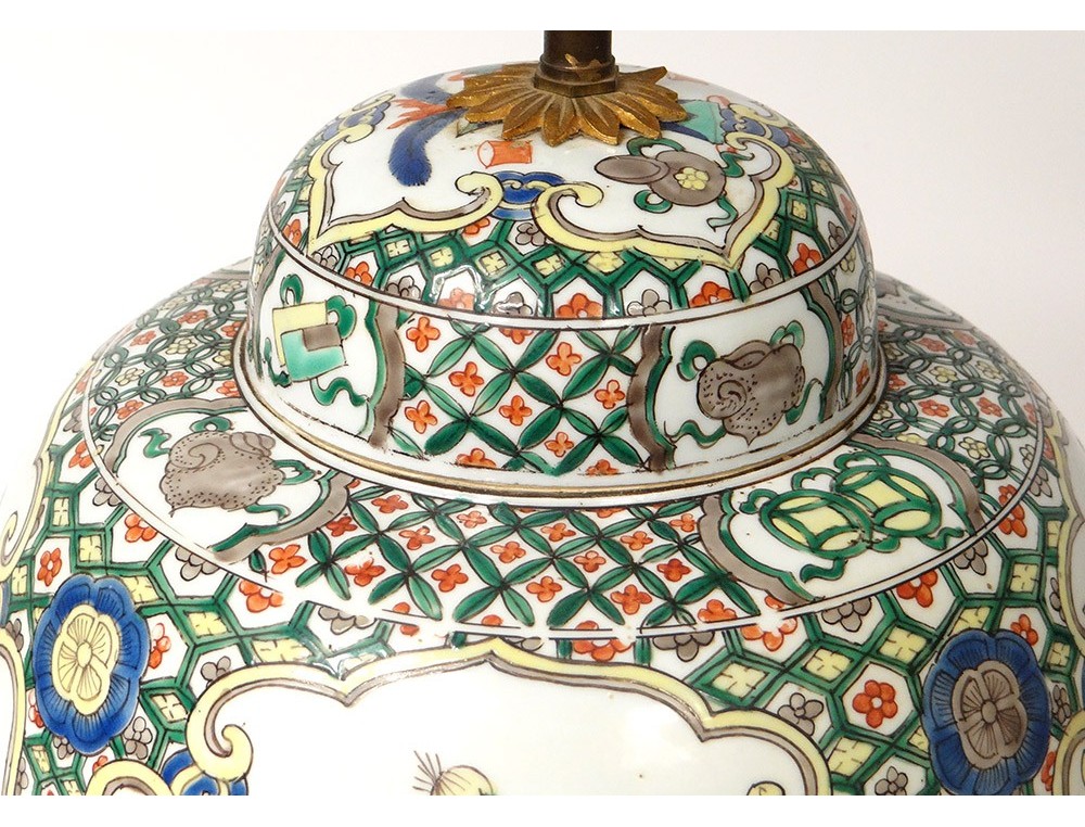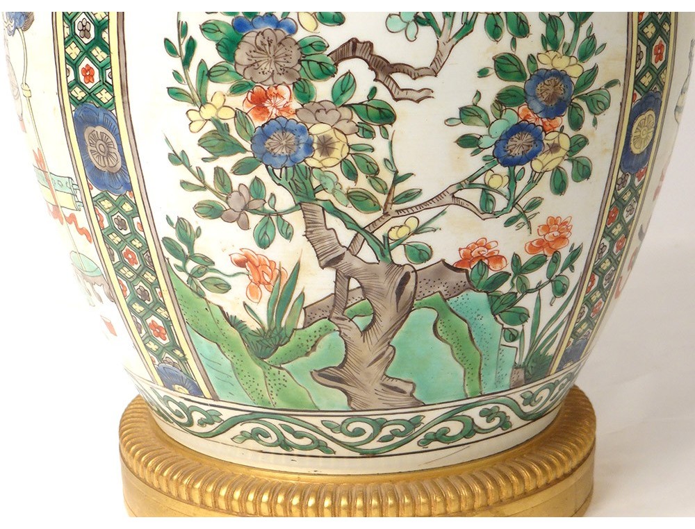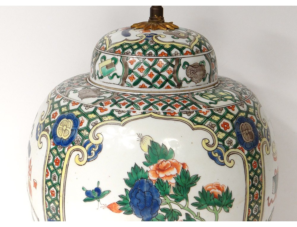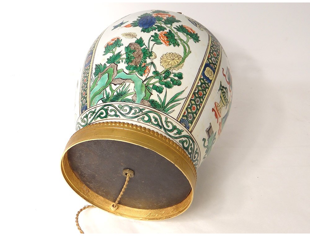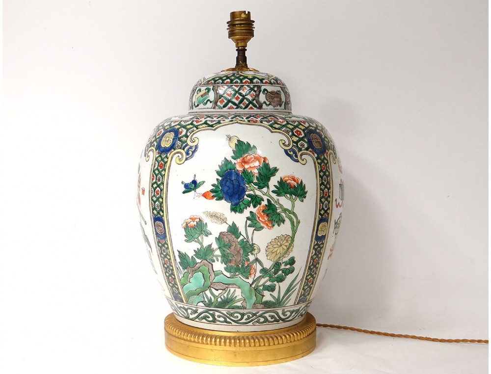 Covered jar or vase mounted in Chinese polychrome porcelain lamp decorated with medallions of flowering trees surrounded by birds and butterflies, as well as everyday objects in a pagoda interior, all surrounded by stylized floral and plant motifs, bronze mount, vintage nineteenth century.