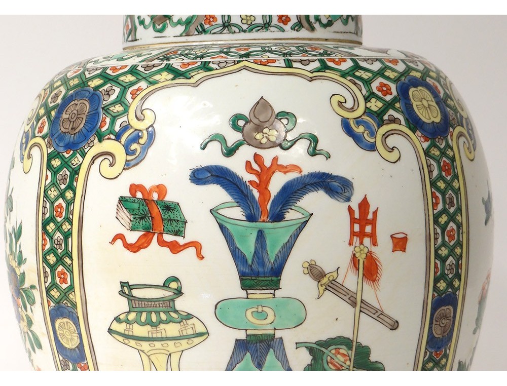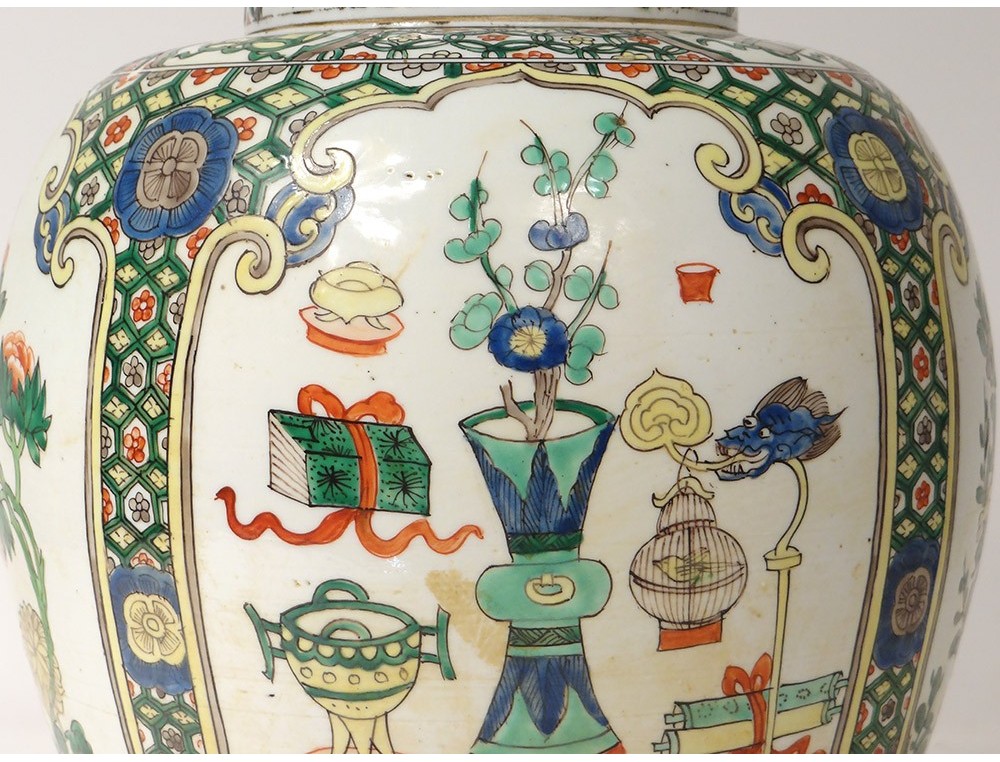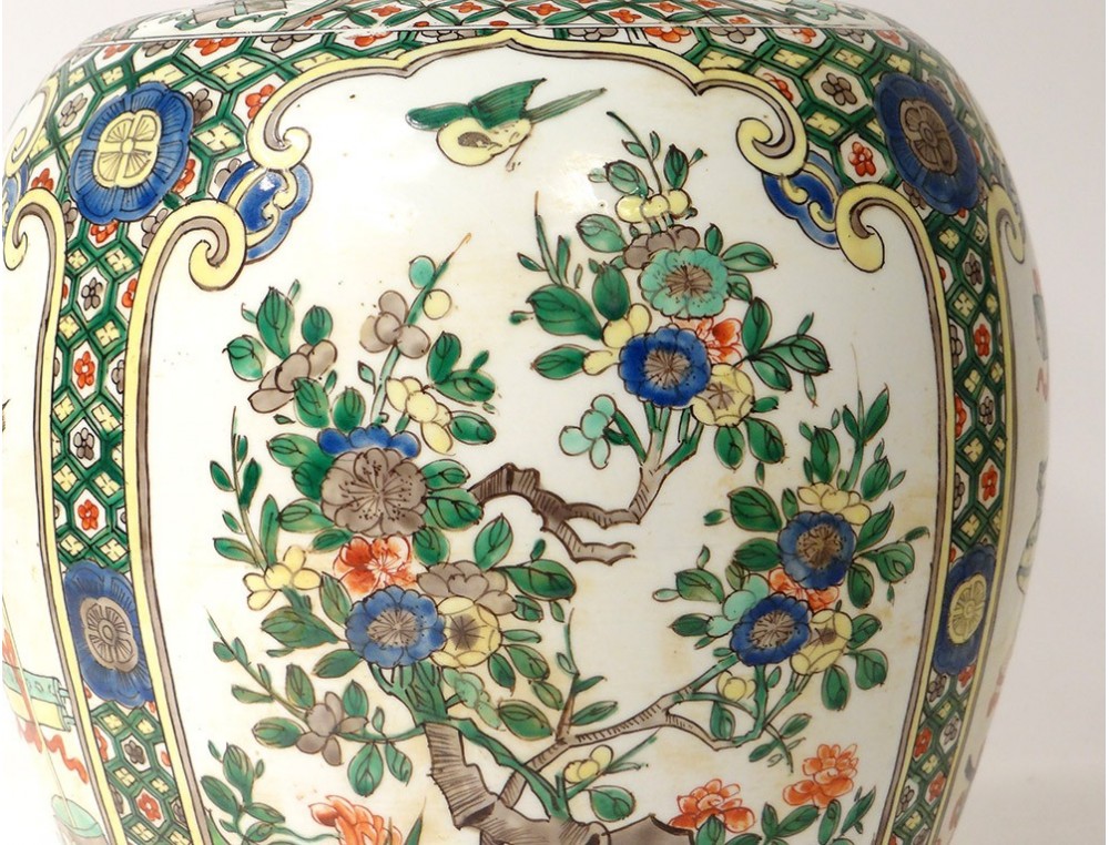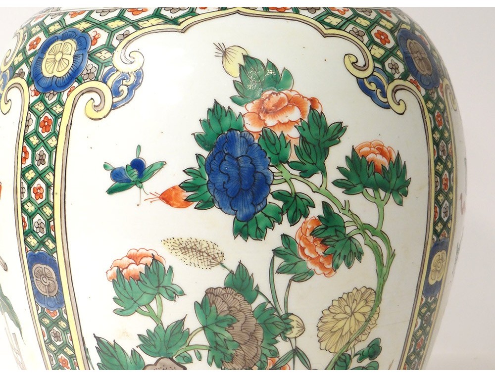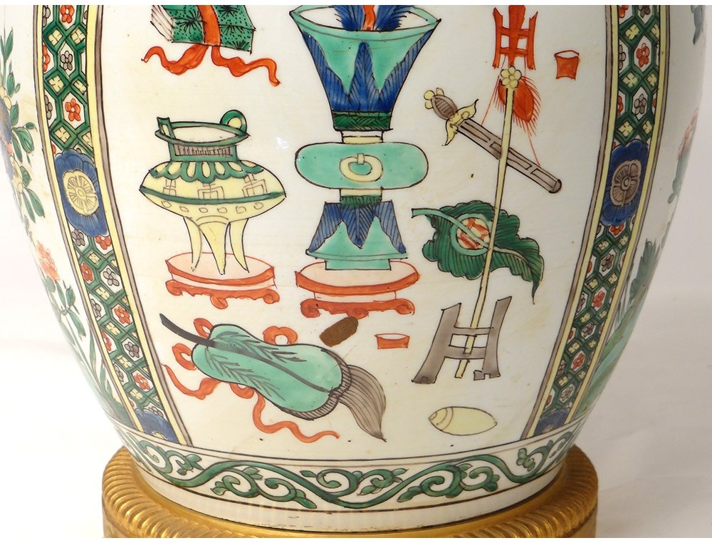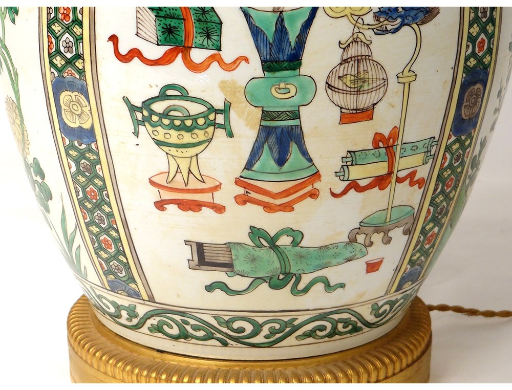 Covered jar or vase mounted in Chinese polychrome porcelain lamp decorated with medallions of flowering trees surrounded by birds and butterflies, as well as everyday objects in a pagoda interior, all surrounded by stylized floral and plant motifs, bronze mount, vintage nineteenth century.