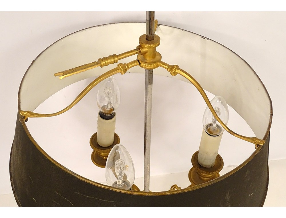 Empire style hot water bottle lamp in finely chiseled gilded bronze, with three sconces in the shape of eagle heads, windings, small palmettes and plant motif, painted sheet shade (adjustable in height), round openwork base, late nineteenth-early twentieth centuries.