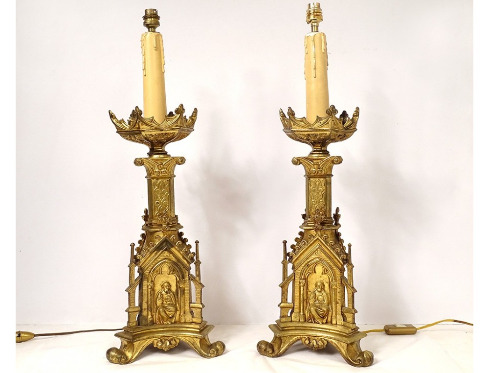 Pair of candlesticks mounted as lamps, in finely chiseled gilt bronze with neo-Gothic decoration of Christ holding an orb and holding a scepter as well as of the Virgin Mary, all in an architectural ensemble with pinnacles and buttresses, from the XIXth century century.