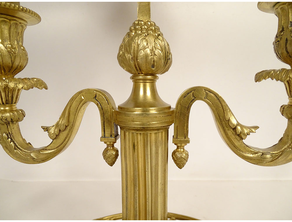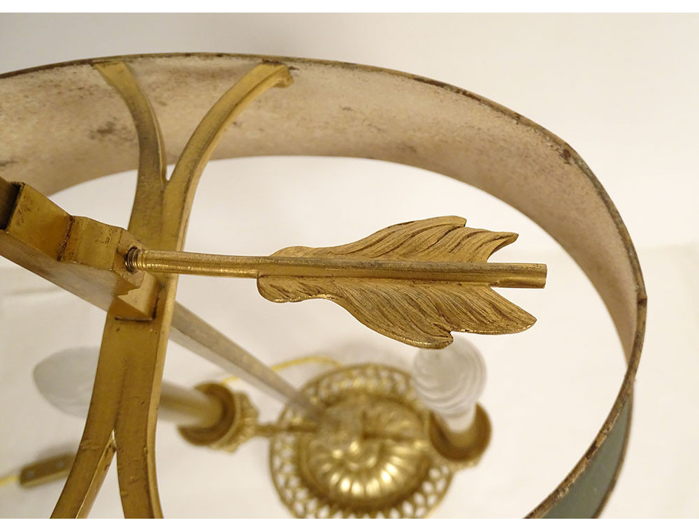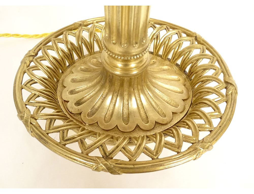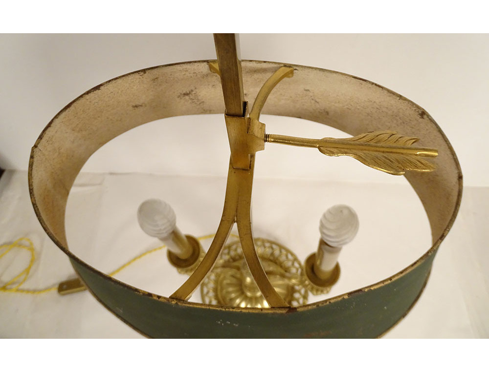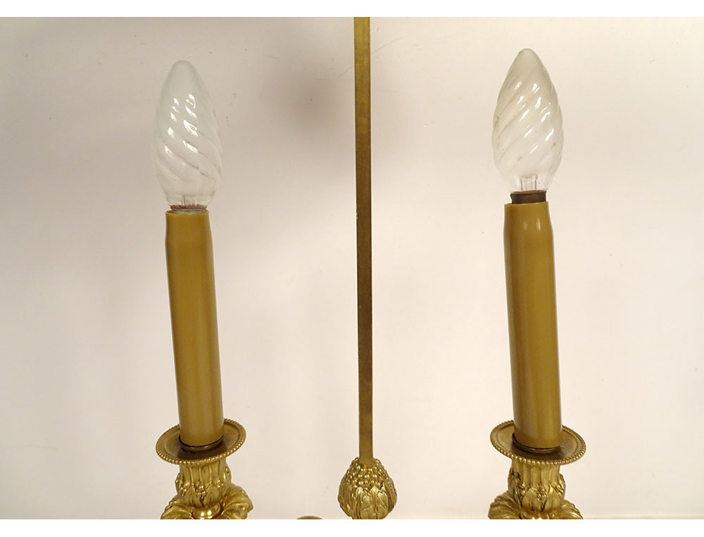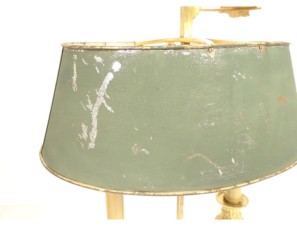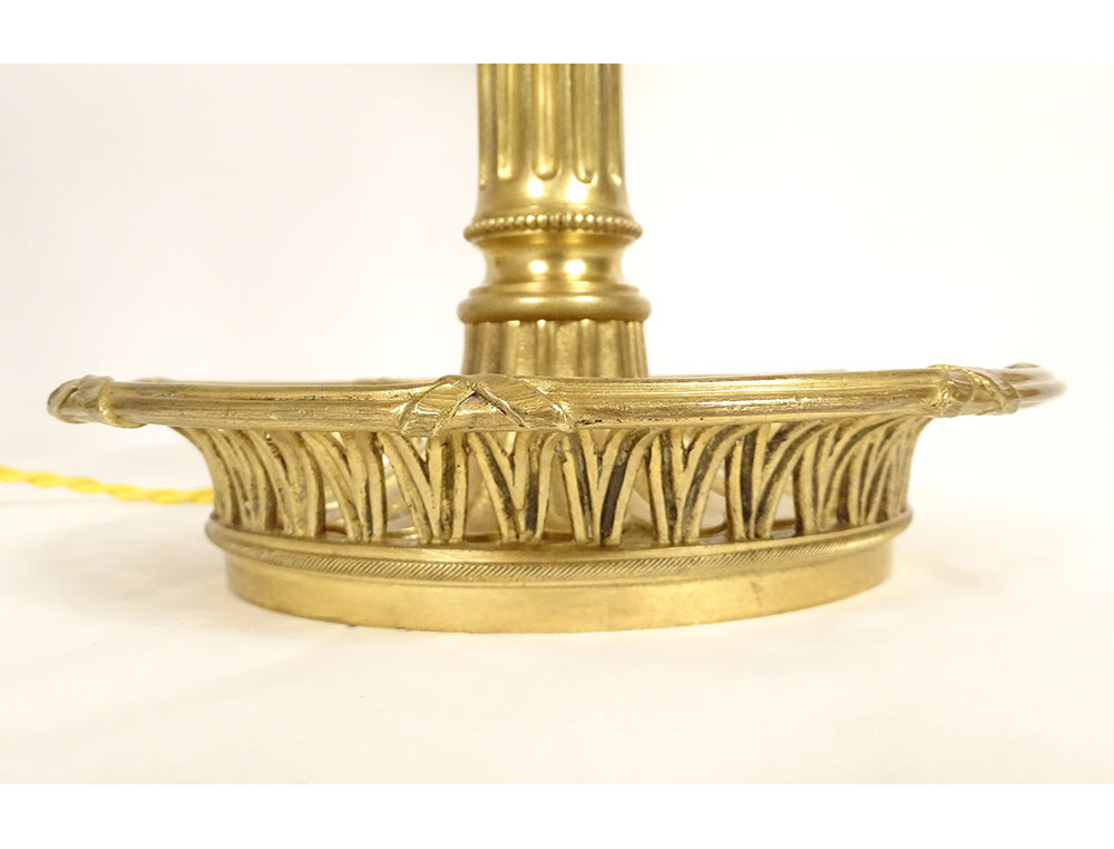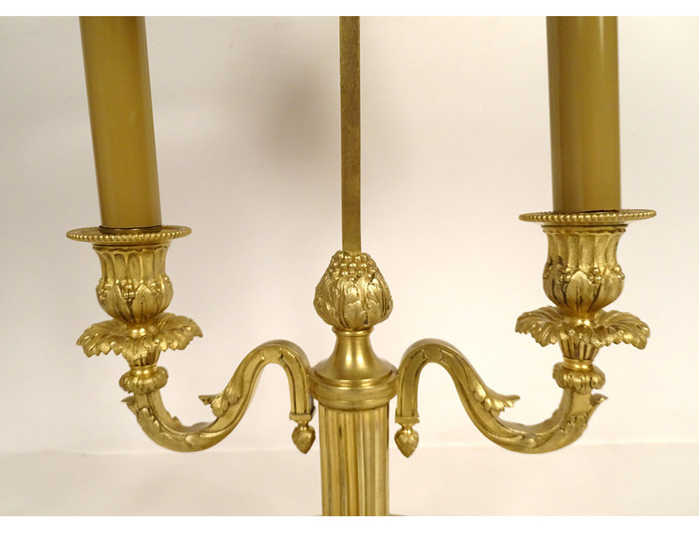Louis XVI style two-light bouillotte lamp in finely chiseled gilt bronze, leafy arms mounted on a fluted shaft, basket-shaped base with openwork crosspieces and pleats, green sheet metal lampshade, late 19th century.