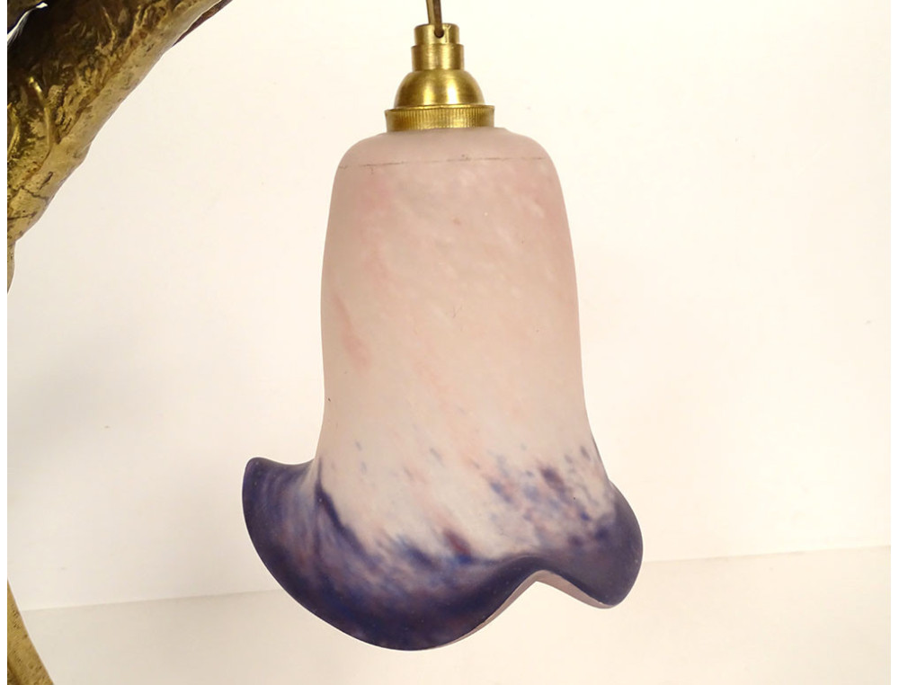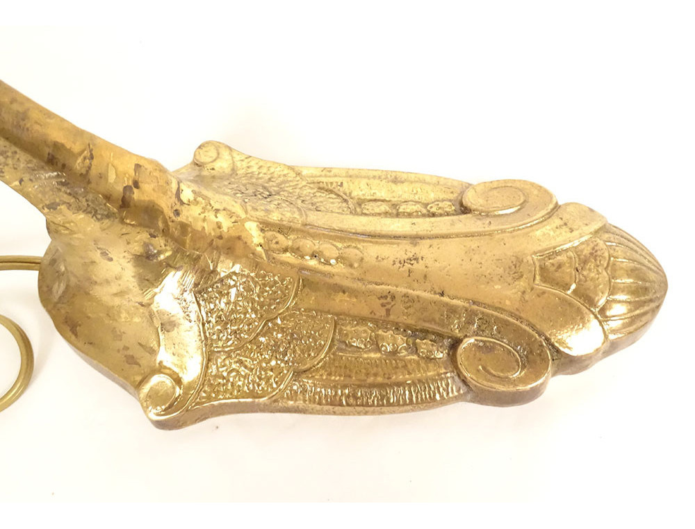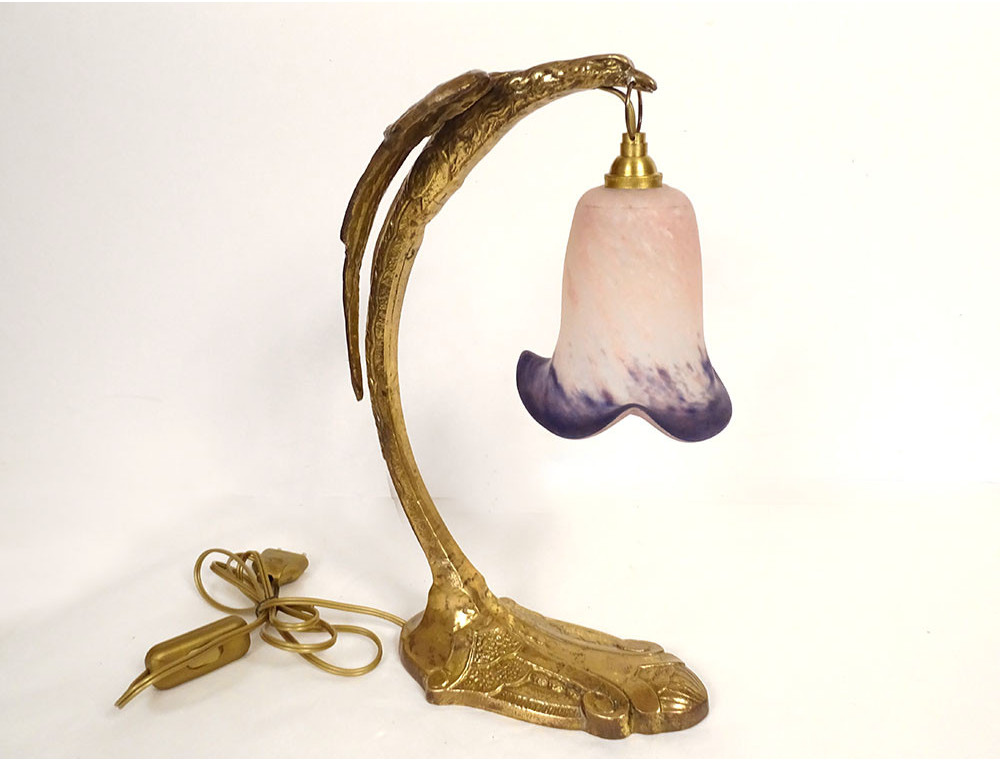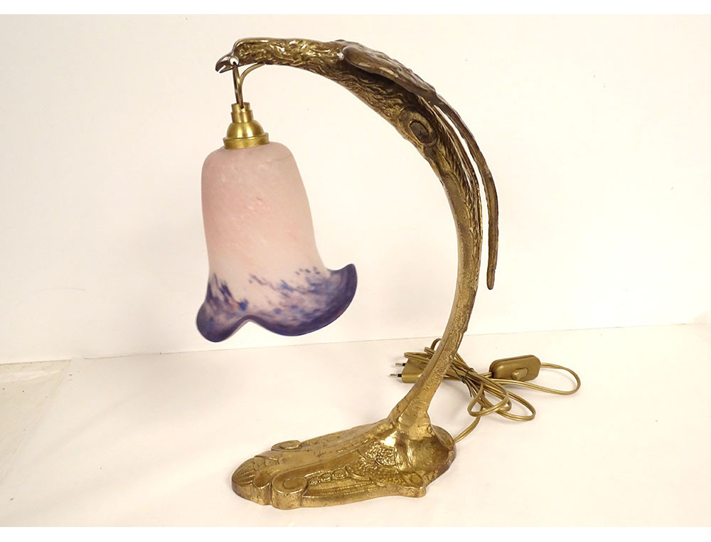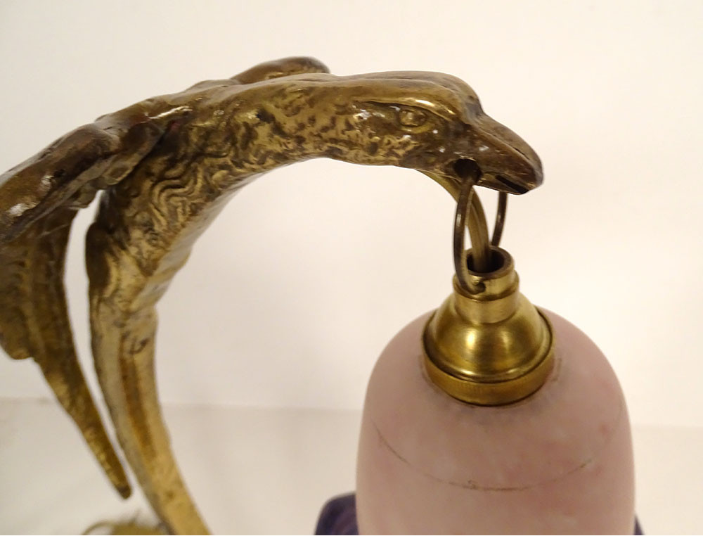 Finely chiseled gilt bronze table lamp decorated with an eagle holding a glass paste tulip (possibly Muller Frères), base decorated with stylized motifs, model by Charles Ranc*, Art Deco period, early 20th century.