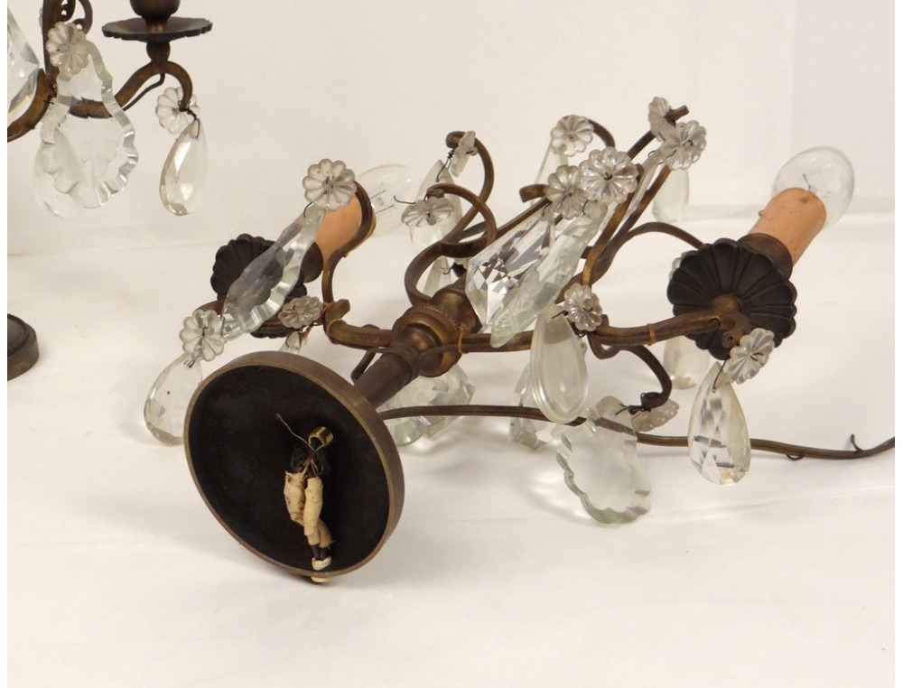 Very nice pair of candelabras crystal pendants carved and gilded bronze lyre-shaped, period late nineteenth and early twentieth centuries.