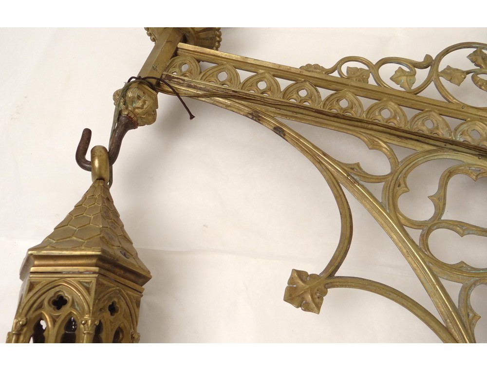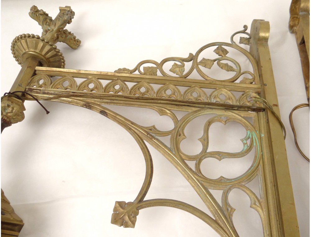 Superb pair of gilt bronze sconces, gothic Viollet-le-Duc, decorated with cathedral elements: lanterns, friezes of ovals, scrolls, tongs, bellows, and foliage, Napoleon III nineteenth century.