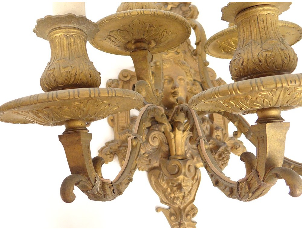 Pair of big sconces Regency 5 fires or sconces, finely chiseled gilt bronze masks for decoration: a faun or satyr in the bottom and a woman wearing the antique center, as well as palm leaves and foliage , XIXth century.