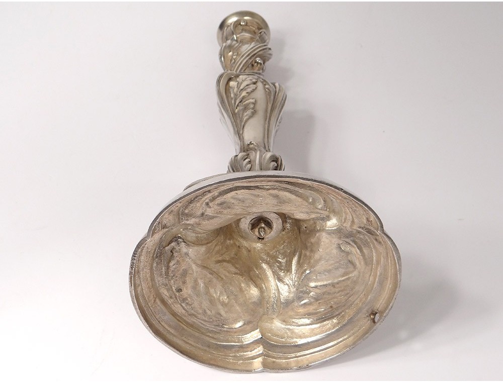 Large lamp base in the shape of a Louis XV candlestick, in finely chiseled silver bronze with a foliage rocaille motif, punched Christofle, from the 20th century.
