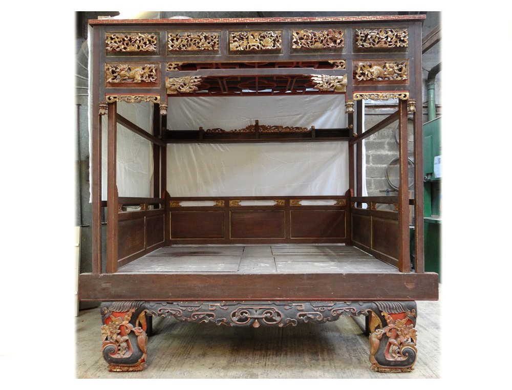 Exceptional and rare Chinese closed canopy bed and front railing (said Jiazichuang) carved and gilded, richly decorated with fantastic animals (dragons) and arabesques of flowers and foliage, with storage shelf, ceiling boxes, from China, Qing nineteenth century.