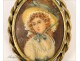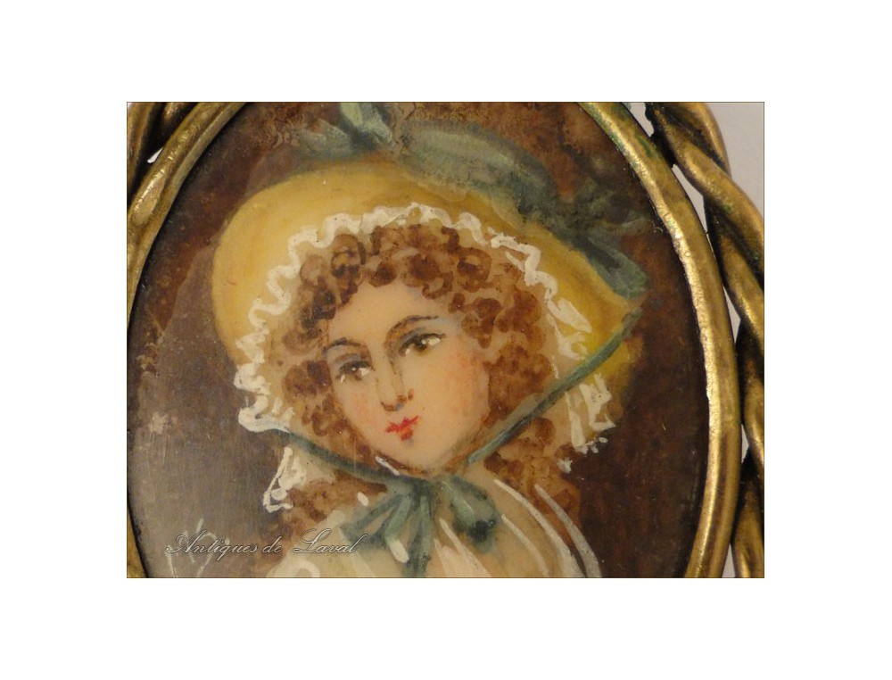 Miniature hand-painted the portrait of a young girl in the hat, mounted as a brooch, metal strapping golden era of the early twentieth century.