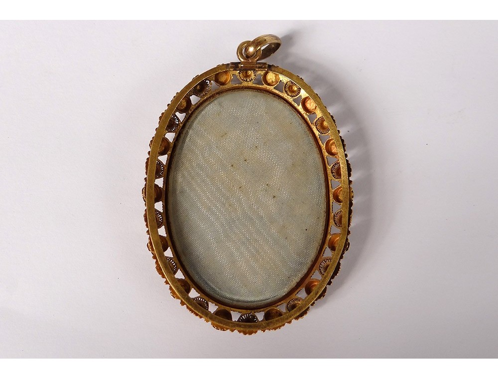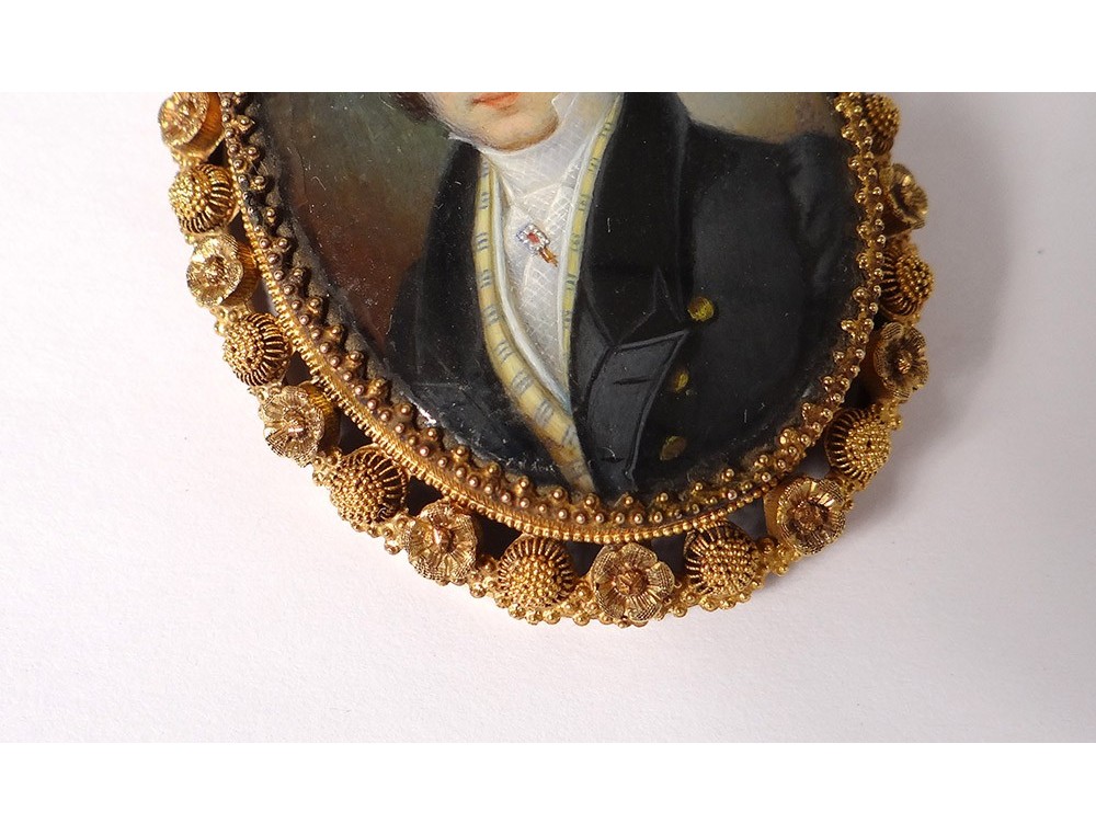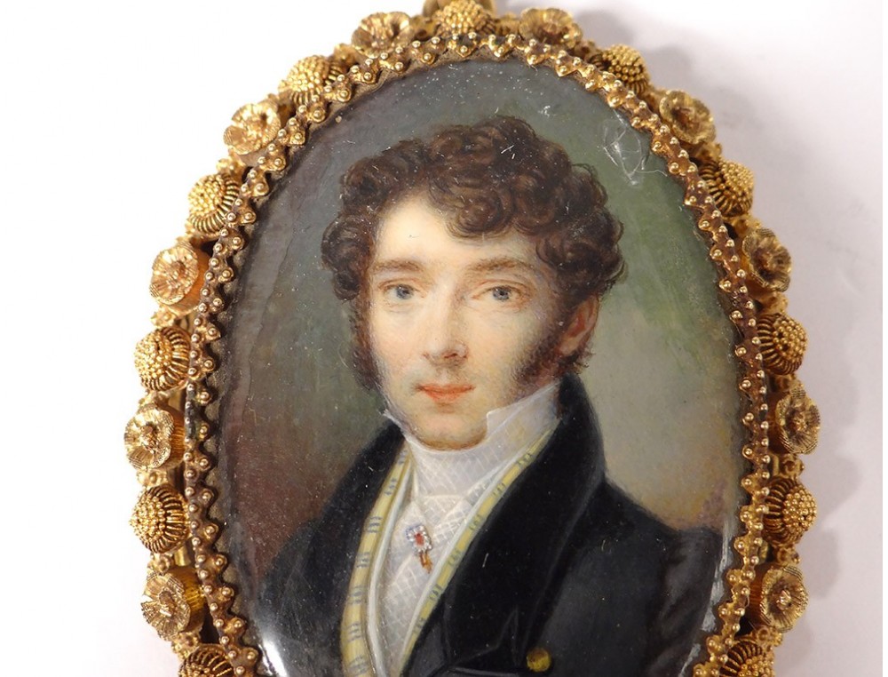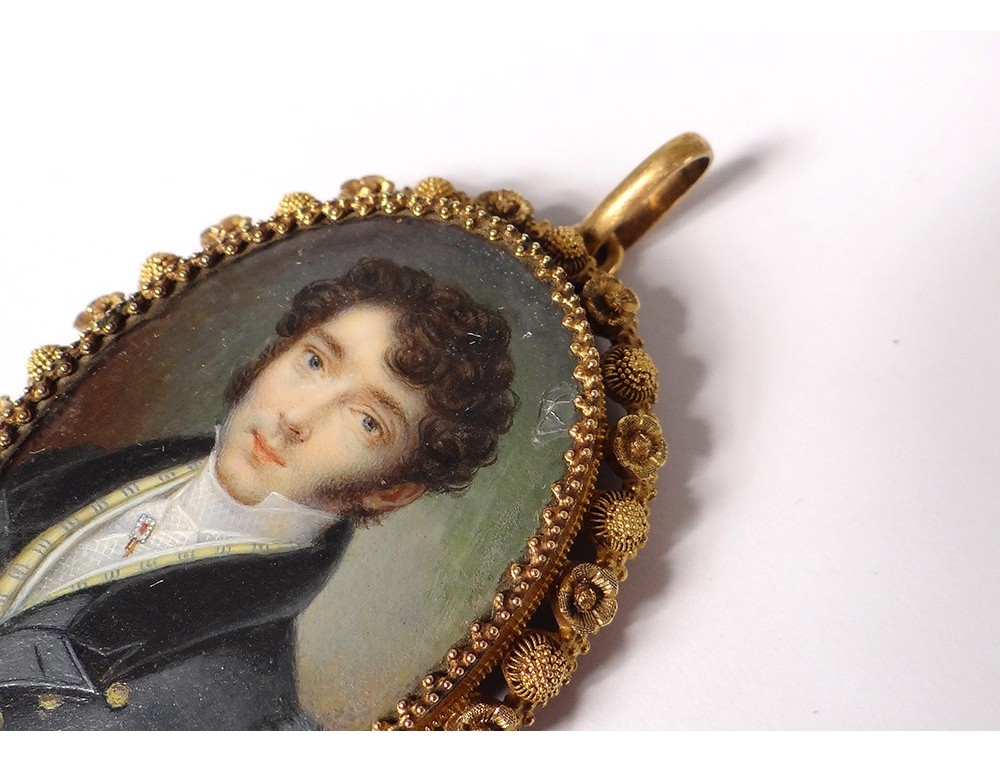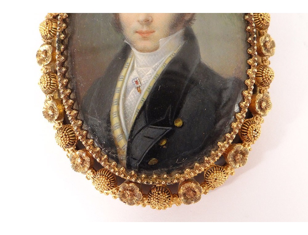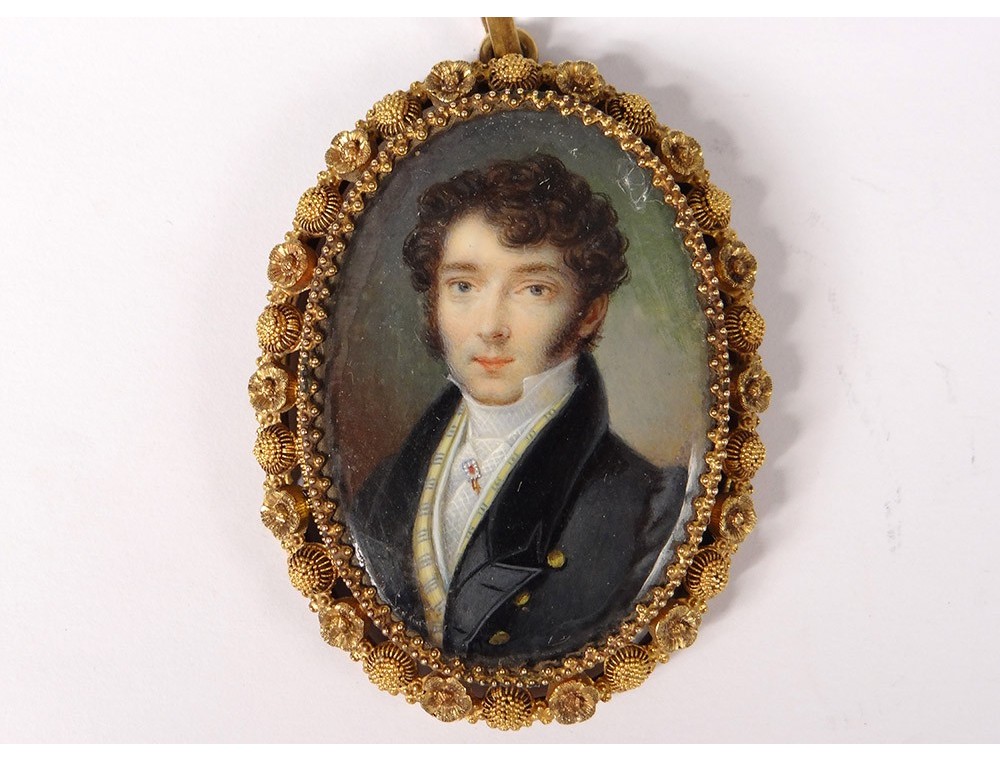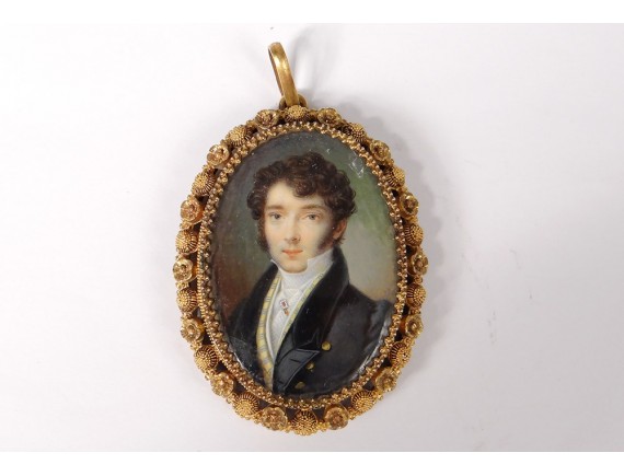 Miniature painted, mounted as a pendant, depicting the portrait of an elegantly dressed young man wearing a jacket, a frock coat and a tie pin set with a ruby ??and diamond, signed Cior *, in a gilded metal frame or pomponne , Restoration period early nineteenth century.