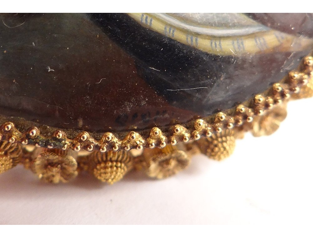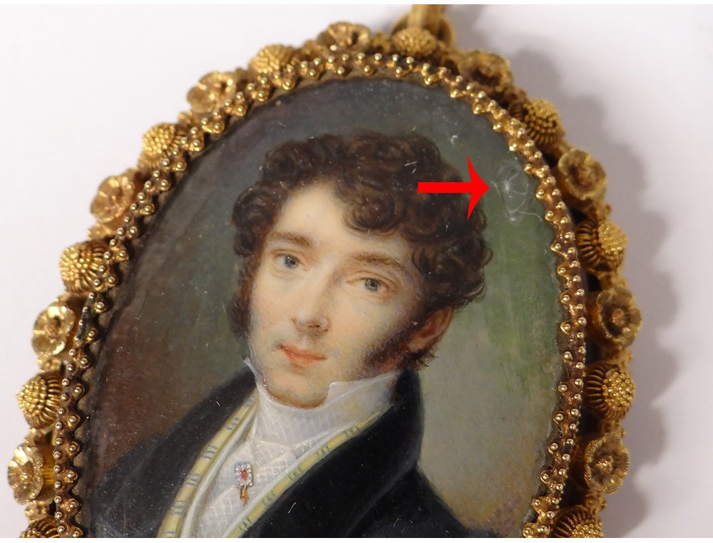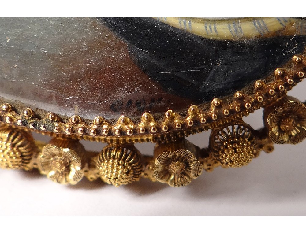 This miniature is in good condition. Signed on the left side. The frame is metal was probably changed (was maybe a brooch).