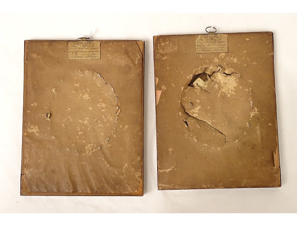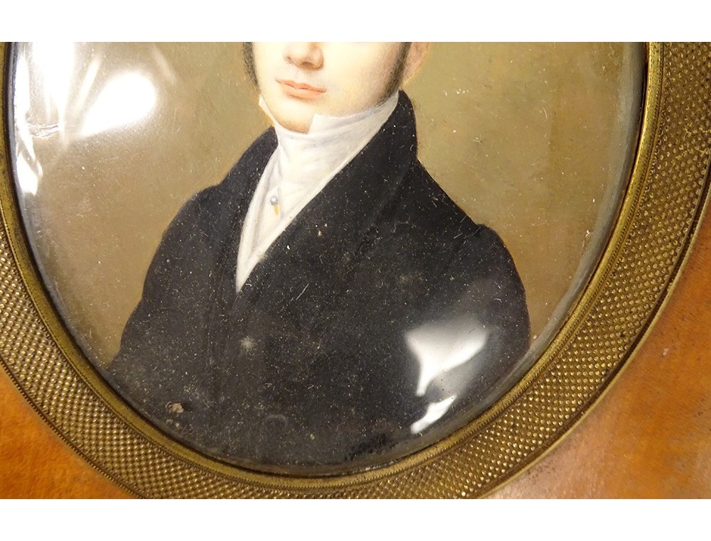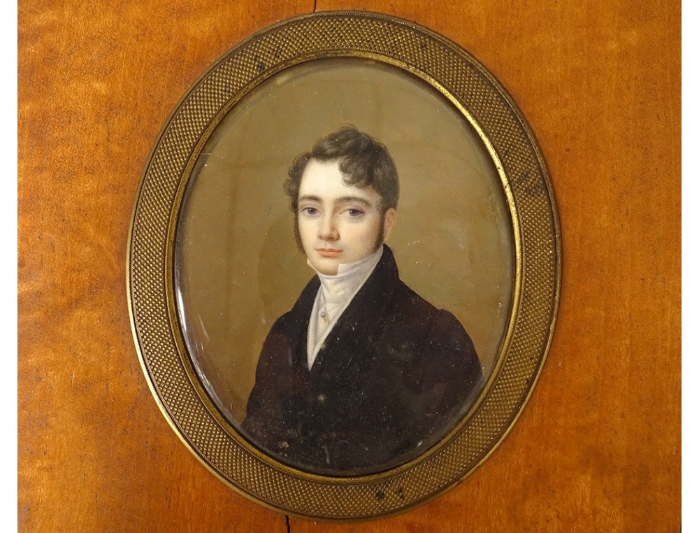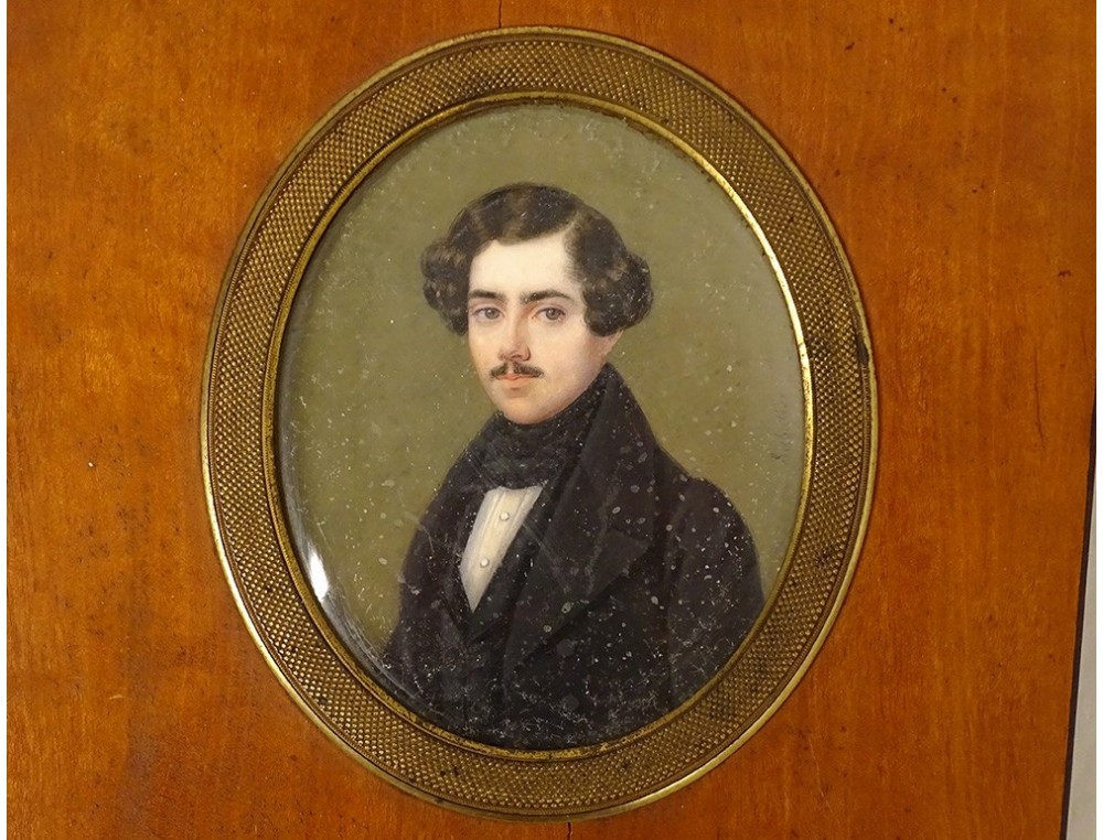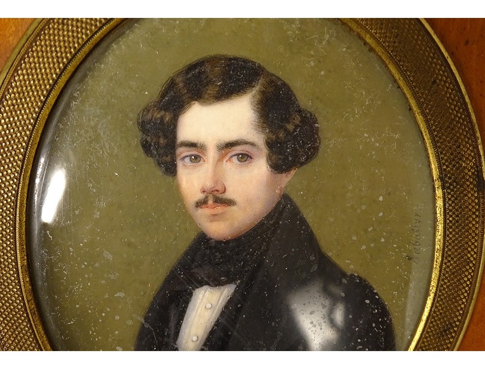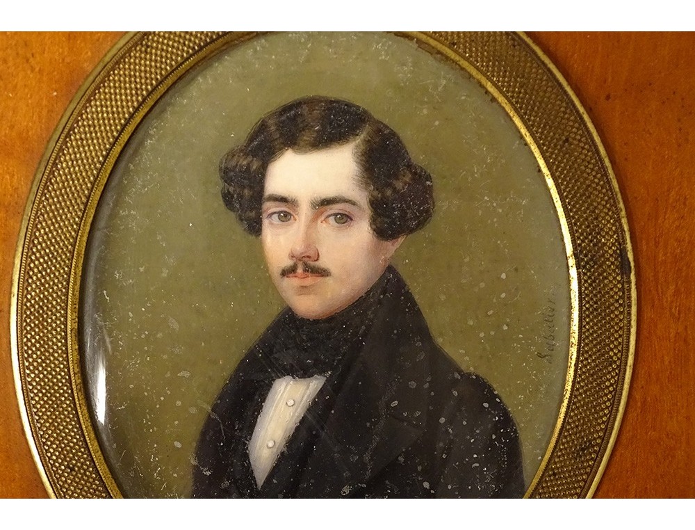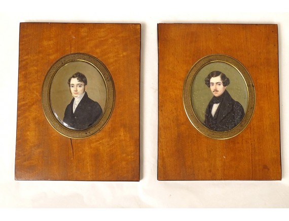 Pair of painted miniatures representing the portrait of two elegant young men, signed Sabatier*, from the late Restoration period, first half of the 19th century.