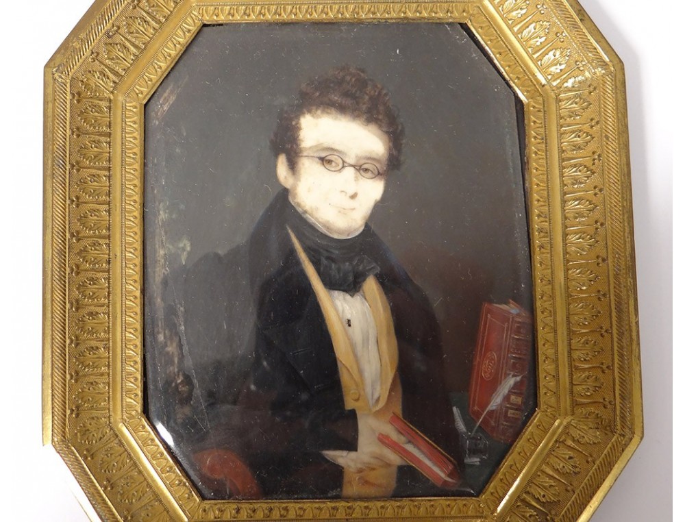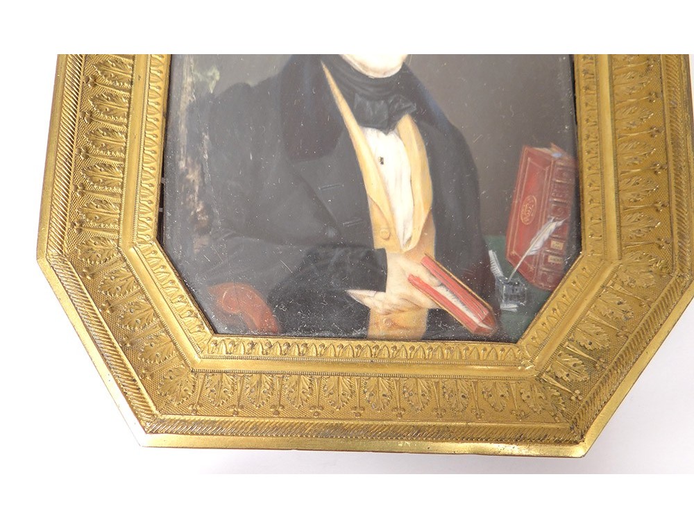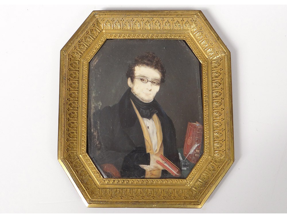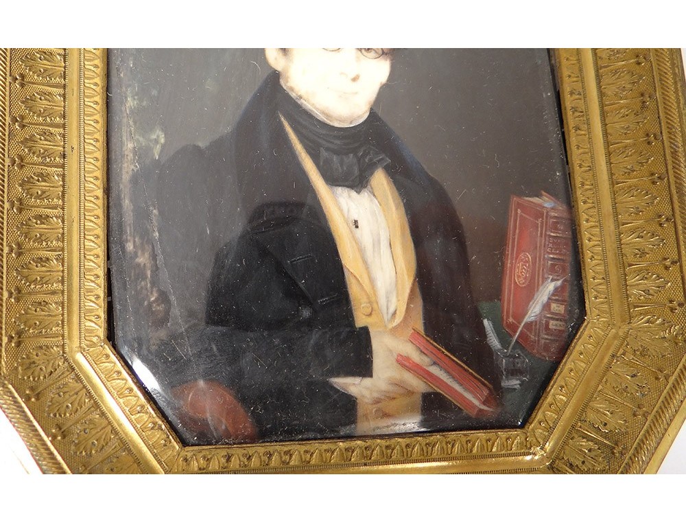 Miniature hand painted representing the portrait of a man, a bourgeois holding a book, with his side a feather and another work, in a gilded brass frame, XIXth century.