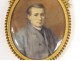 Oval miniature painted by hand depicting the portrait of a young man wearing a gray suit, signed Ms. Widow * Lallemand, in a gilt brass frame decorated with a bow on top, XIXth century.