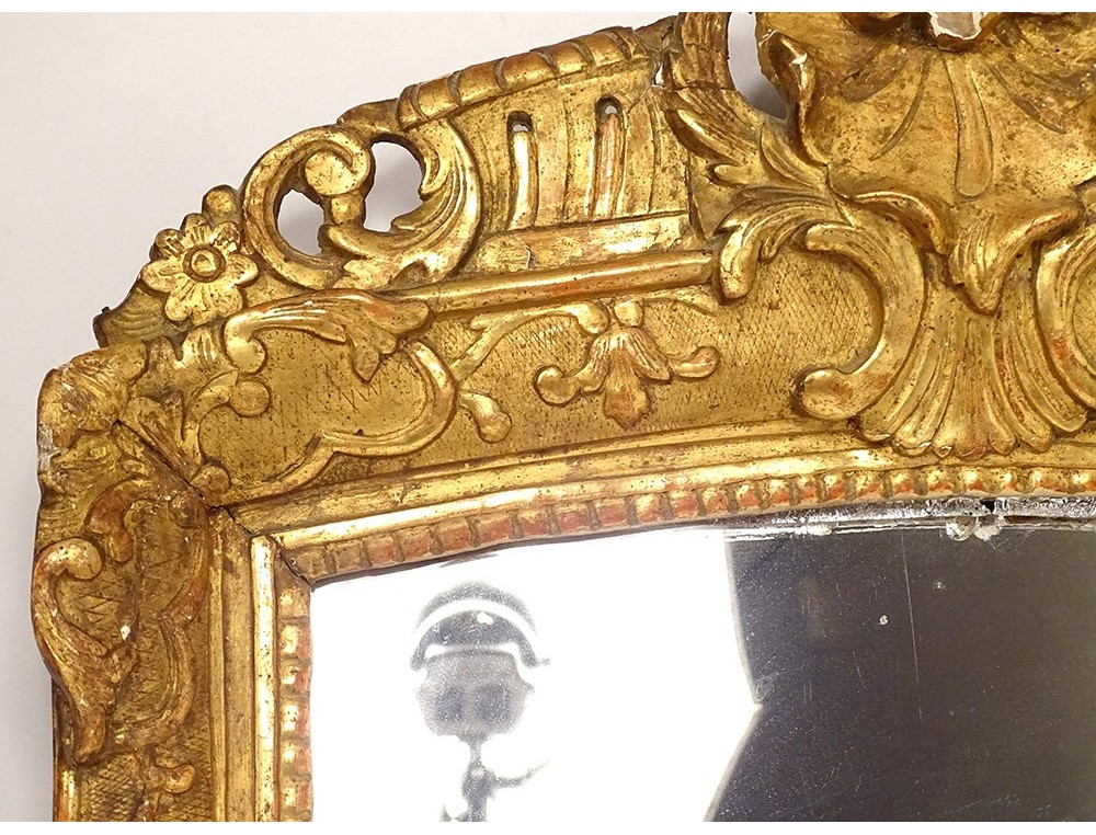 Regency mirror, gilded carved wooden frame decorated with plant arabesques, small flowers and stylized shells, original mercury ice, from the 18th century.