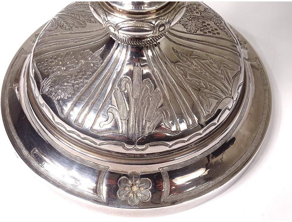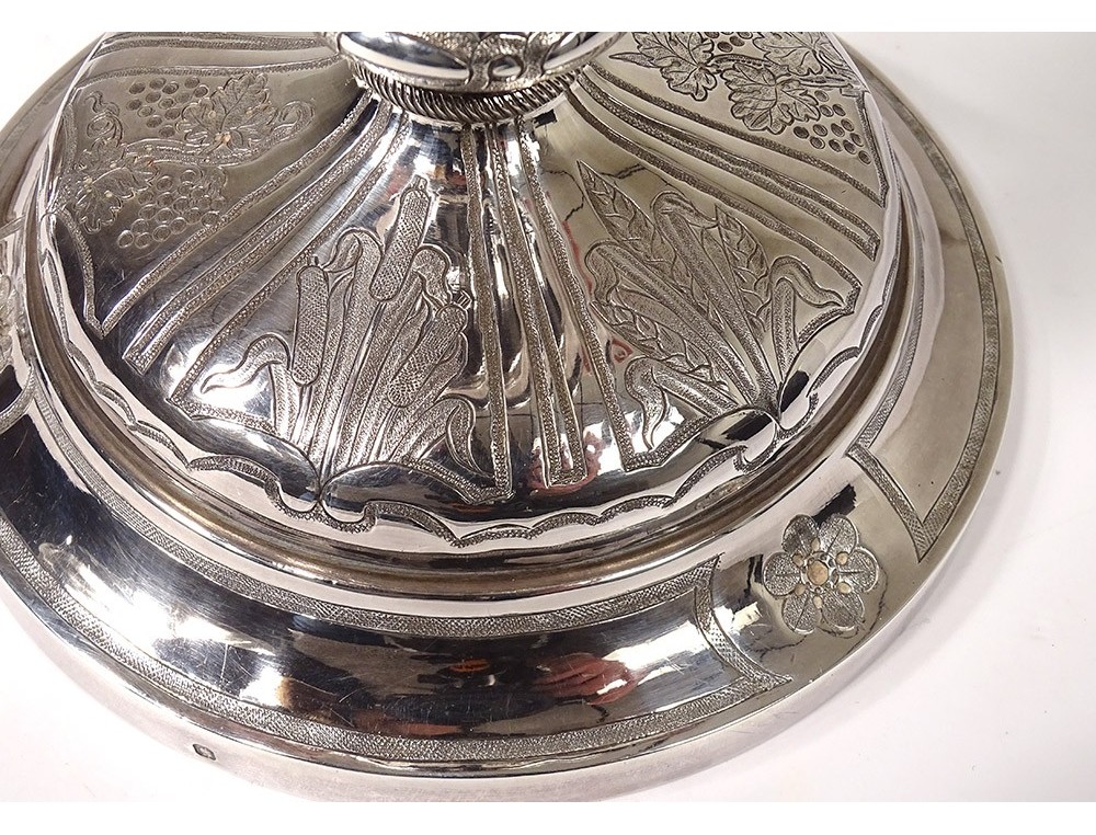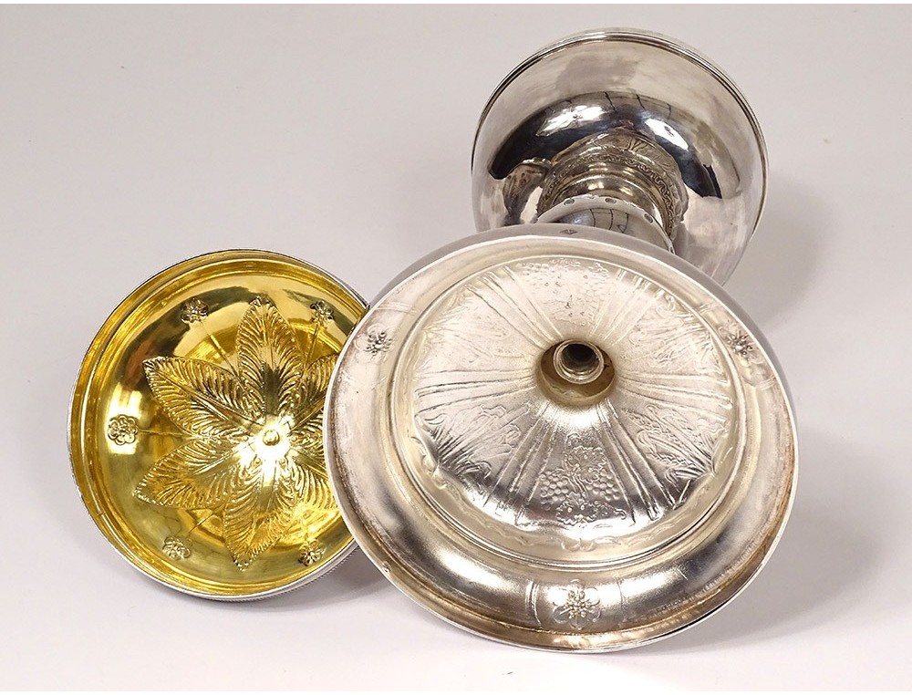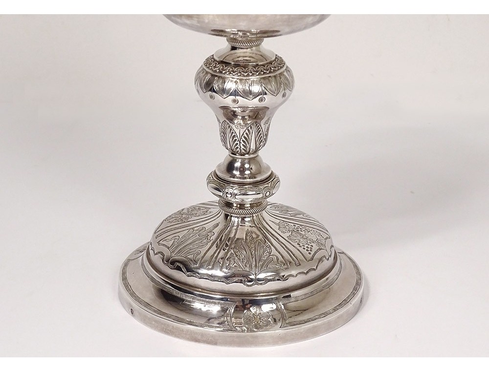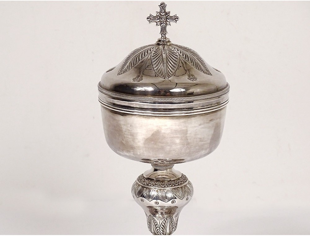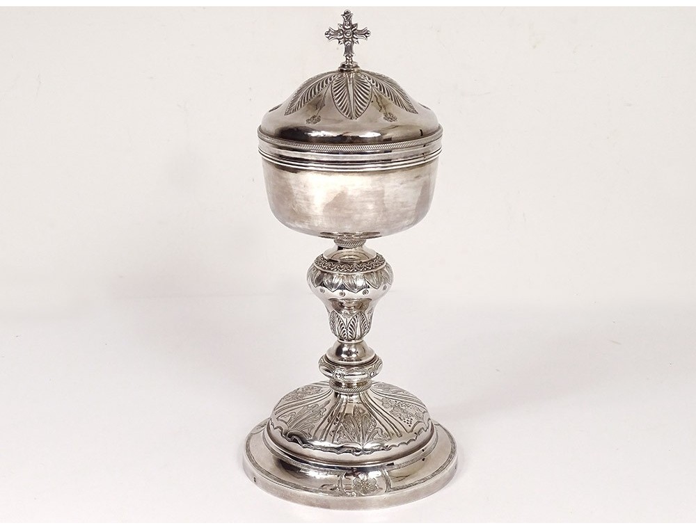 Finely chiseled solid silver ciborium decorated with a cross on the cover decorated with foliage, round base decorated with ears of wheat, reeds and bunches of grapes as well as small florets, Hallmark punch (1st title) and goldsmith Garnier *, mid 19th century.