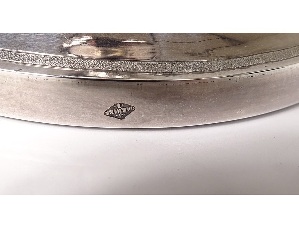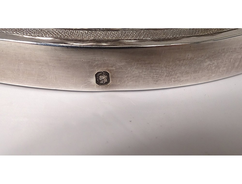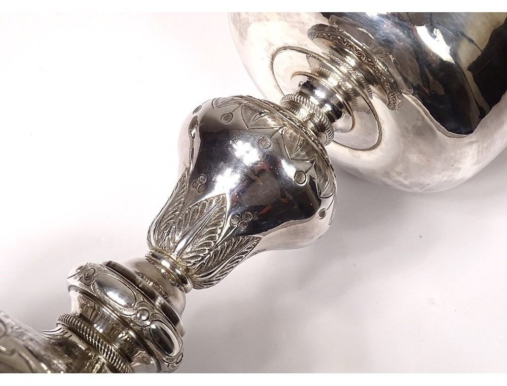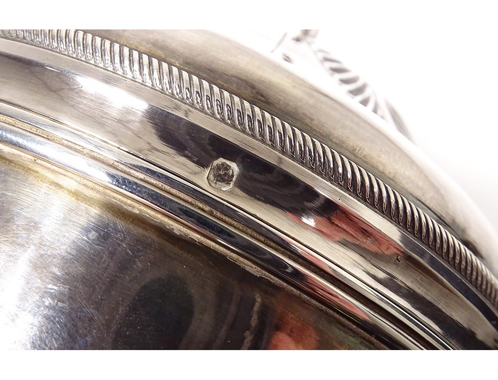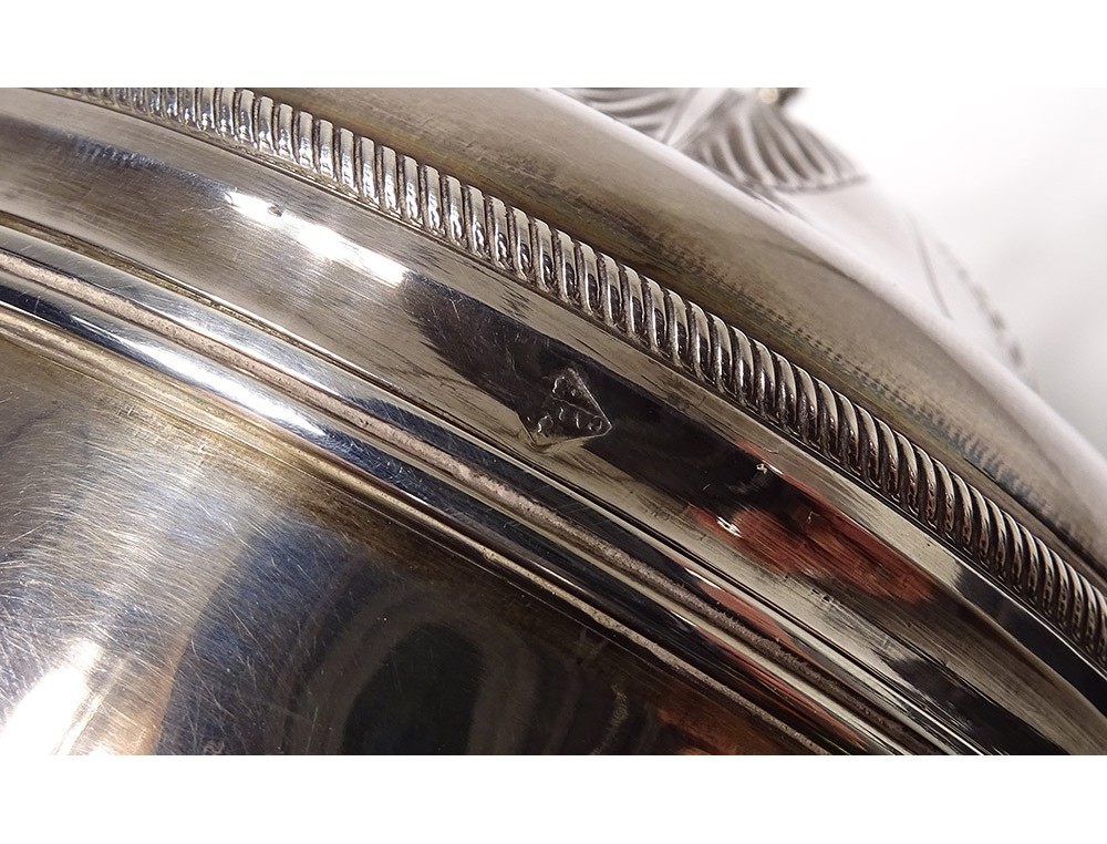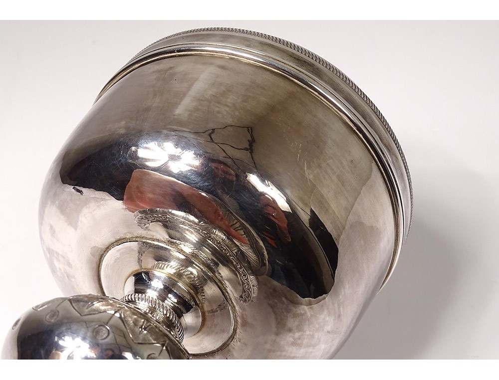 Finely chiseled solid silver ciborium decorated with a cross on the cover decorated with foliage, round base decorated with ears of wheat, reeds and bunches of grapes as well as small florets, Hallmark punch (1st title) and goldsmith Garnier *, mid 19th century.