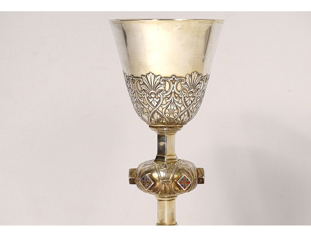Finely chiseled vermeillé silver chalice, bowl decorated with a stylized floral and vegetal motif, central knot decorated with small enamel medallions representing crosses, resting on a multi-lobed foot also with a stylized motif, Minerva punch (1st title) and goldsmith PV, d XIXth century.