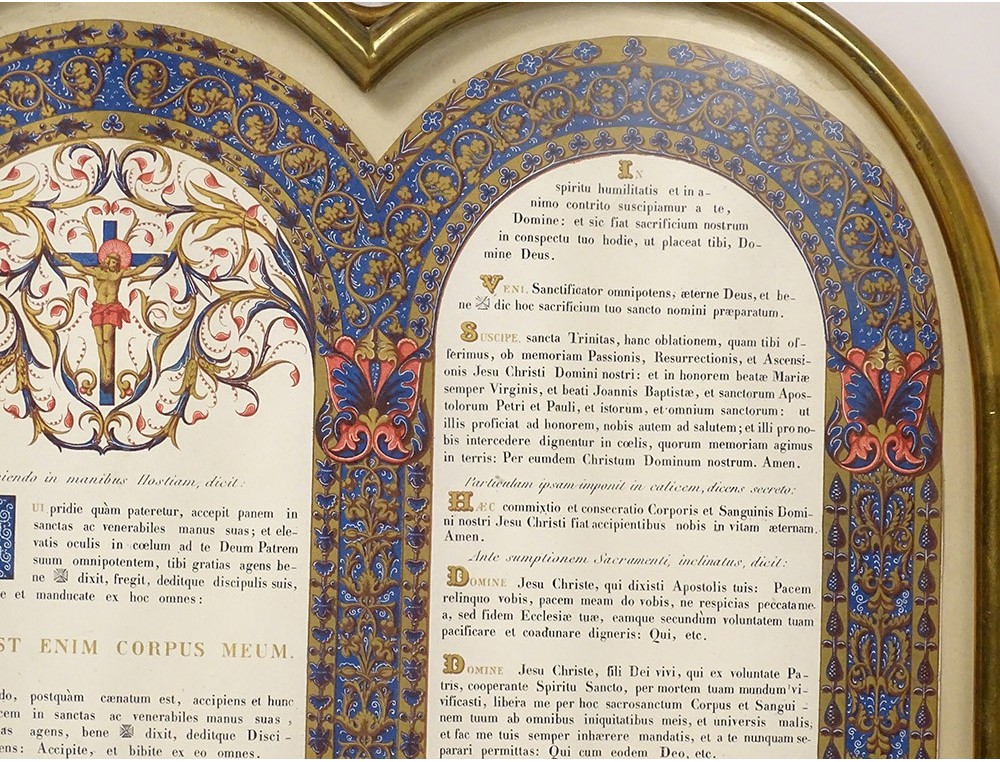 * At the time of the Latin mass with the back to the people, three paintings written in Latin and sometimes decorated by hand, were arranged on the altar, the one on the left included the text of the prologue to the Gospel according to Saint John, which the priest said at the end of mass. In the center a table on three columns included the Gloria, the Creed and the prayers of consecration. On the right the third contained the prayers of blessing for the water and the Washbasin. Often these guns are extremely decorated, and sometimes even by hand. The use of the central canon sometimes remains for the “Mass of Paul VI” (or “ordinary form of the Roman rite”) celebrated in Latin.