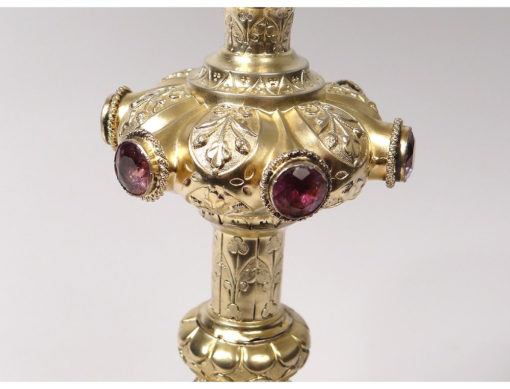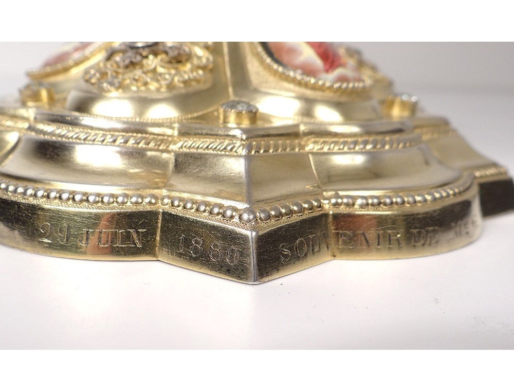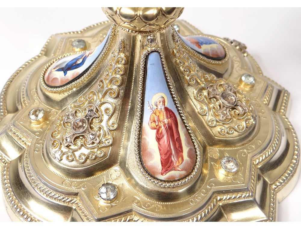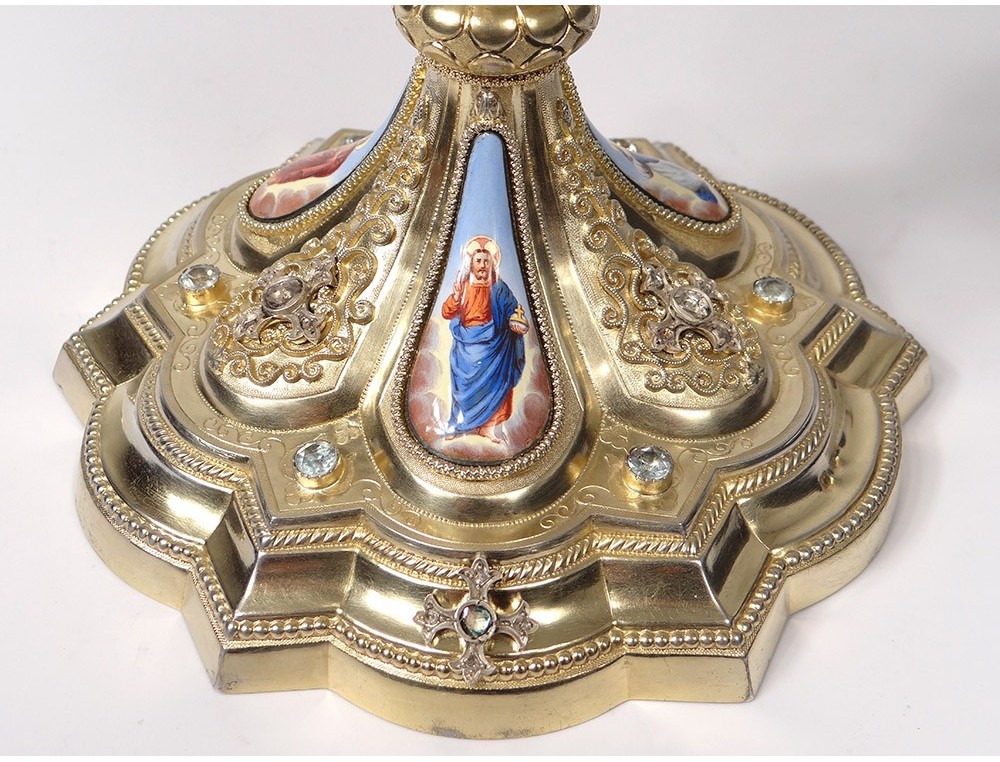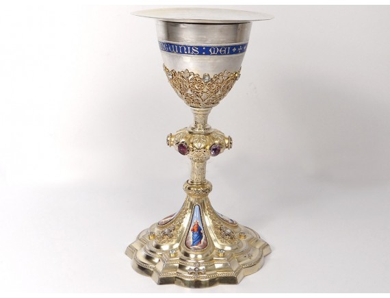 Chalice and paten in Vermilion money chased and filigree floral and plant motifs, decorated with small stones (Rhine and amethyst) and medallions of polychrome enamels depicting Jesus in Glory and Saints, punch Minerva (1st title) and punch Chevron goldsmith *, of XIXth century.