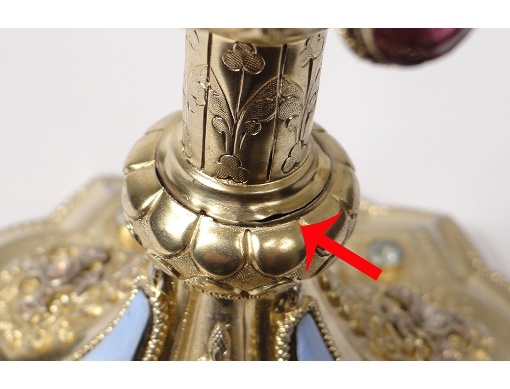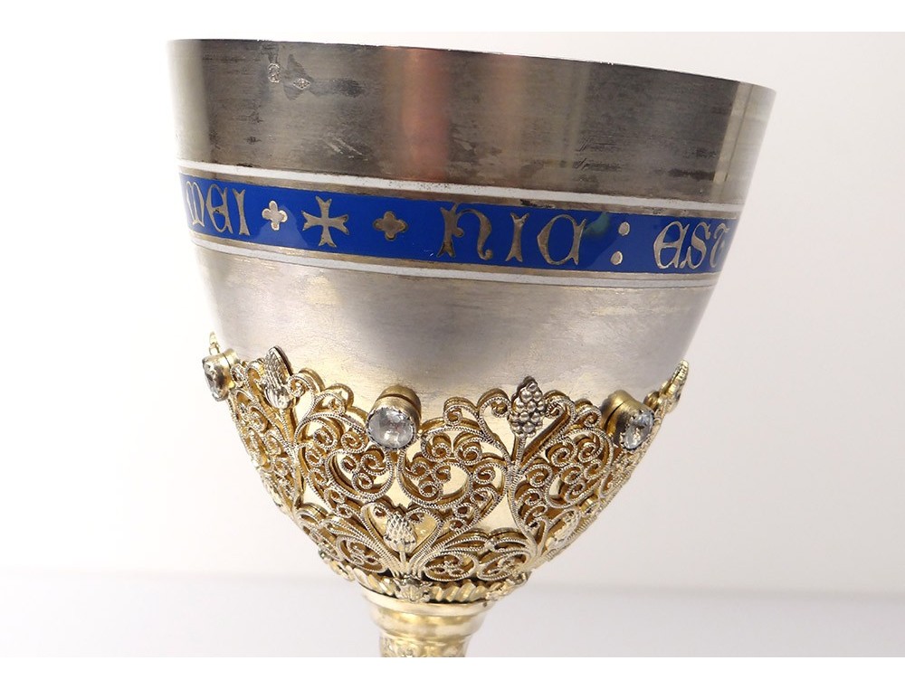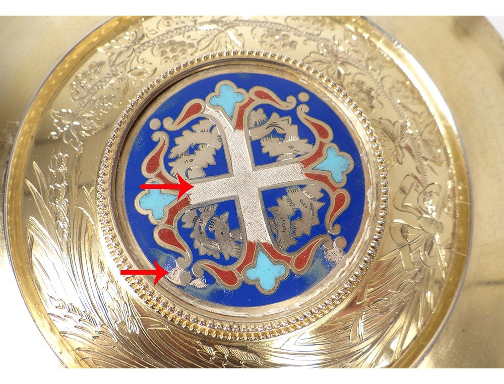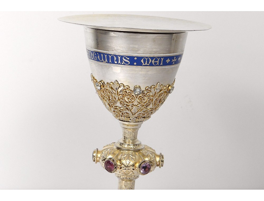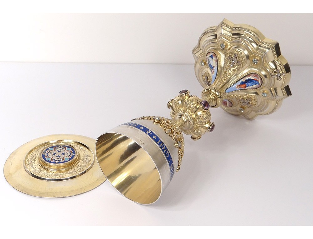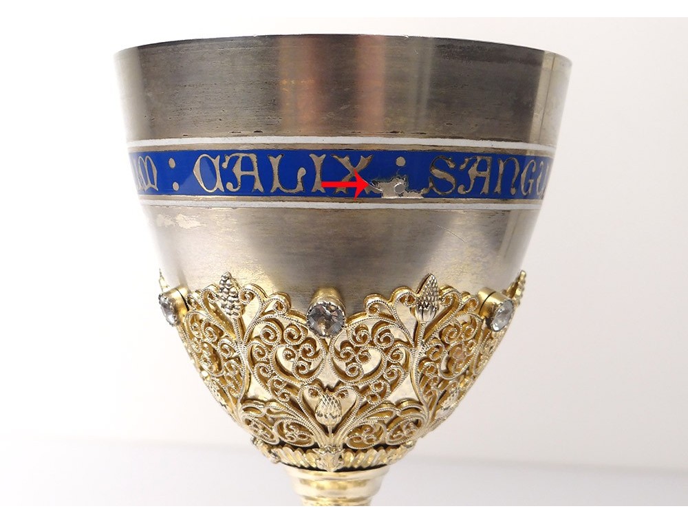 A note: slight gap between the node of the foot and the barrel (the chalice sometimes seems a little bent), some wear and lack of enamels (on the bowl and paten), the gilt bowl is worn, a stone on the foot is broken, tiny shocks and strains on the paten, wear and scratches time, see pictures (red foèches).