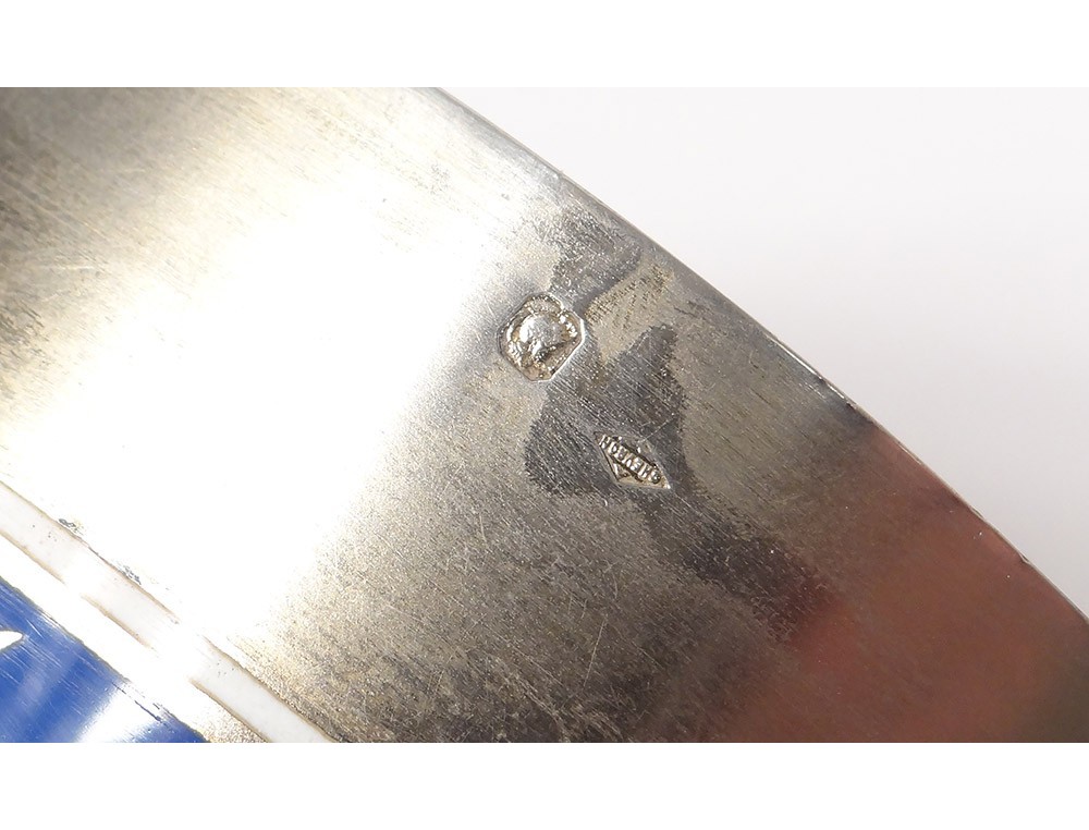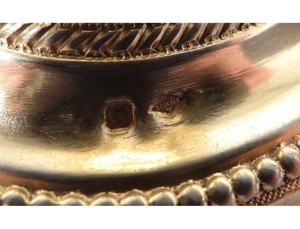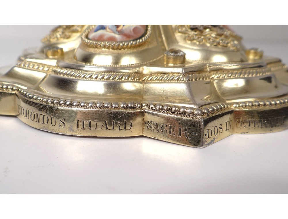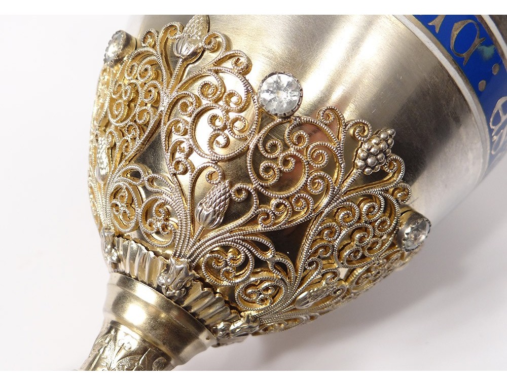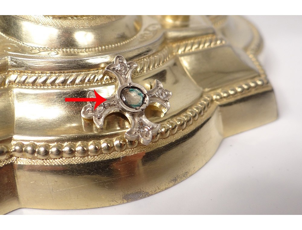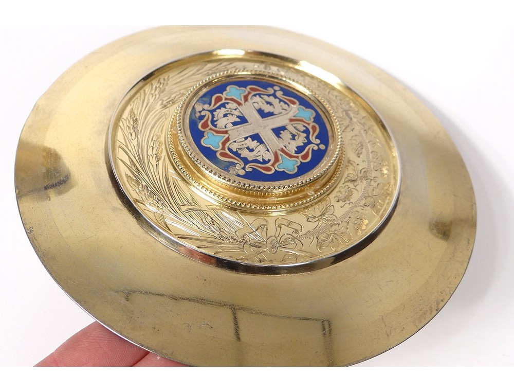 A note: slight gap between the node of the foot and the barrel (the chalice sometimes seems a little bent), some wear and lack of enamels (on the bowl and paten), the gilt bowl is worn, a stone on the foot is broken, tiny shocks and strains on the paten, wear and scratches time, see pictures (red foèches).