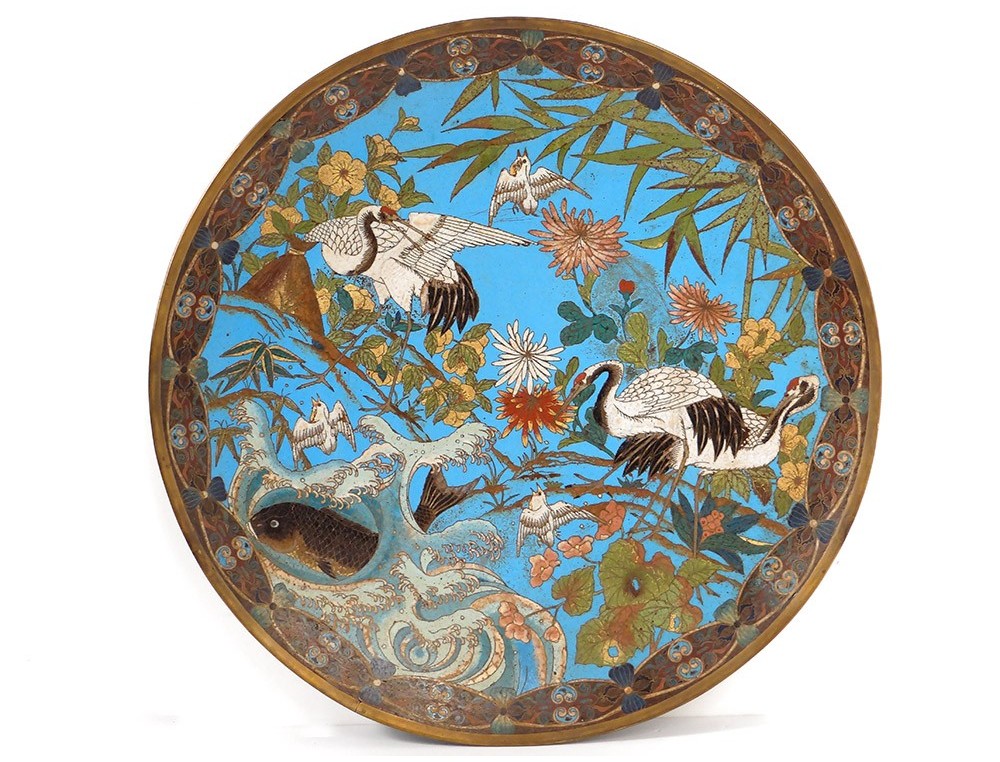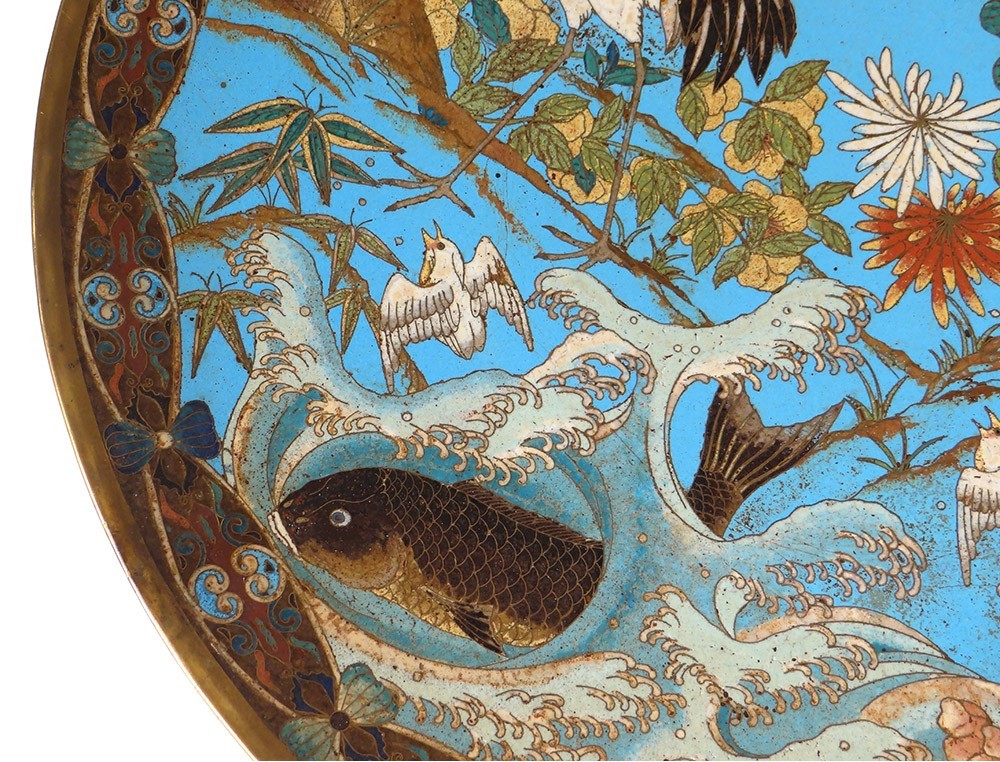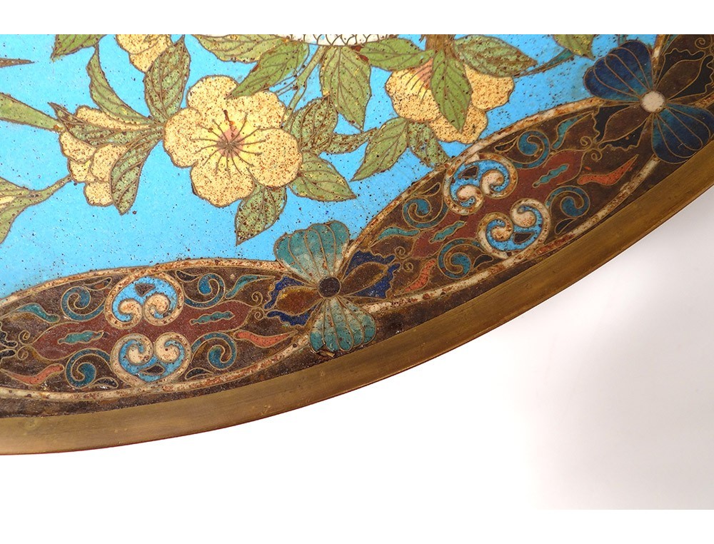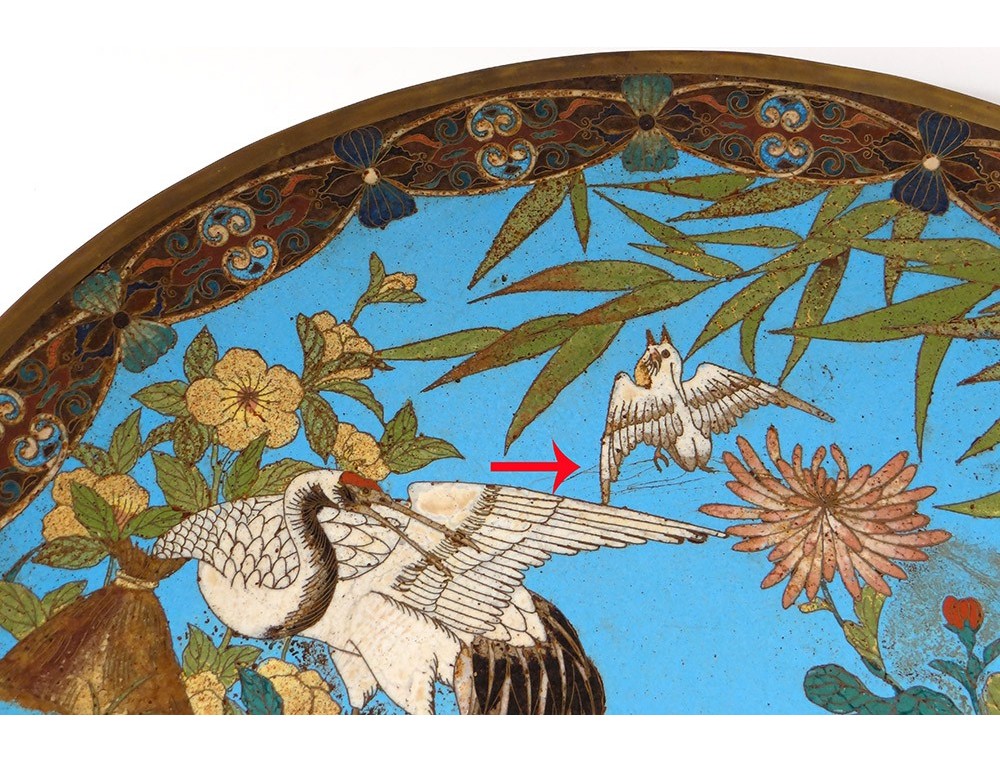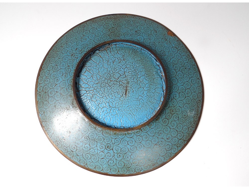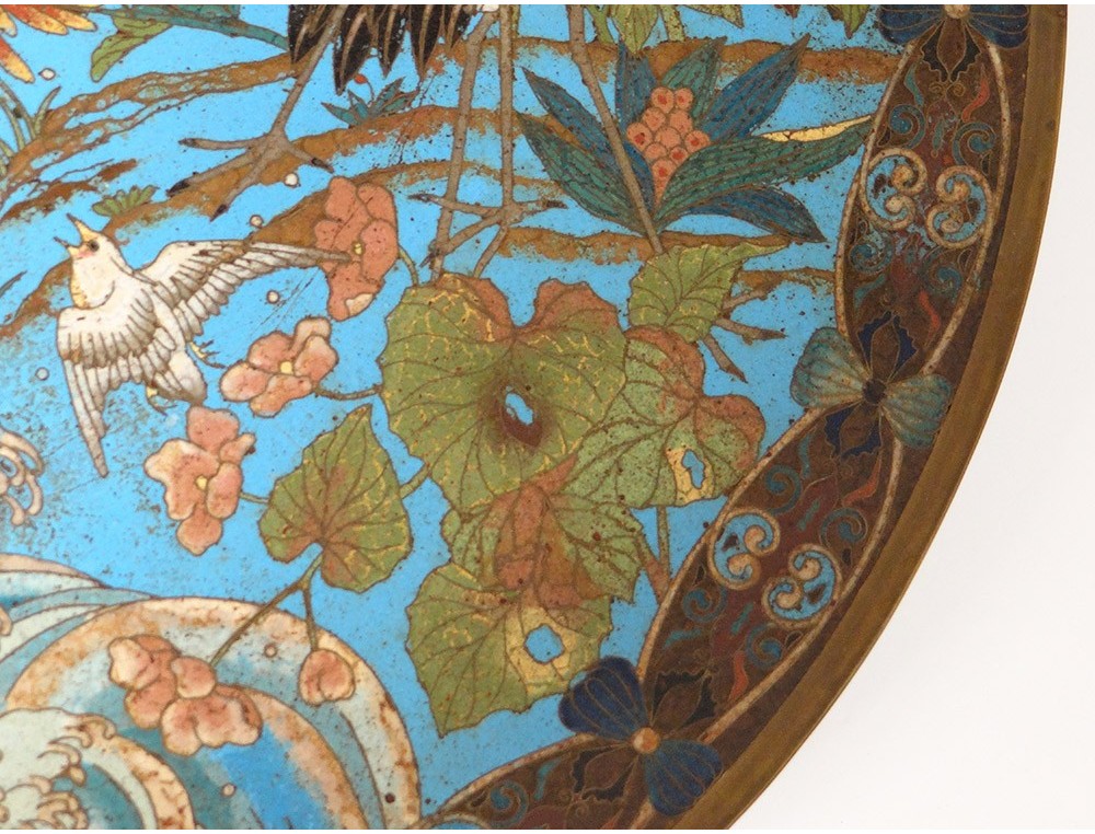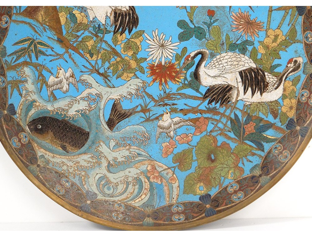 Large decorative dish in bronze and cloisonné enamels, with rich decoration of three cranes of Japan around a pond in which we see a beautiful fish (a carp), around them twirl little birds, all in a flowery landscape ( bamboo, chrysanthemums ...), from Japan, XIXth century.