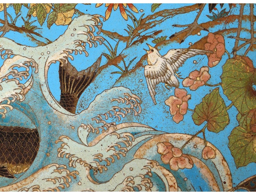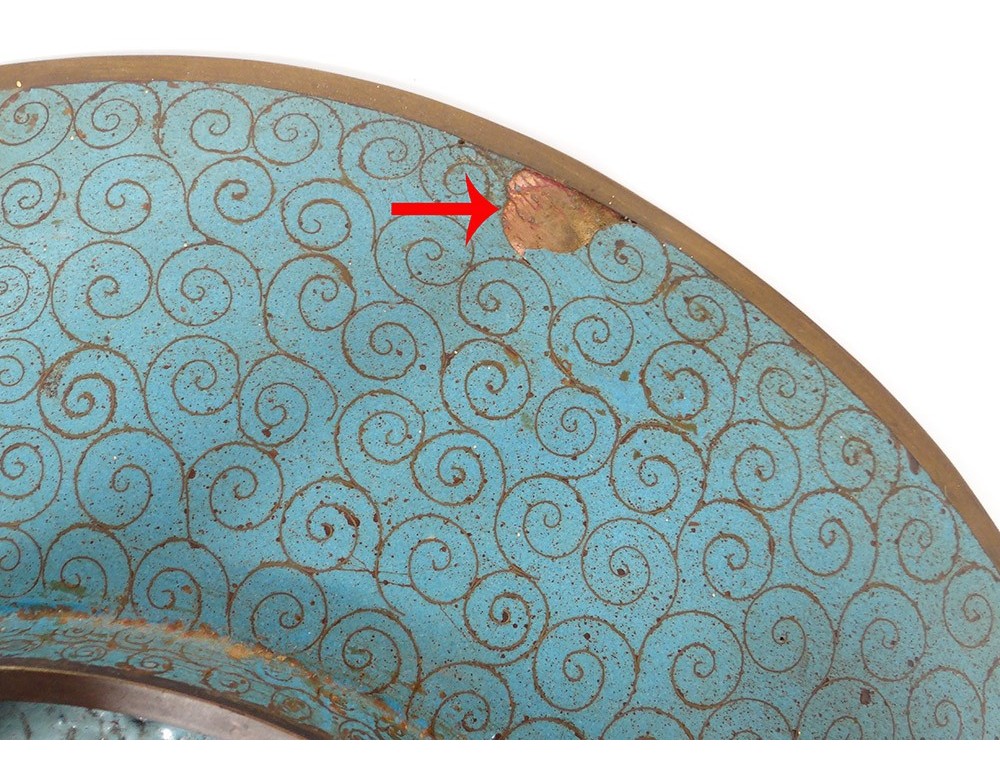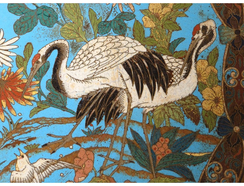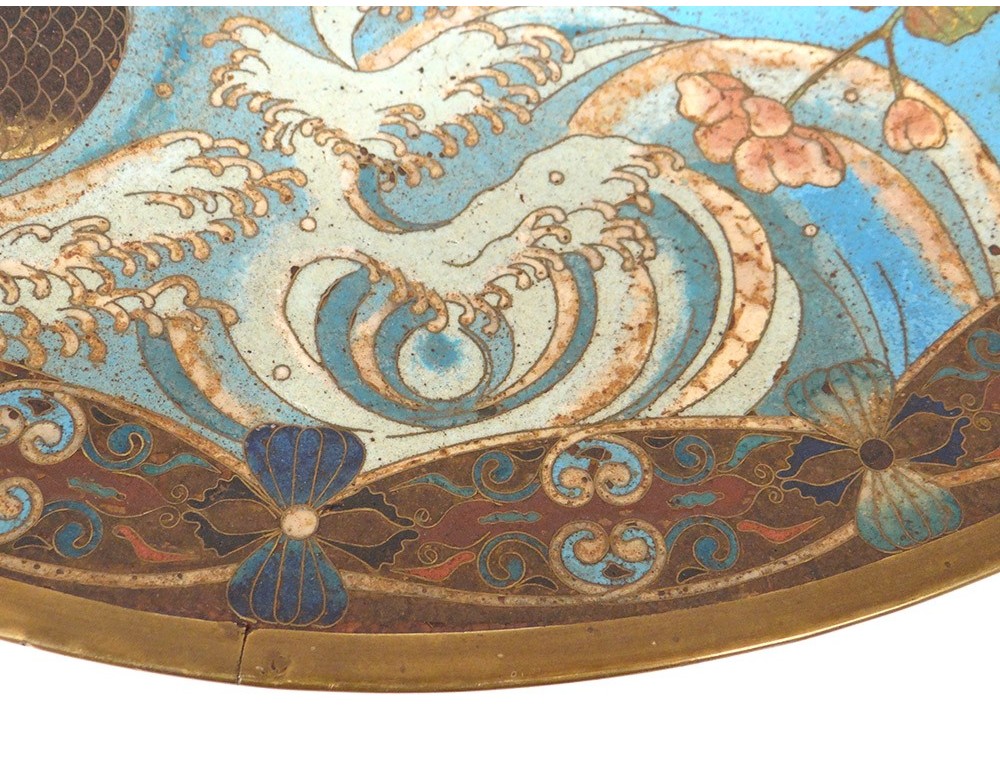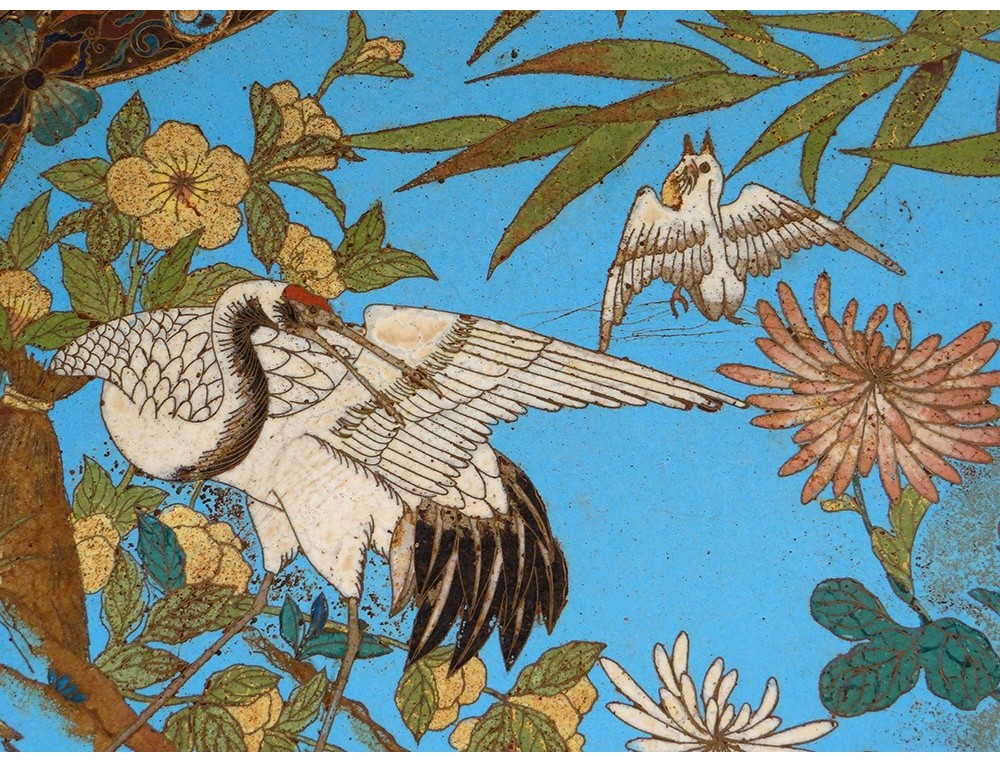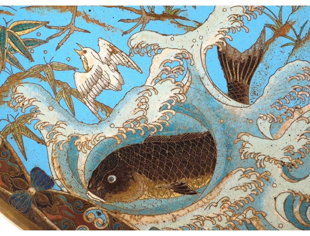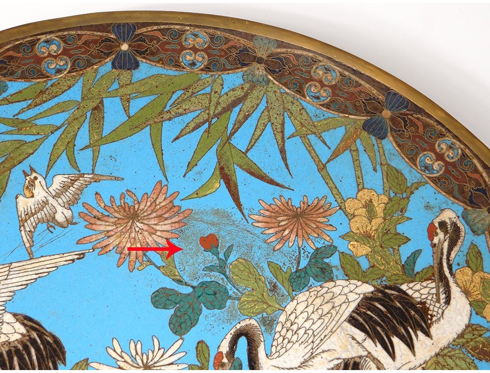 Large decorative dish in bronze and cloisonné enamels, with rich decoration of three cranes of Japan around a pond in which we see a beautiful fish (a carp), around them twirl little birds, all in a flowery landscape ( bamboo, chrysanthemums ...), from Japan, XIXth century.