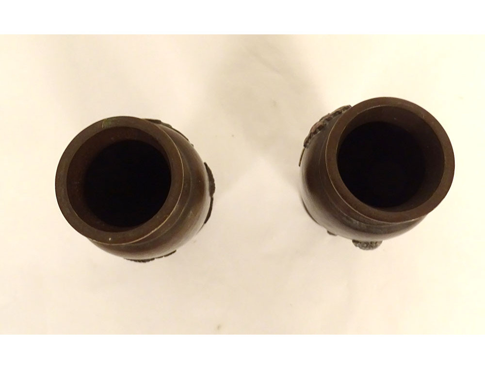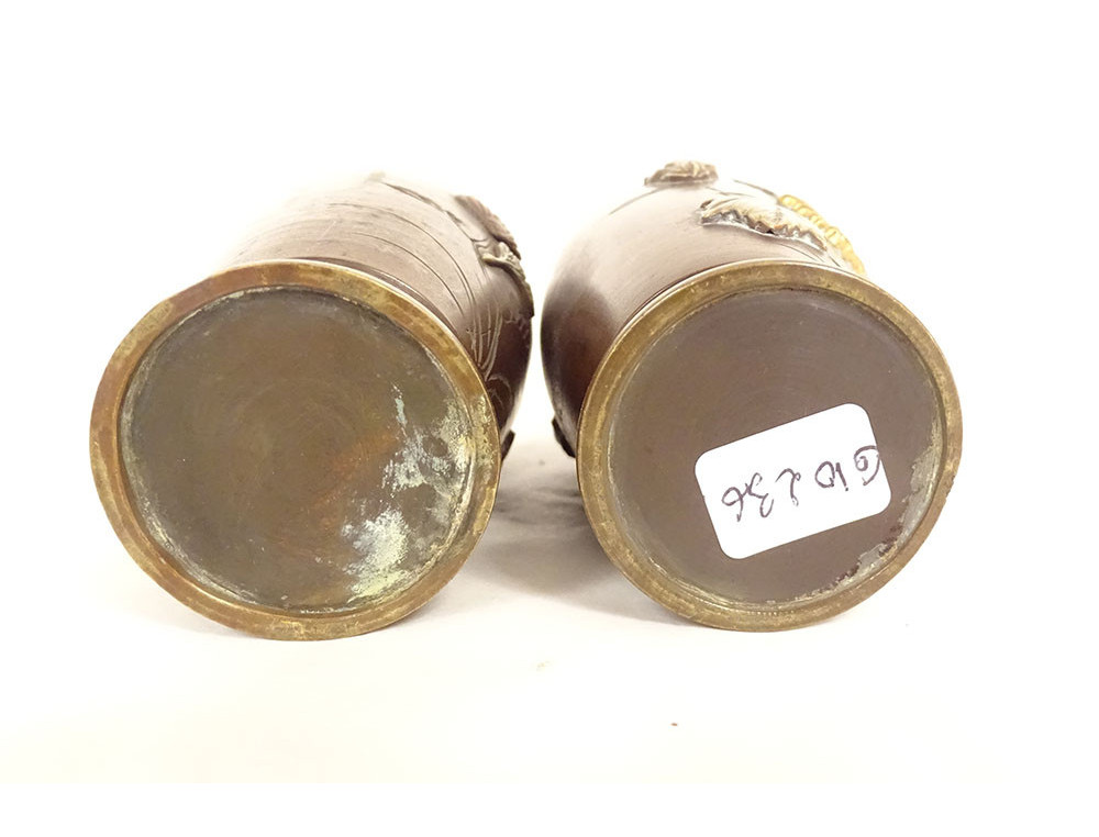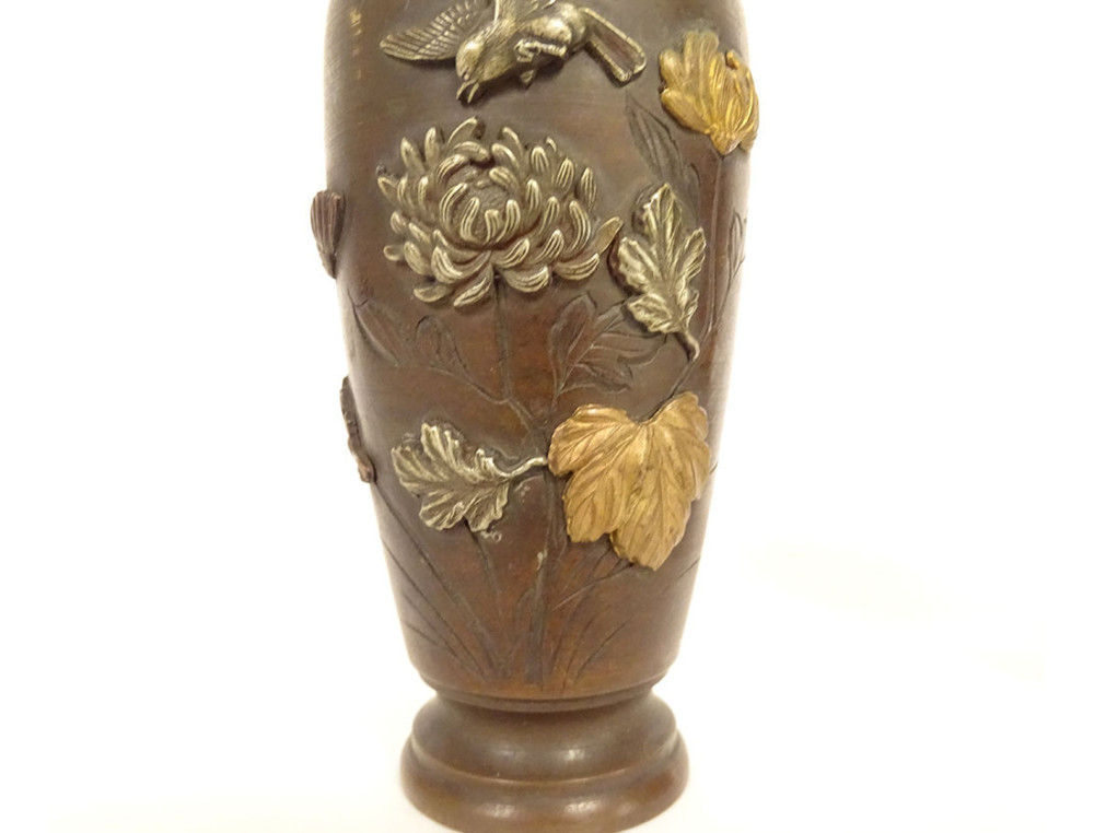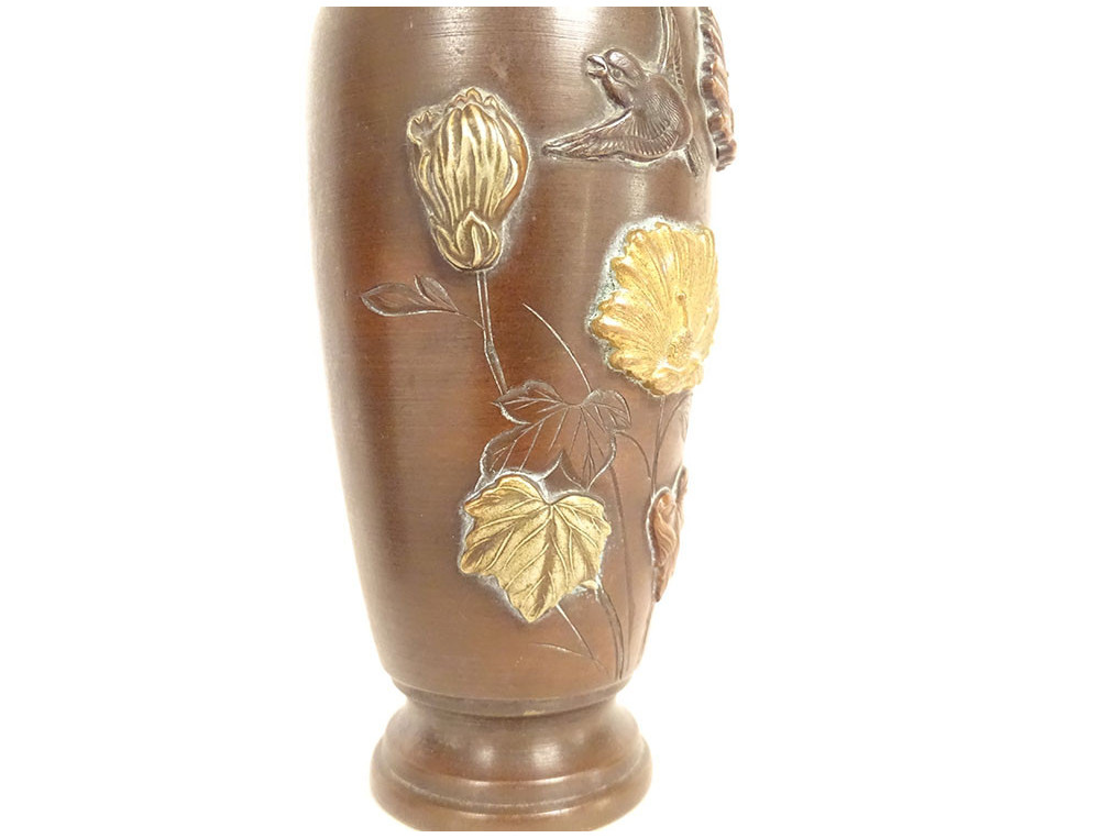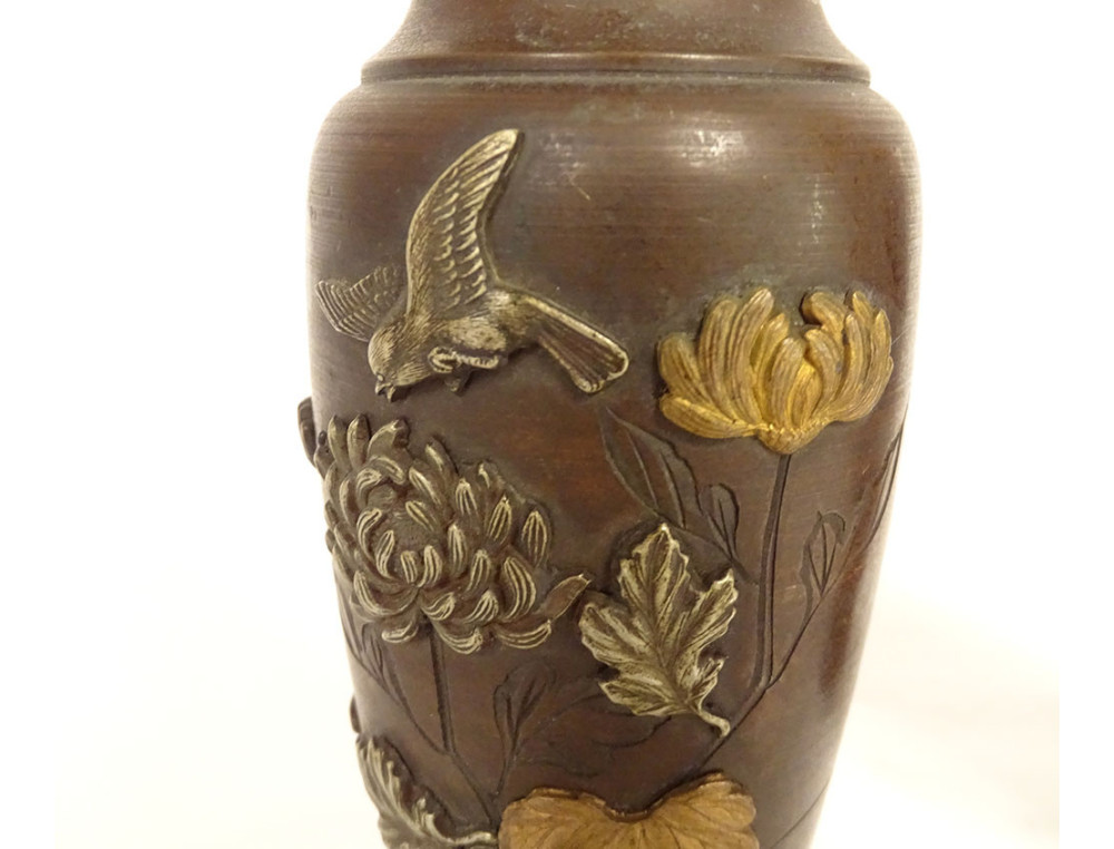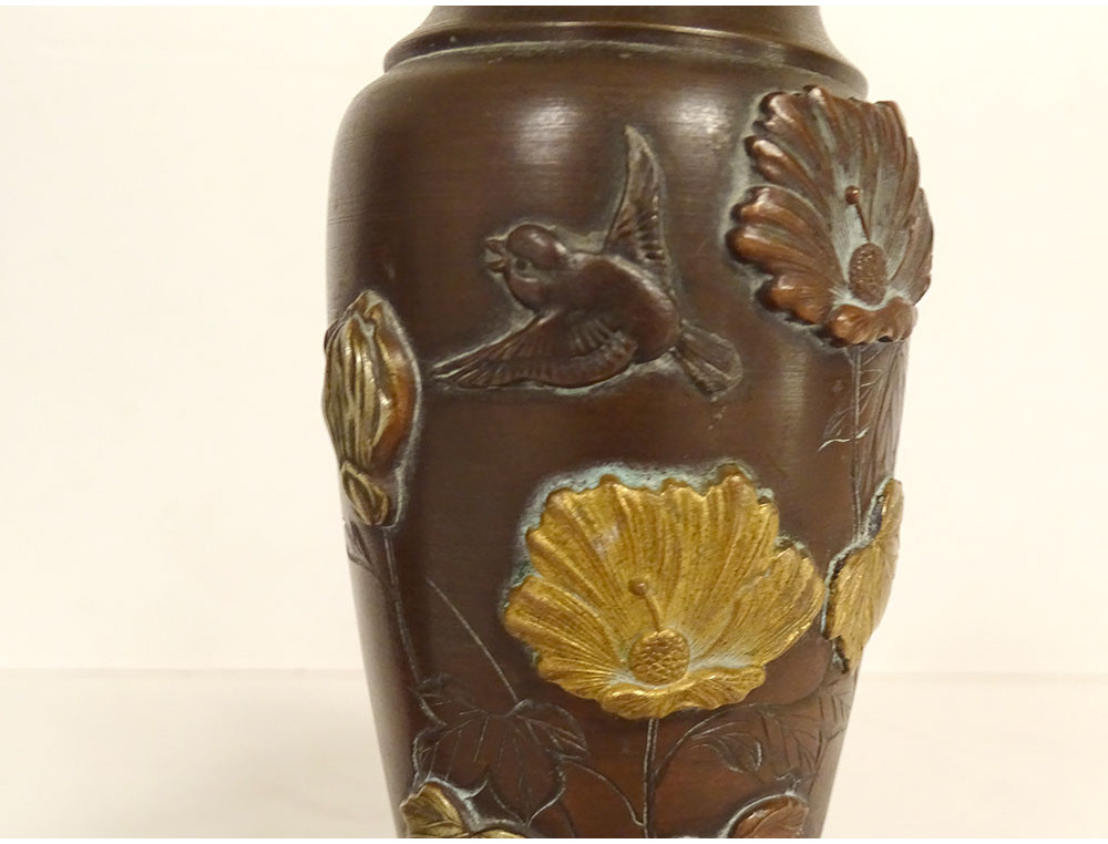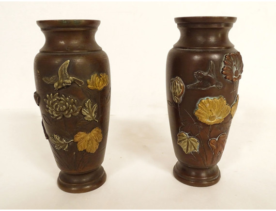 Pair of small Japanese baluster-shaped vases, in Shibuichi* bronze enhanced with gilding, decorated with birds twirling among flowers (peonies, etc.) and foliage, from Japan, Meiji period, late 19th century.
