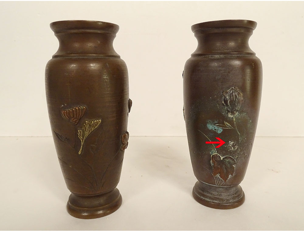 Please note: one vase is slightly damaged at the back (see rough arrow), scratches and wear from time, see photos.