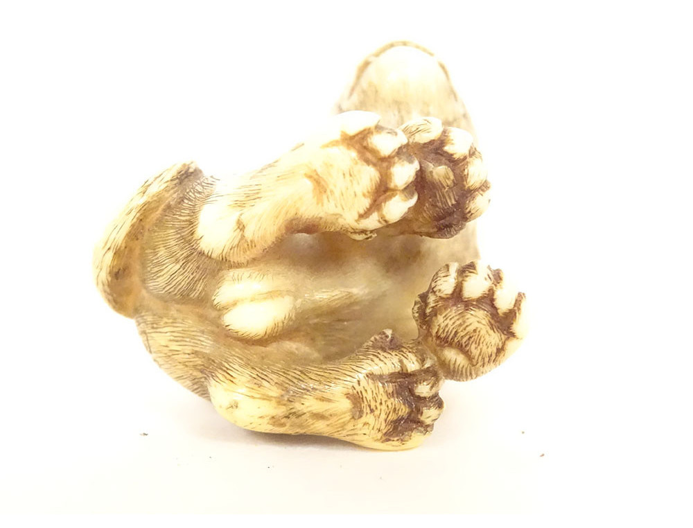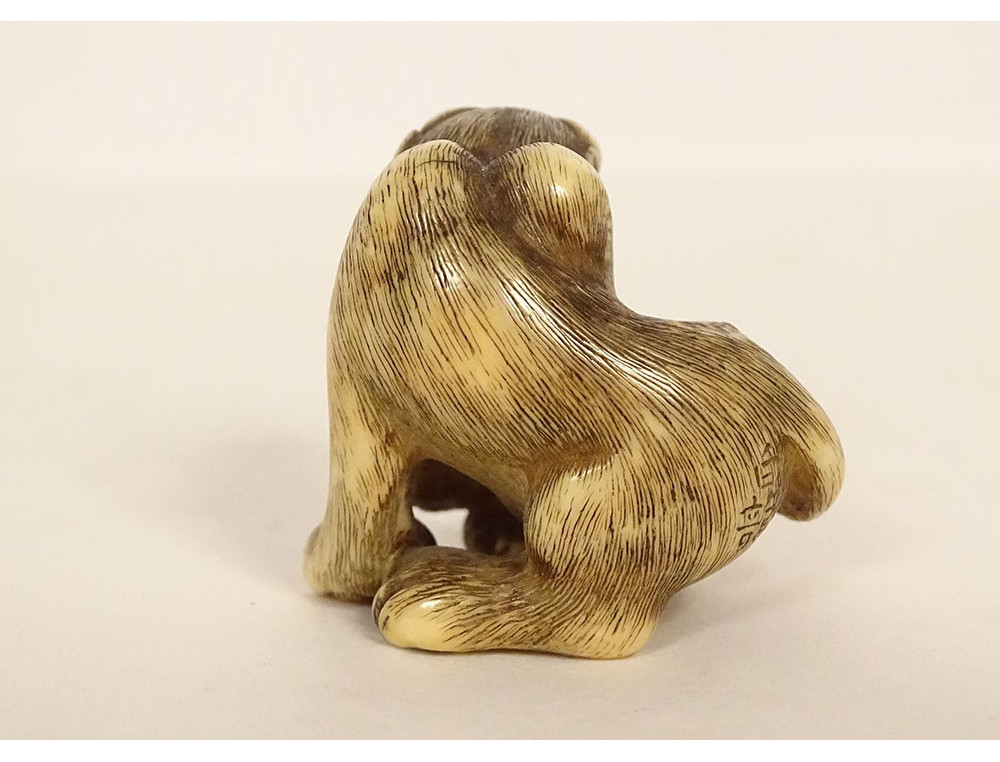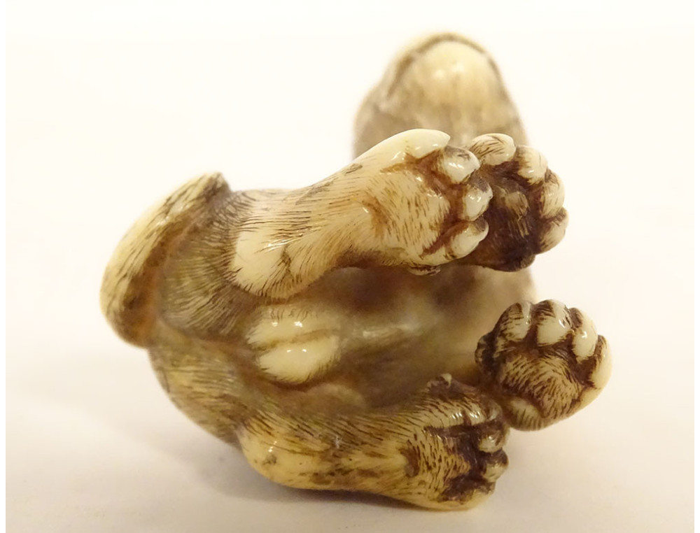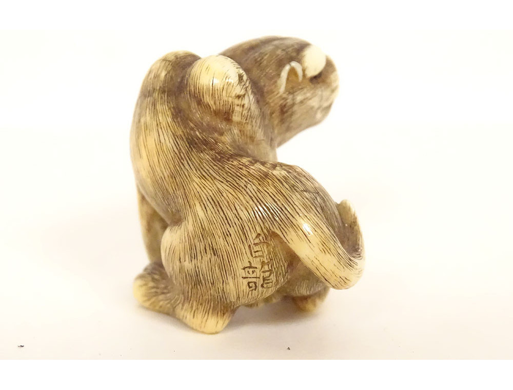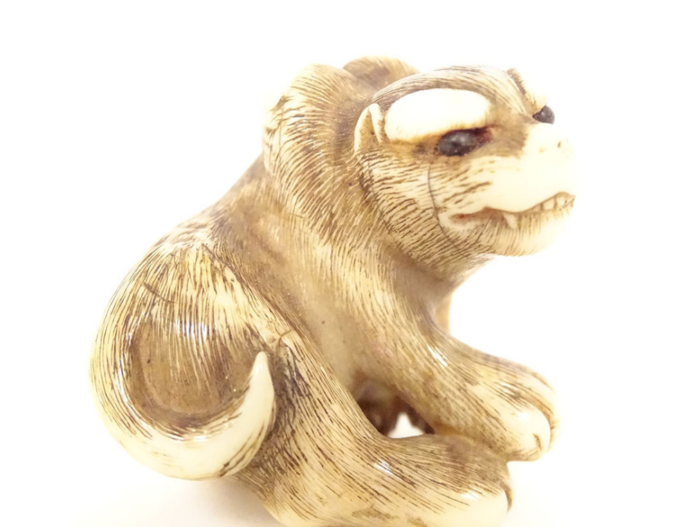 Small Netsuke* sculpture in finely carved ivory depicting a tiger feeling threatened (ears back and threatening mouth), signed by Unsho Hakuryu**, from the Edo period, mid-19th century.