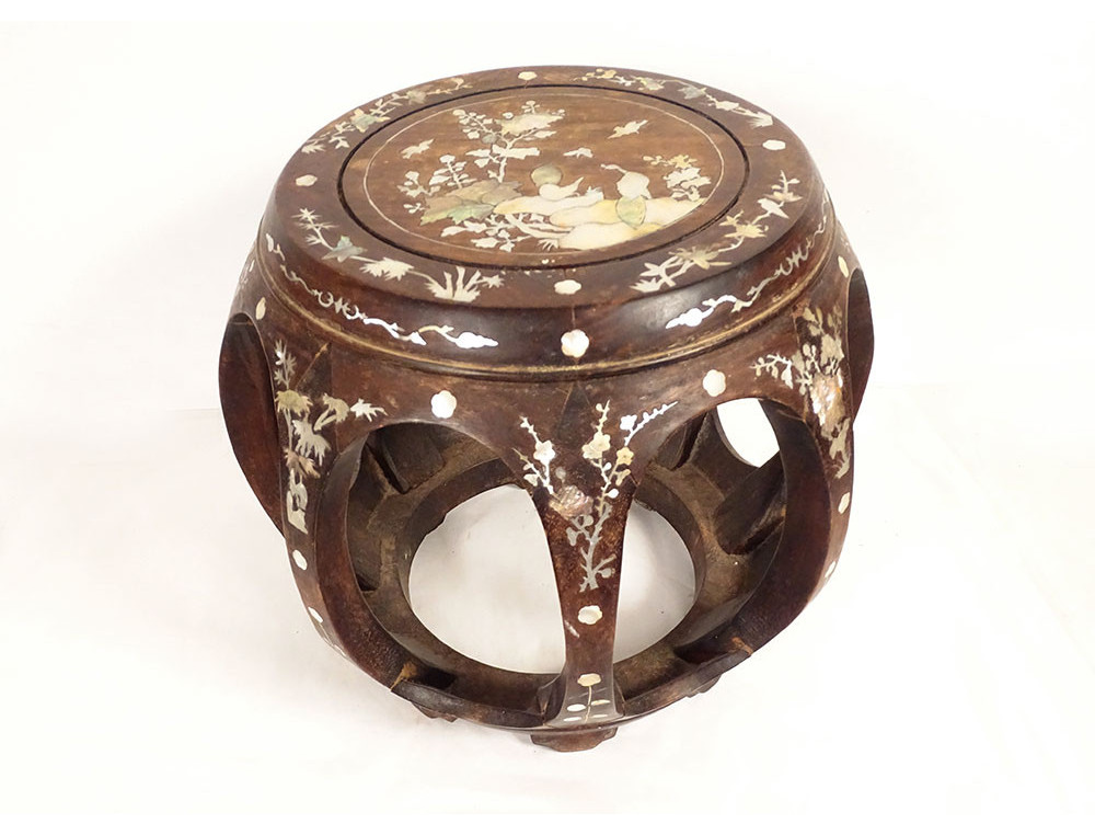 Small side table that can be used as a stool or small side table, made of exotic wood decorated with mother-of-pearl inlays, with a rich decoration of flowers and foliage, as well as a landscape with large trees and birds on the top, origin Vietnam, from the late 19th-early 20th centuries.