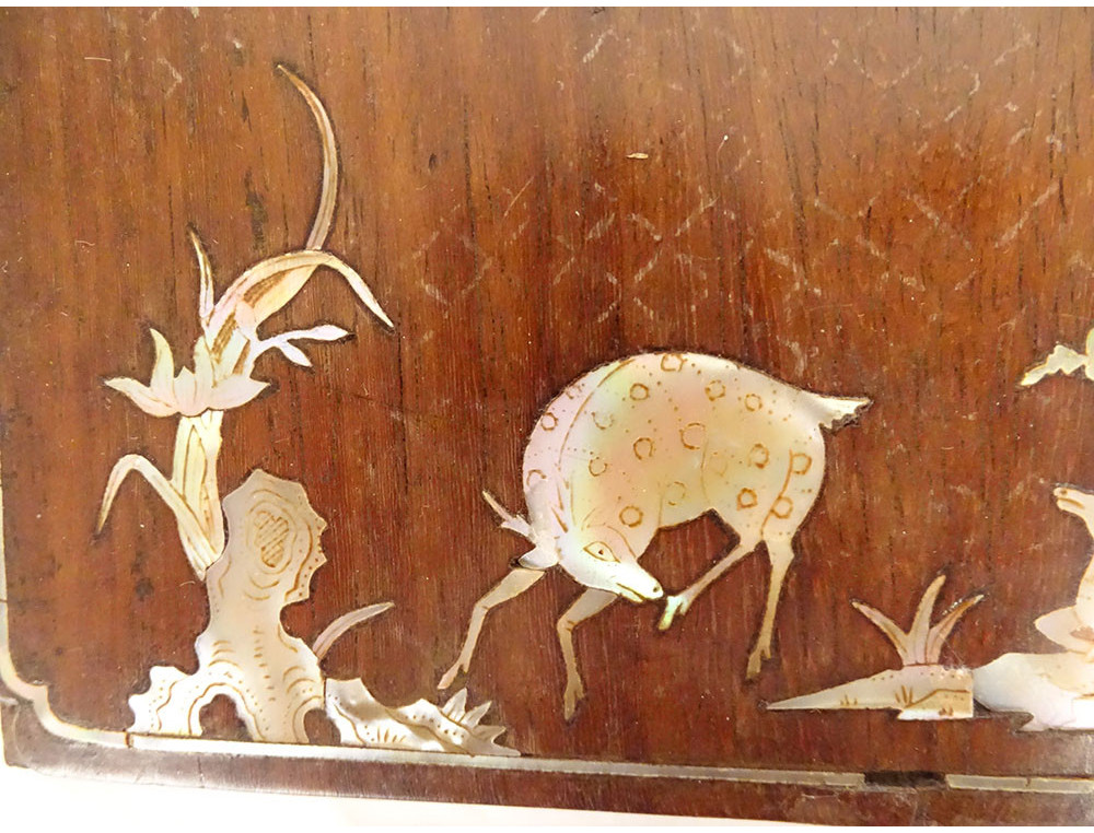 Pair of decorative ironwood panels with mother-of-pearl inlays, one decorated with birds on a flowering tree; the other with deer in a landscape; with inscriptions forming poems on both panels, originating from Indochina or Vietnam, dating from the late 19th century.