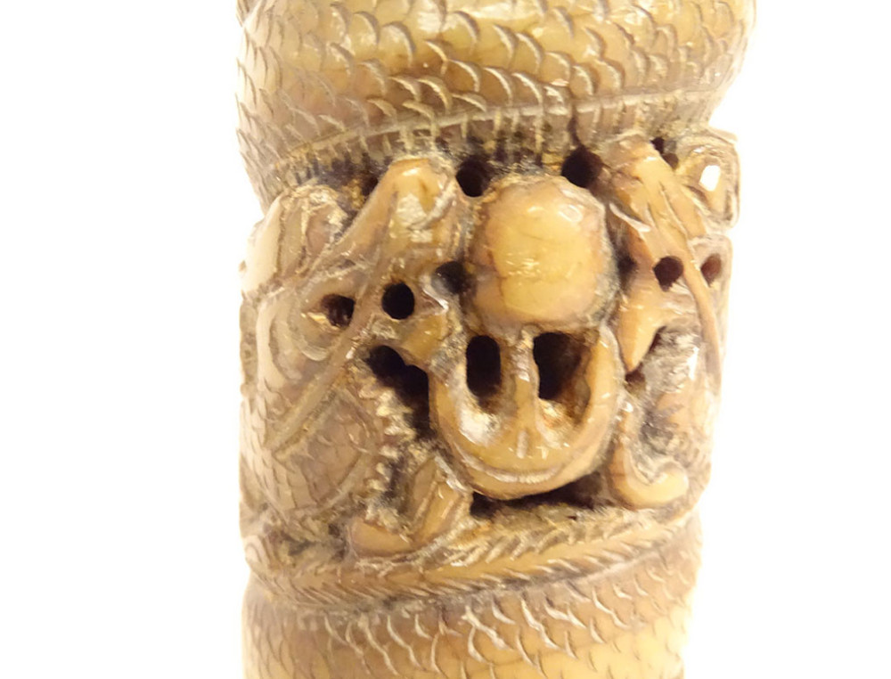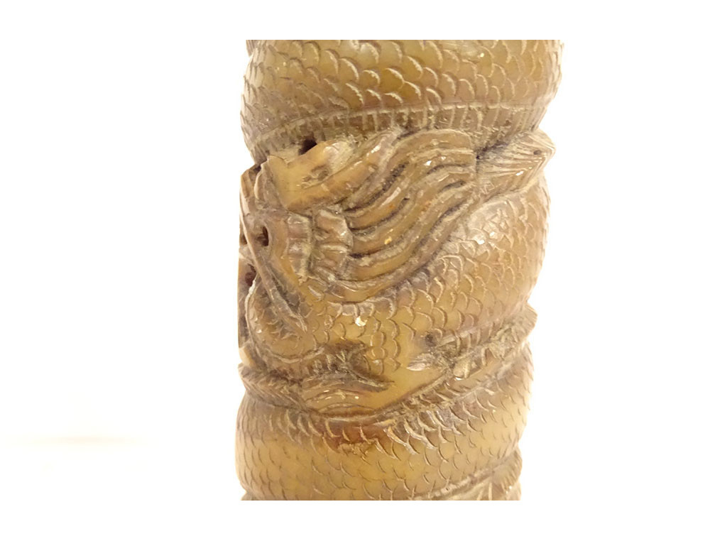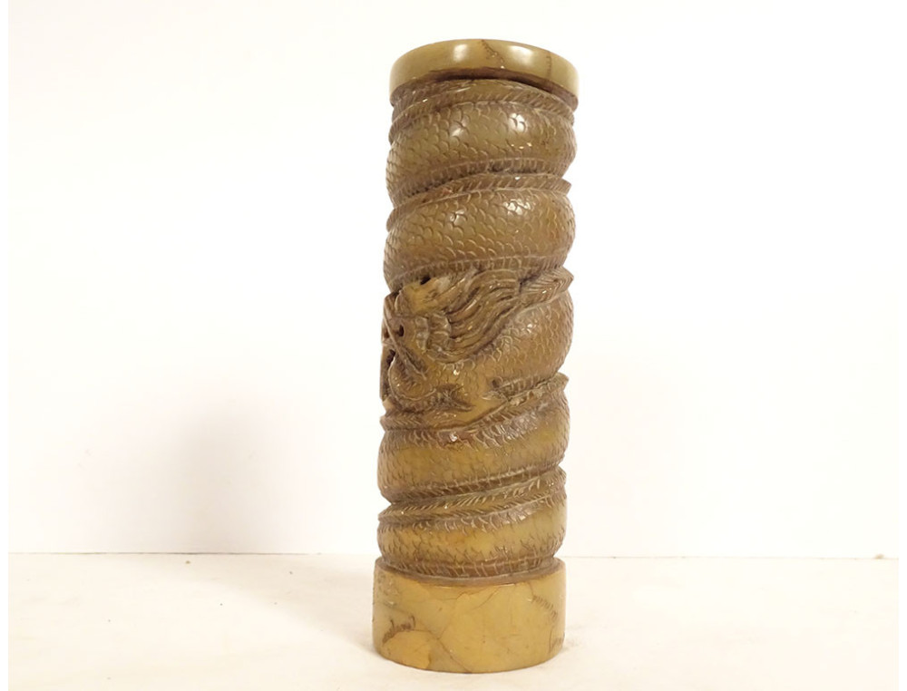 Cylindrical Chinese seal or stamp, carved from hard stone with a decoration of two dragons chasing the sacred pearl, their bodies coiled along the stamp, the seal is decorated with ideograms, dating from the mid-20th century.