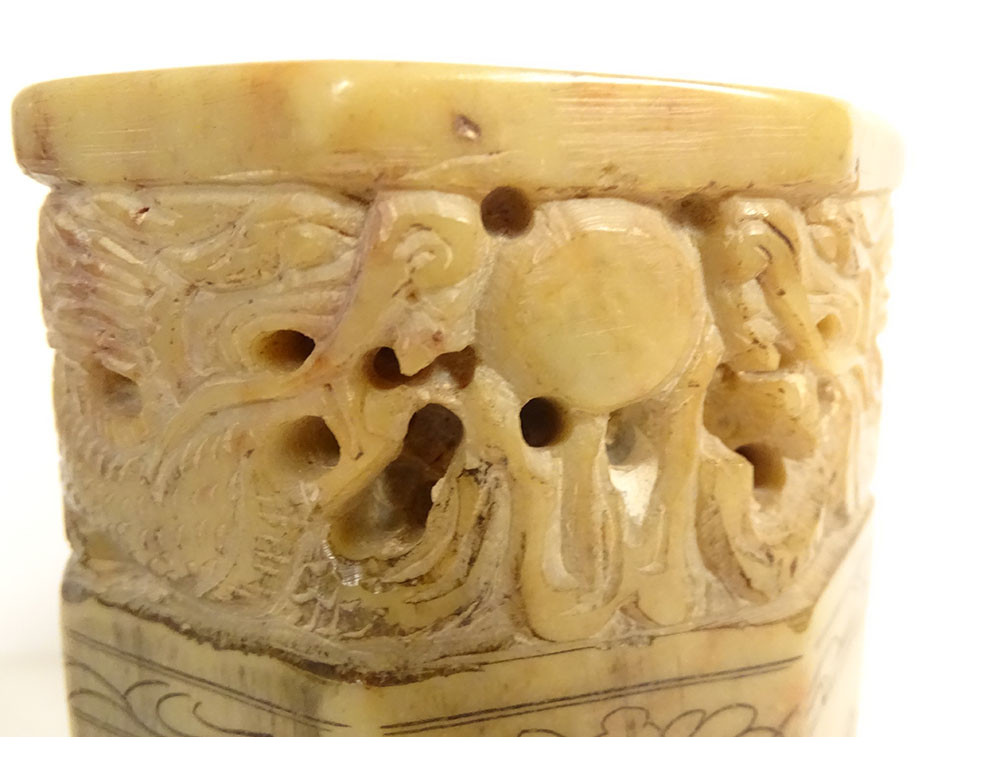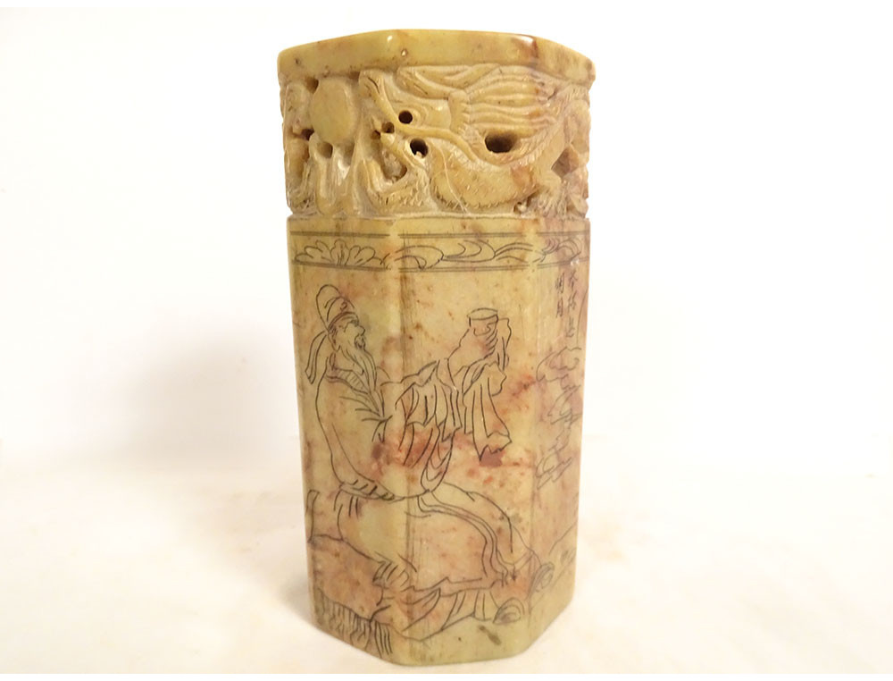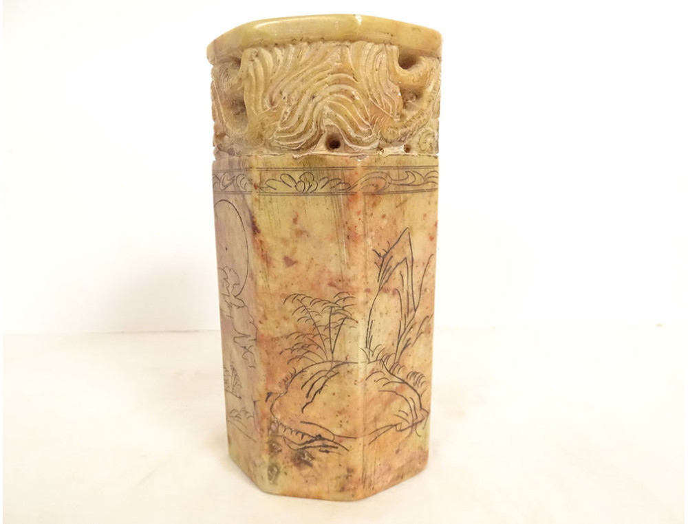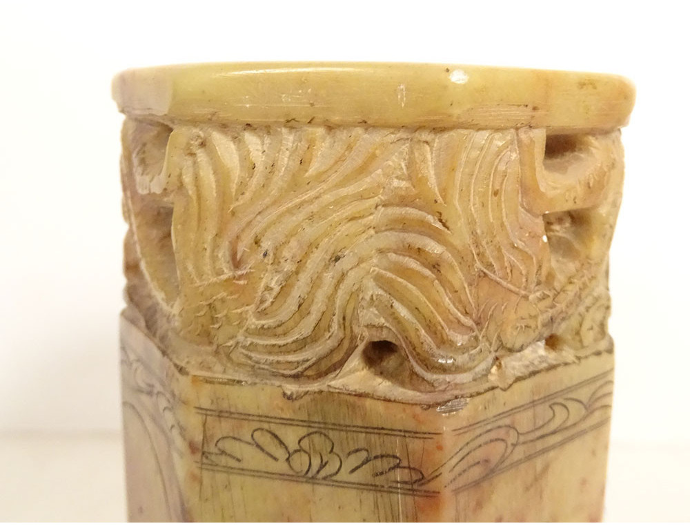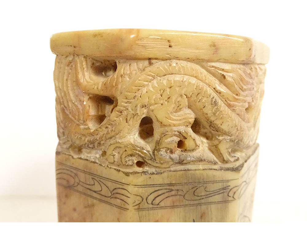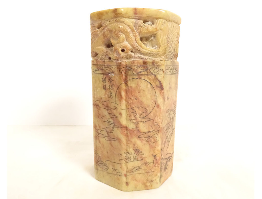 Cylindrical Chinese seal or stamp, carved from hard stone with a decoration of two dragons chasing the sacred pearl, their bodies coiled along the stamp, the seal is decorated with ideograms, dating from the mid-20th century.