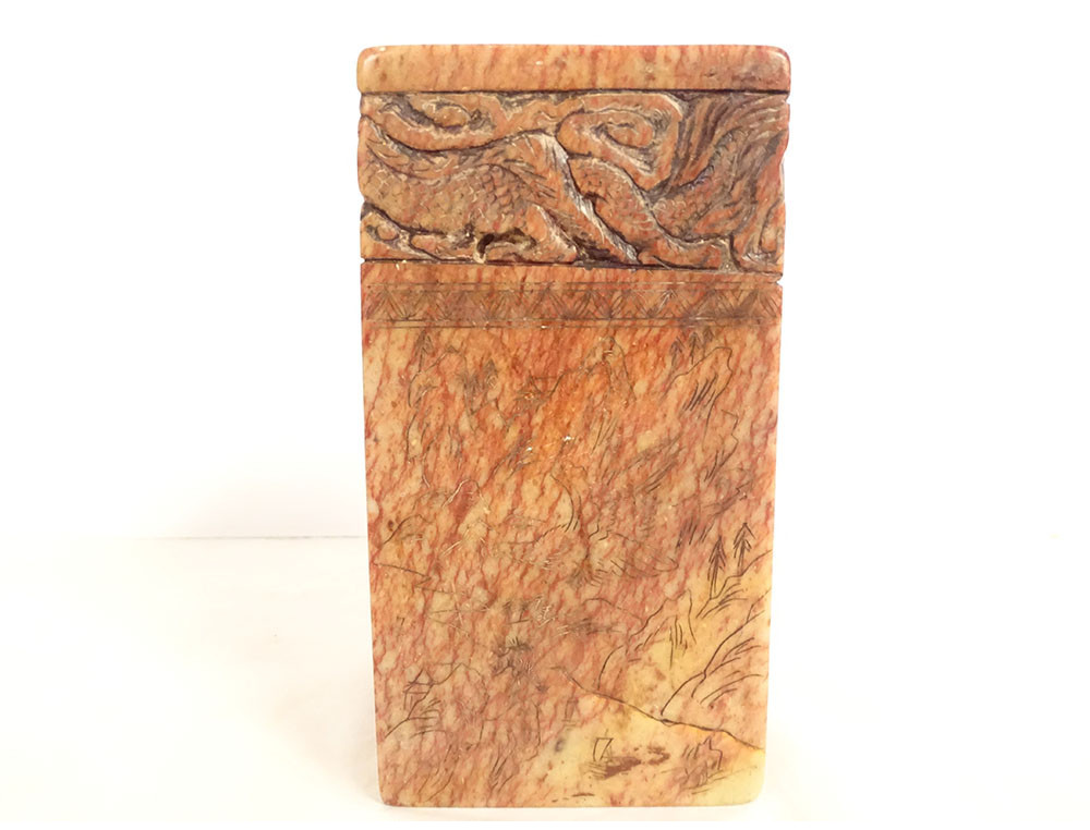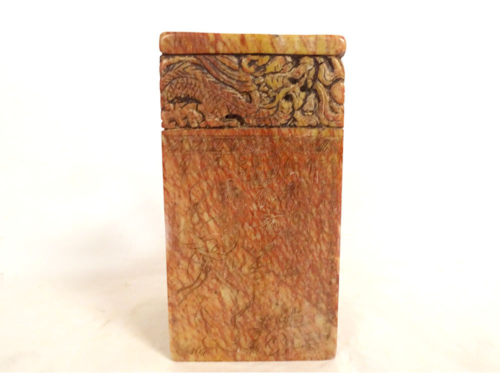 Cylindrical Chinese seal or stamp, carved from hard stone with a decoration of two dragons chasing the sacred pearl, their bodies coiled along the stamp, the seal is decorated with ideograms, dating from the mid-20th century.