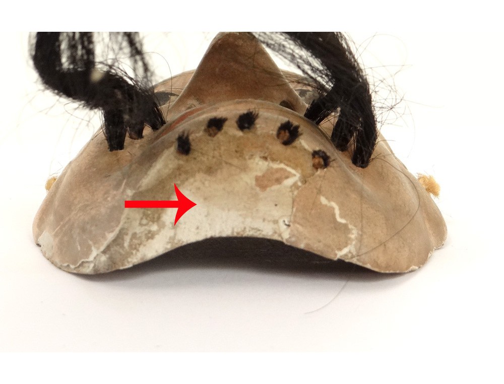 This mask is in good condition. It lacks the hairs of the beard. The eyes and the nostrils are pierced.