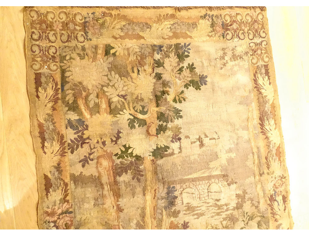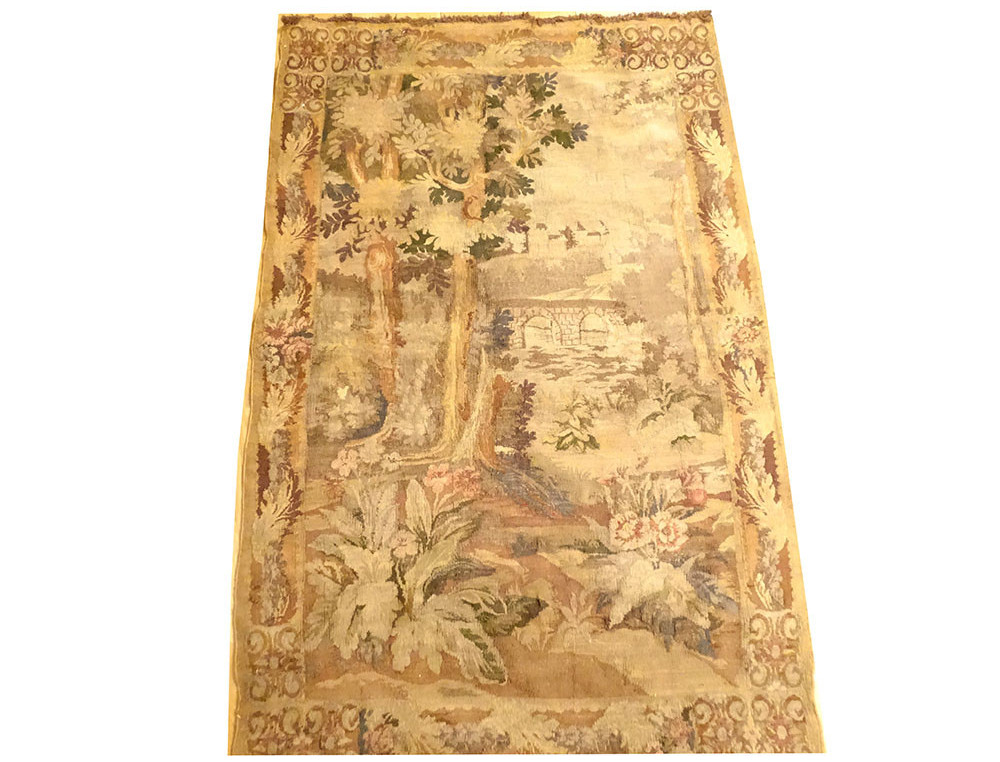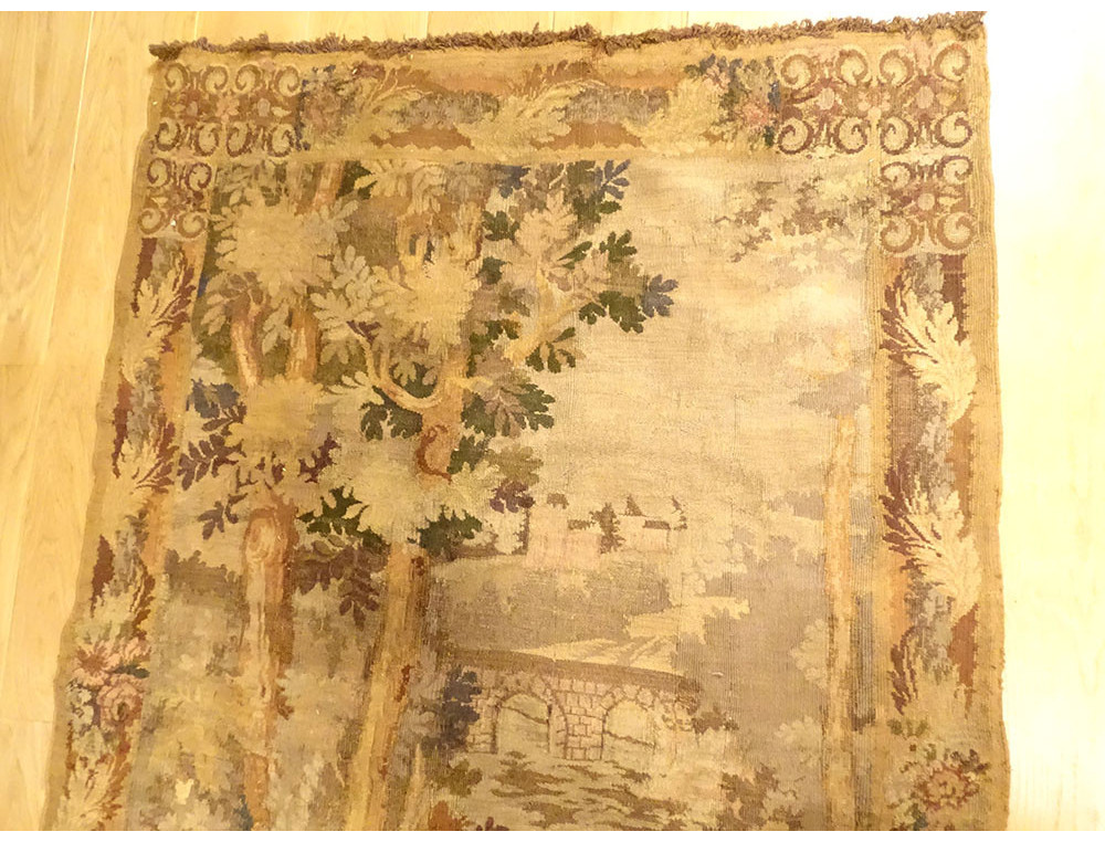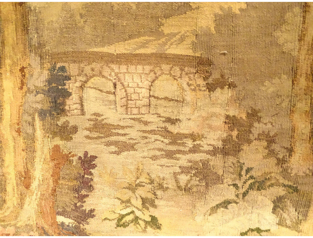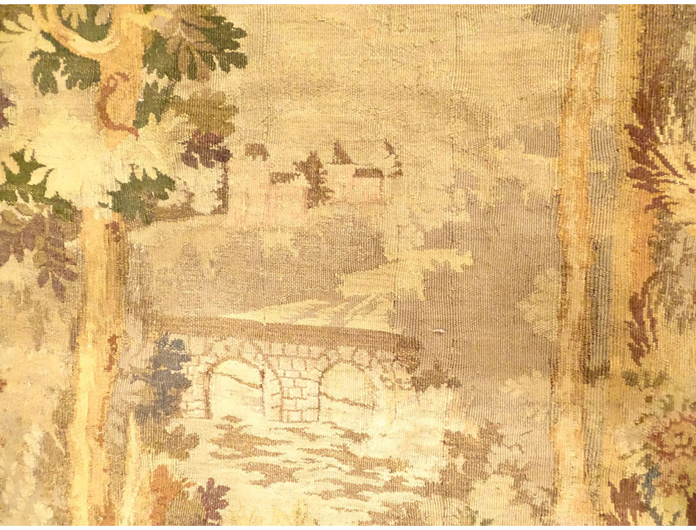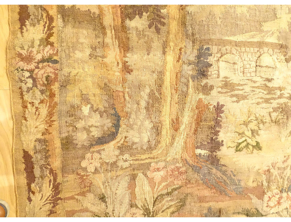 Aubusson tapestry doorway, depicting a green landscape in a park or forest decorated with flowers; in the background we can see a bridge and a manor house or castle, border with plant decoration, from the 18th century.