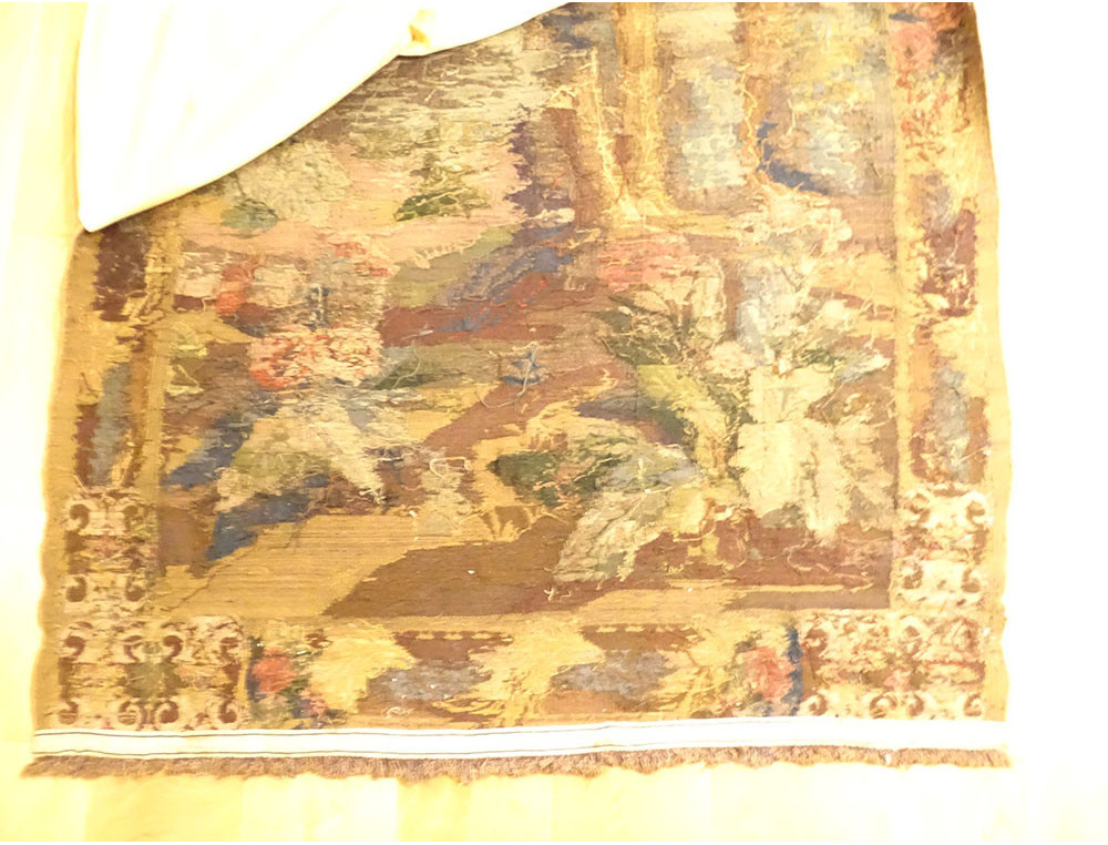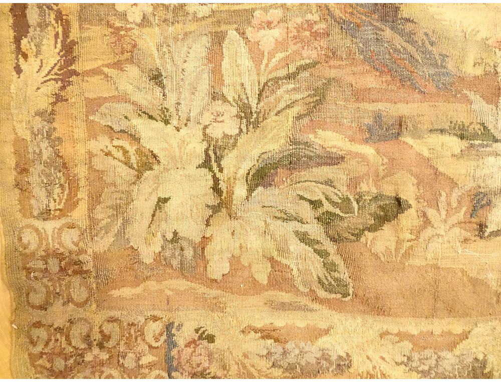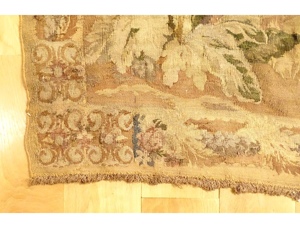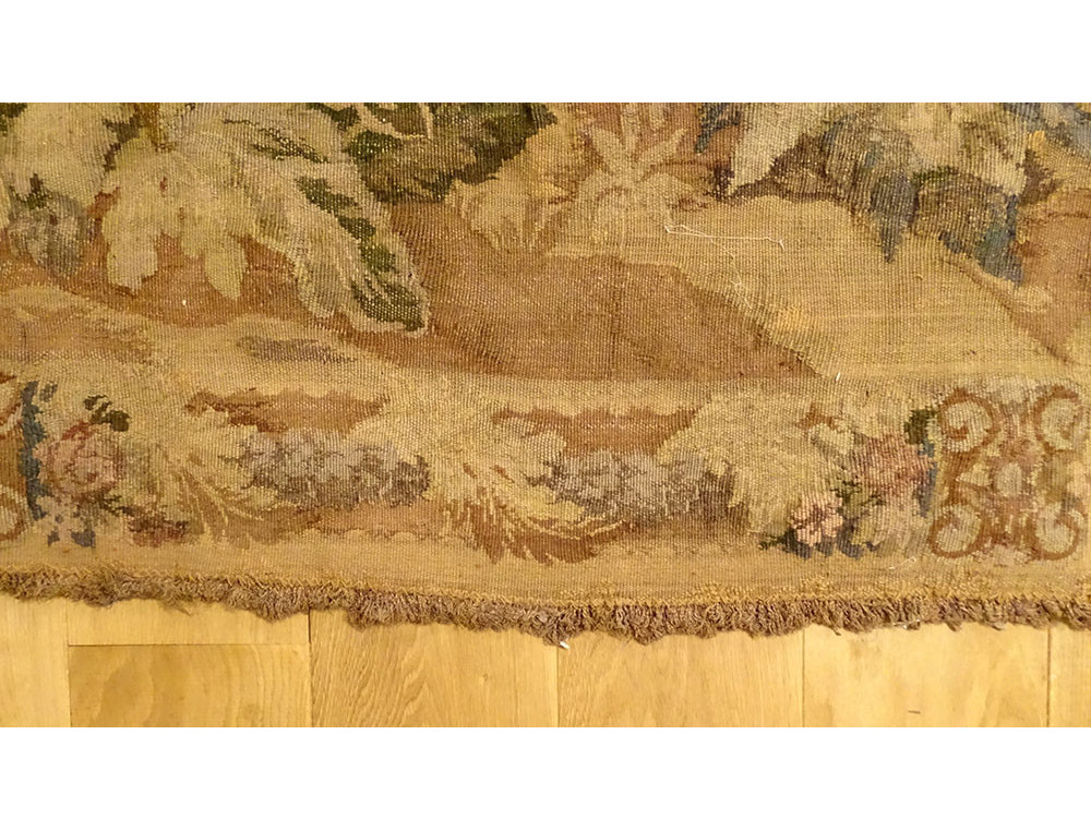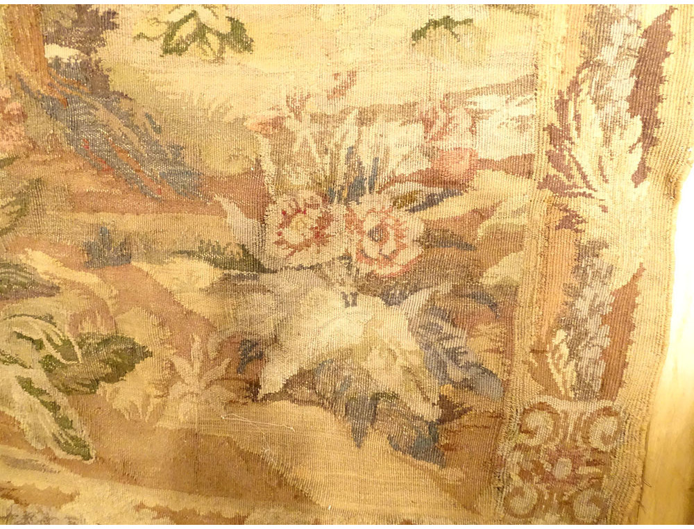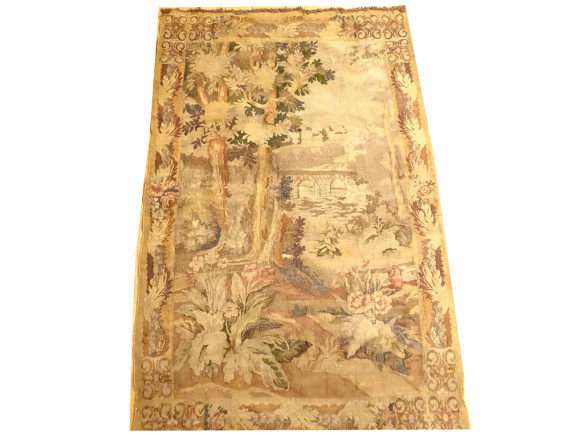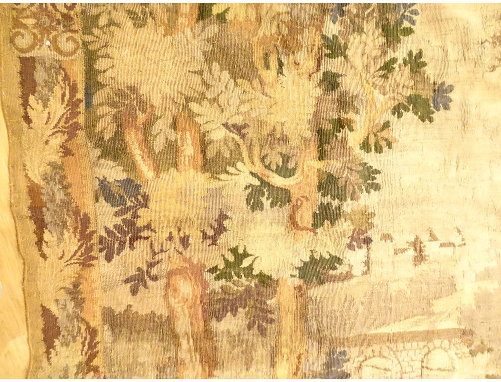 Aubusson tapestry doorway, depicting a green landscape in a park or forest decorated with flowers; in the background we can see a bridge and a manor house or castle, border with plant decoration, from the 18th century.