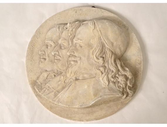 Plaster medallion representing the profile portrait of 3 brothers *: Jean Eudes (1601-1680) Priest, founder of the Eudists, François Eudes de Mézeray (1610-1683), Historiographer of France and Charles Eudes d'Houay, Surgeon, alderman of 'Argentan, inscription "Praedicam, Scribit, Ego Defendam", signed Ch. De Montzey and dated 1854, with its original manufacturing mold, XIXth century.
