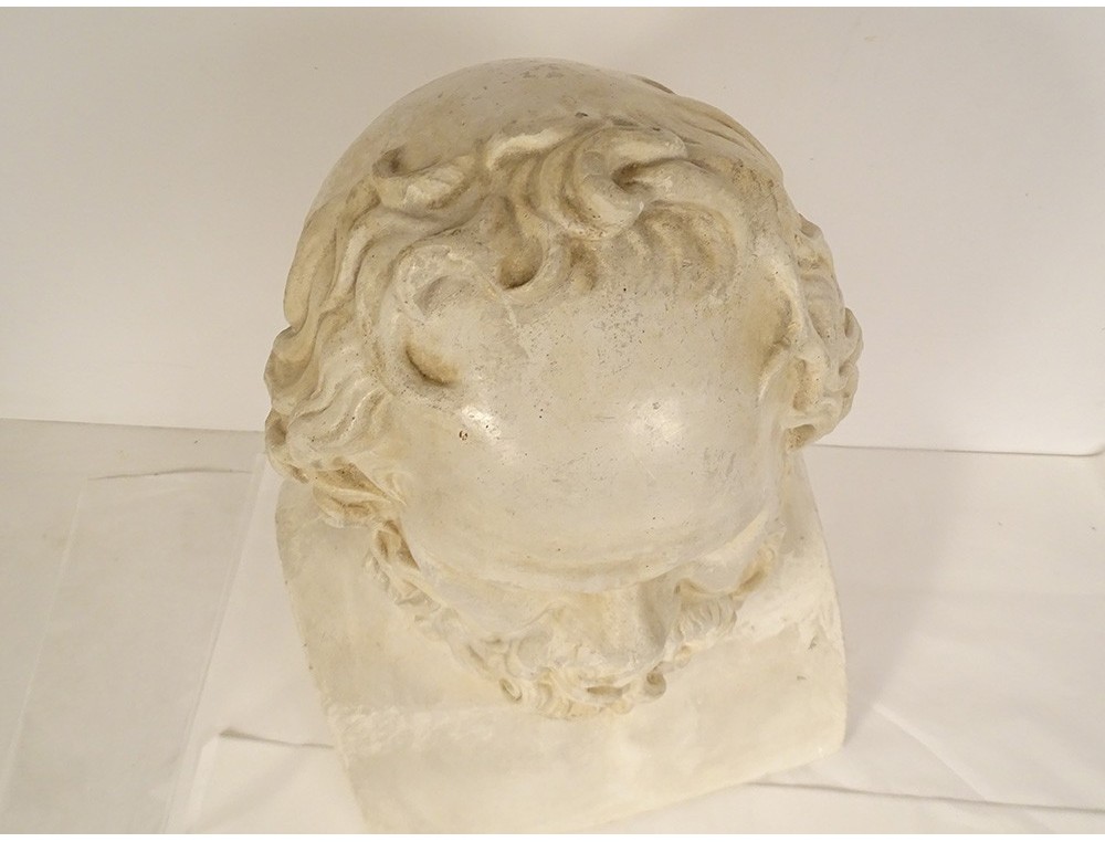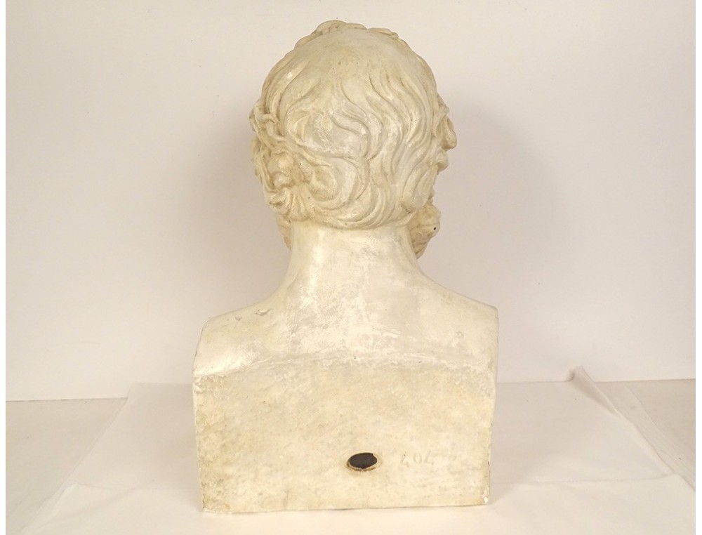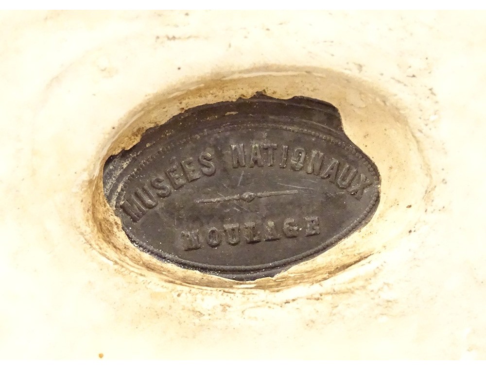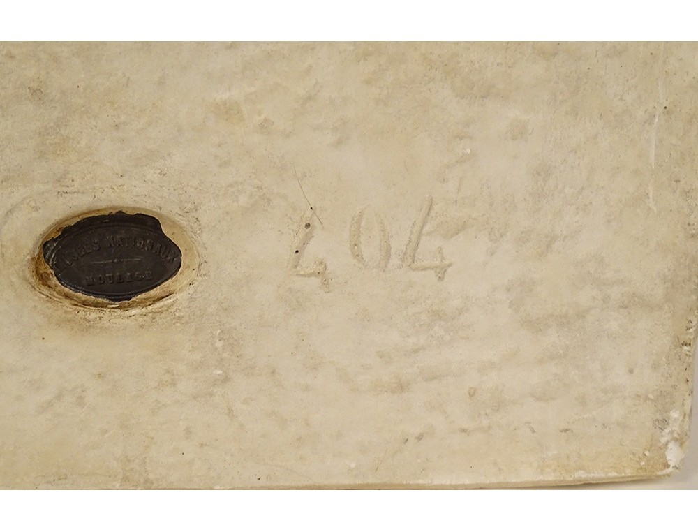 Plaster bust representing the Greek philosopher Socrates, after the original work by Lysippos of Sicyon kept at the Louvre Museum, signed "Musées Nationaux Moulage" number 404, from the early 20th century.